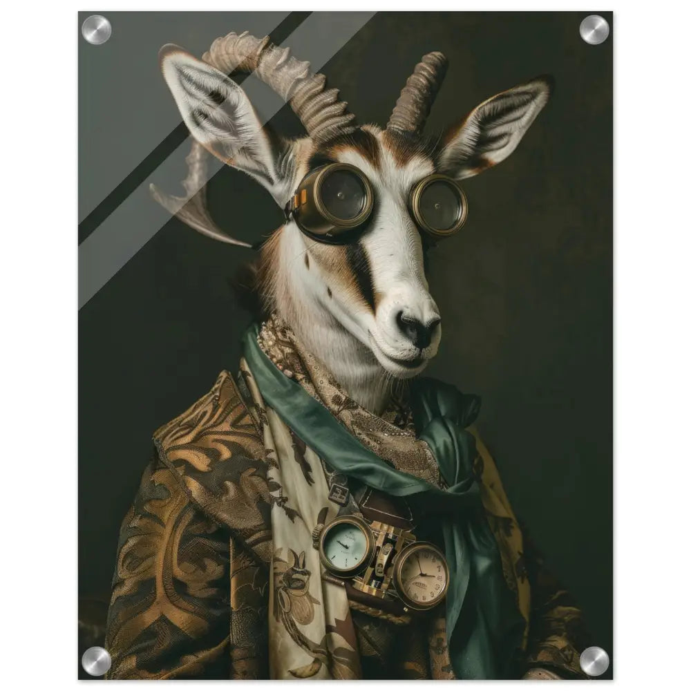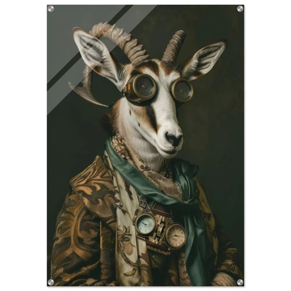 Deze afbeelding toont een dier, gekleed in een prachtige vintage steampunk outfit. Het draagt een sierlijke, olijfkleurige jas met ingewikkelde barokpatronen en subtiele gouden accenten. Om de nek hangt een antieke klok met een bronzen kleur, die de aristocratische uitstraling versterkt. De kop wordt gesierd door een paar grote, retro-futuristische brillen met metalen details in een koperen tint, waardoor deze eruitziet als een avontuurlijke tijdreiziger. De pootjes zijn voorzien van elegante, satijnachtige manchetjes in donkergroen die het geheel afmaken. De afbeelding wordt omringd door een gedempte, donkere achtergrond, die een mysterieuze en tijdloze sfeer oproept.