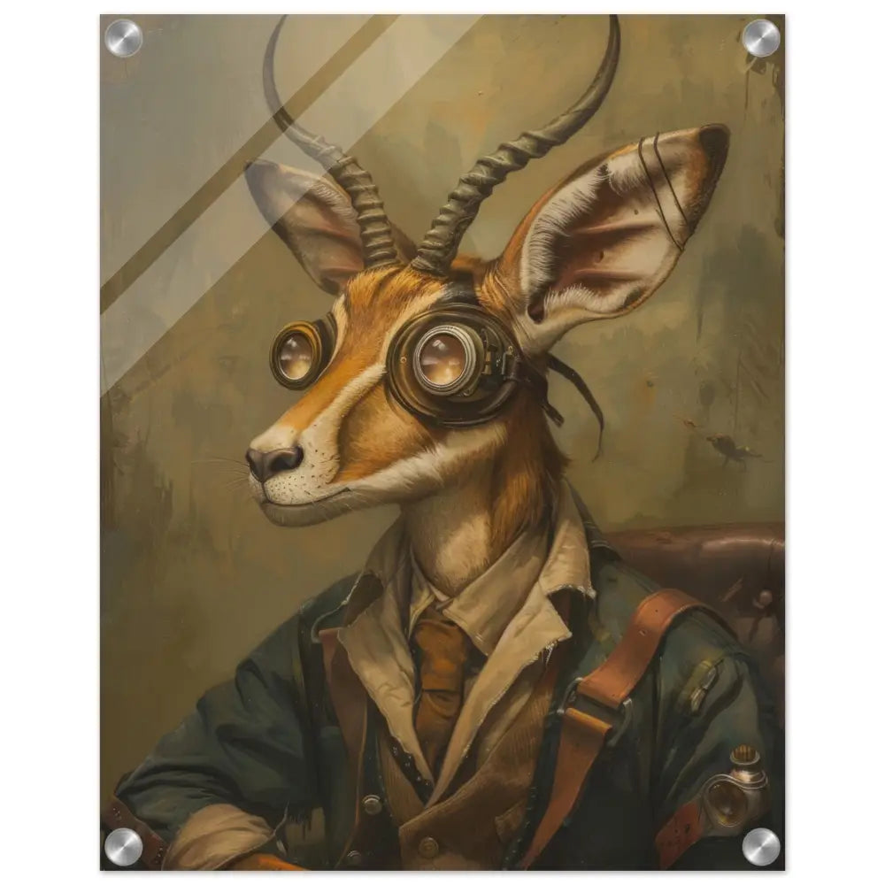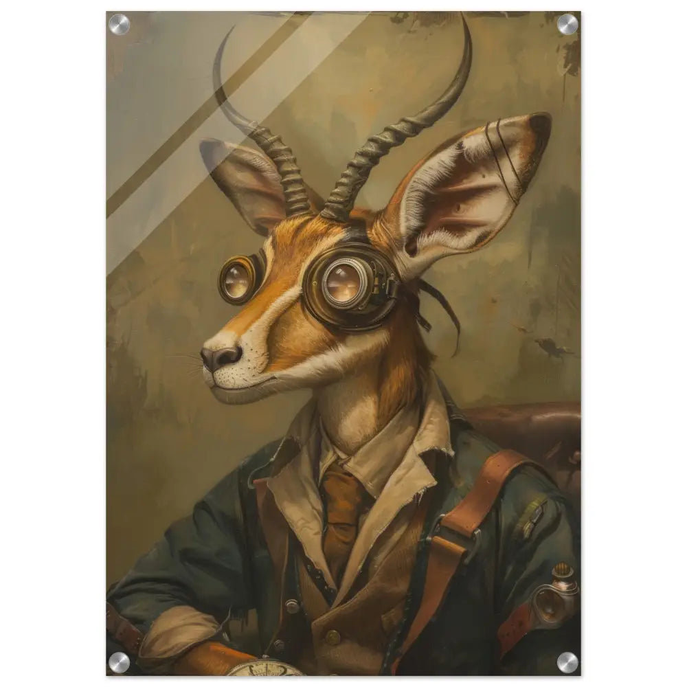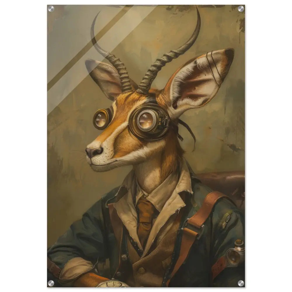 Deze afbeelding toont een dier, gekleed in een prachtige vintage steampunk outfit. Het draagt een stijlvolle, donkergroene jas met subtiele leren accenten en kunstige stiksels. Om de nek hangt een antieke bronzen klok die elegantie en verfijning uitstraalt. De kop wordt gesierd door een paar imposante, bronzen retro-futuristische brillen met gedetailleerde metalen afwerking, wat het dier een mysterieuze en avontuurlijke allure geeft. De imposante hoorns steken fier uit boven de bril en worden verfraaid door subtiele leren bandjes. De achtergrond is rustiek met verweerde tinten en zorgt voor een perfecte aanvulling op de gehele steampunk sfeer.