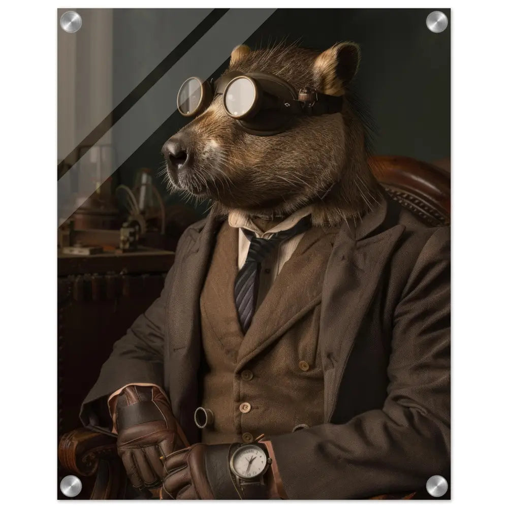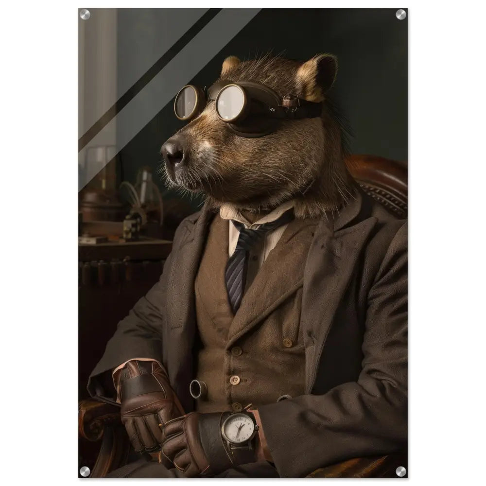 Deze afbeelding toont een dier, gekleed in een prachtige vintage steampunk outfit. Het draagt een elegante, bruin-grijze jas met subtiele patronen en goudkleurige knopen. Om de nek hangt een antieke, zwarte klok die de tijdloze charme van het portret benadrukt. Op het hoofd van het dier rust een paar stevige, zwartmetalen brillen met koperkleurige accenten, wat de steampunk uitstraling versterkt. De pootjes zijn gehuld in stevige leren handschoenen met contrasterende stiksels. De achtergrond toont een klassiek inrichting met donkere houten meubelen en een aantal antieke apparaten, wat de historische sfeer van de afbeelding compleet maakt.