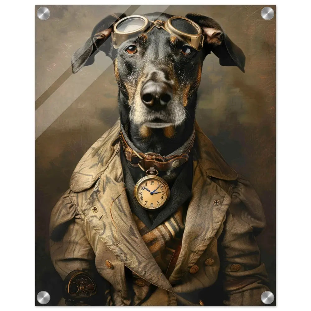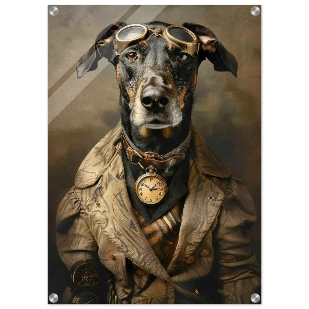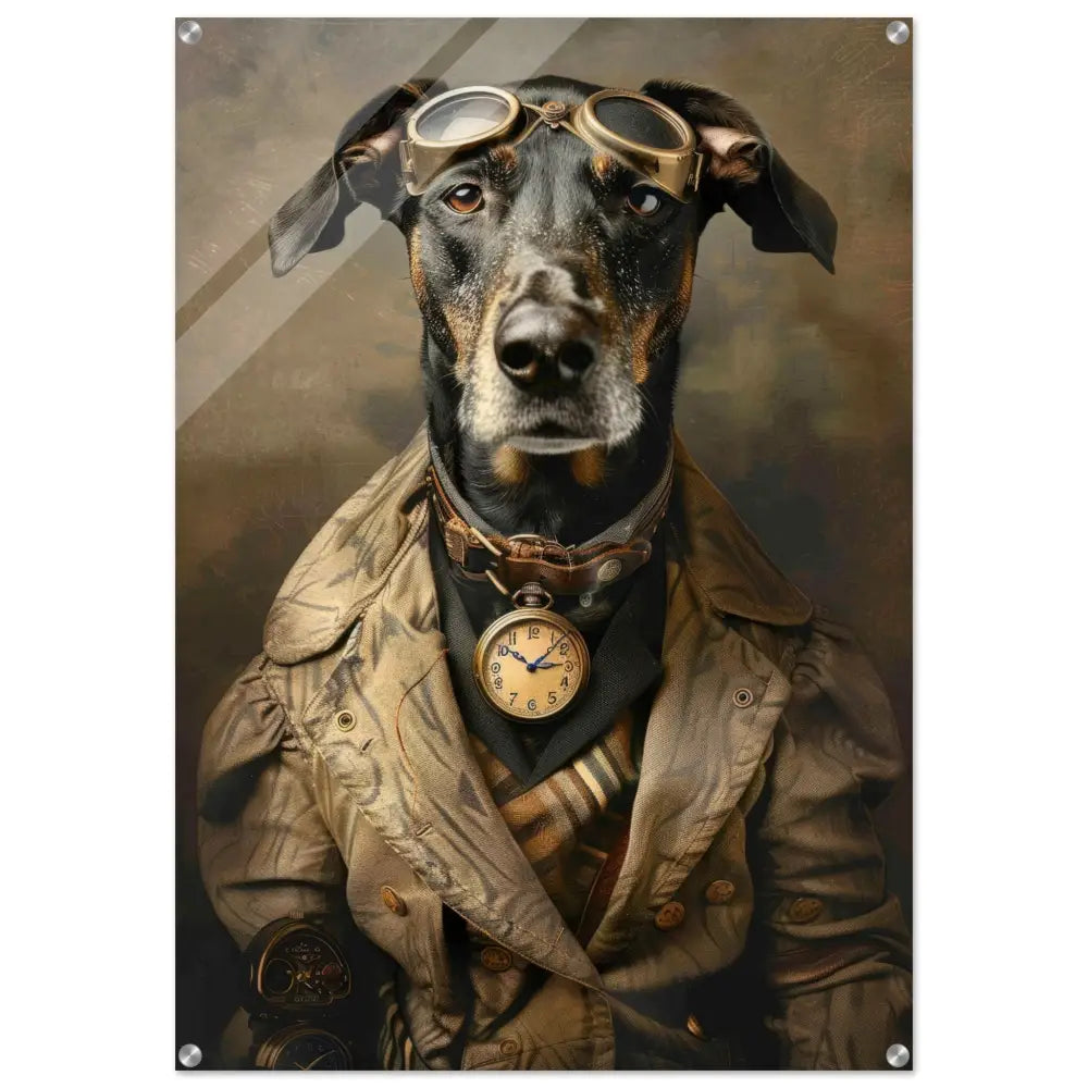 Deze afbeelding toont een dier, gekleed in een prachtige vintage steampunk outfit. Het draagt een elegante, beige jas met gedetailleerde, bruin-blauwe patronen en subtiele accenten. Om de nek van het dier hangt een antieke gouden klok, die de tijdloze charme van het geheel benadrukt. Op het hoofd prijkt een imposante bril met bronzen metalen details, die een gevoel van avontuur en technologie oproept. Bij de voorpoten zijn stilvolle manchetjes van zwart leer te zien, voorzien van contrasterende stiksels. De achtergrond is strak en industrieel, met verweerde tonen die de historische sfeer verder versterken.