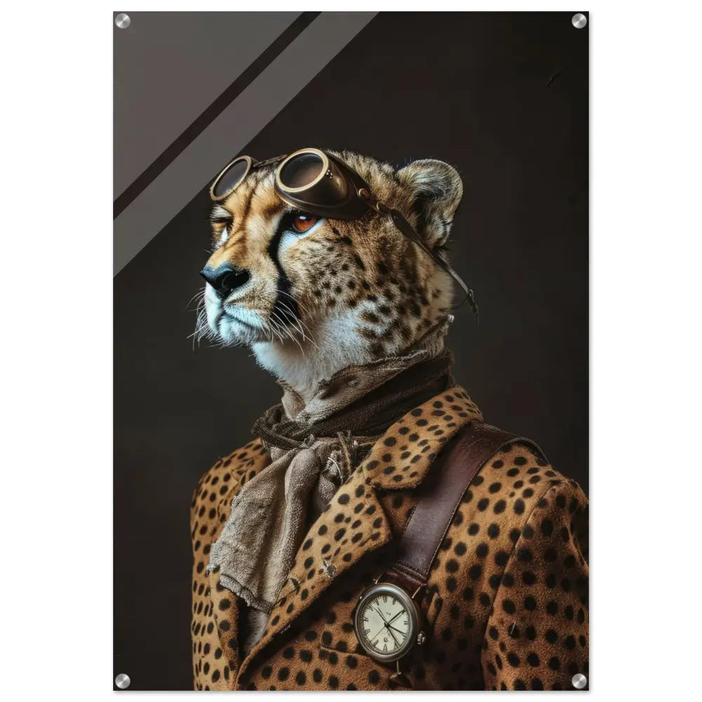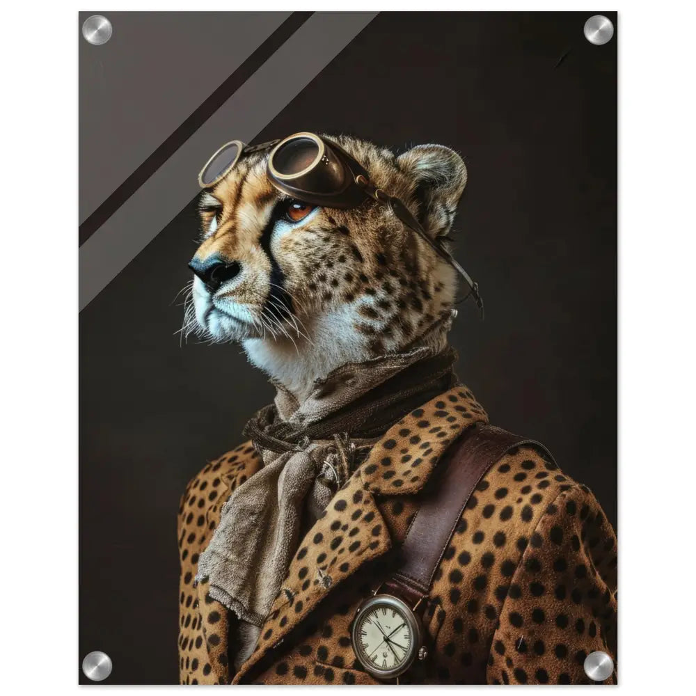 Deze afbeelding toont een dier, gekleed in een prachtige vintage steampunk outfit. Het draagt een stijlvolle, bruingevlekte jas met subtiele vlekken en verfijnde details. Om de nek hangt een antieke gouden klok, wat het geheel een gracieuze uitstraling geeft. De kop wordt gesierd door een paar grote, retro-futuristische brillen met metalen details in bronskleur, waardoor deze eruitziet als een avontuurlijke tijdreiziger. De voetjes en hals zijn verfraaid met delicate, beige sjaalmanchetjes en leren riem, samen met contrasterende stiksels, die de klassieke esthetiek aanvullen. De zwarte achtergrond zorgt voor een elegant en tijdloos effect.