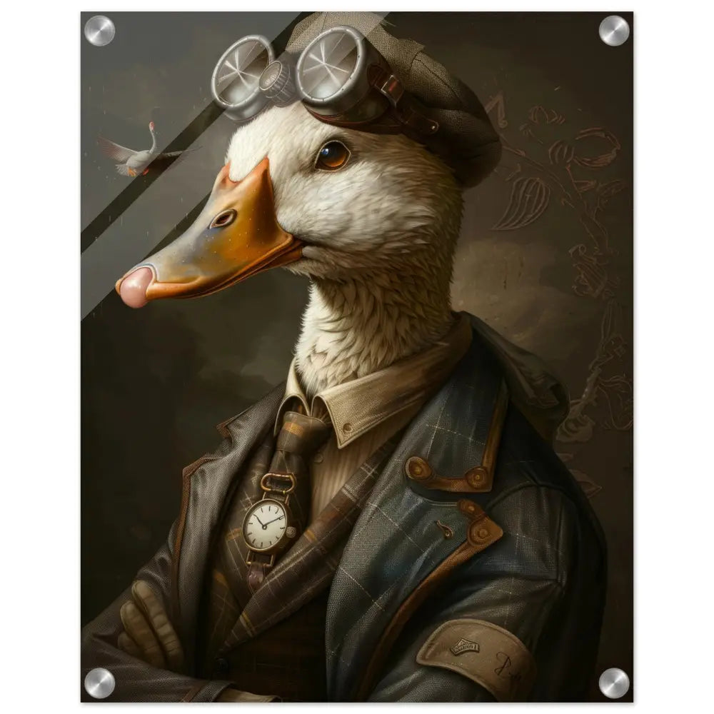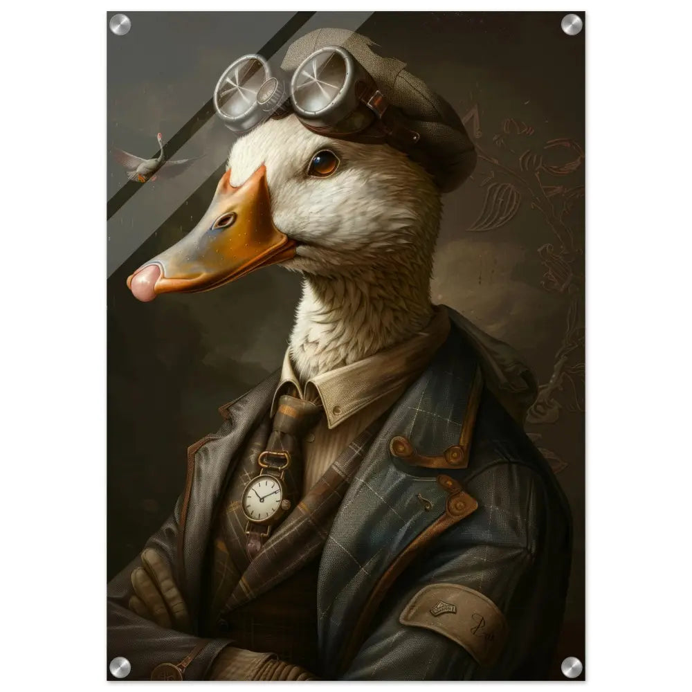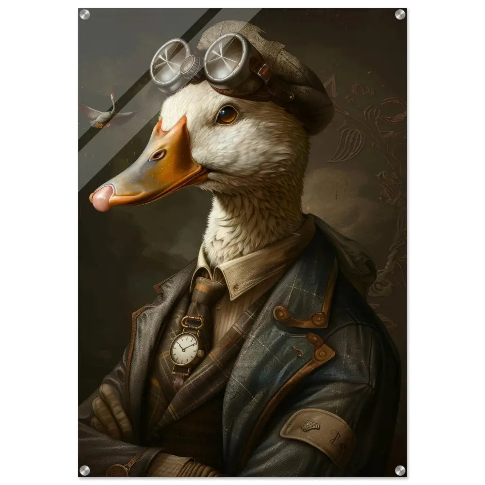 Deze afbeelding toont een dier, gekleed in een prachtige vintage steampunk outfit. Het draagt een gedistingeerde, blauwgrijze jas met subtiele ruitpatronen en bronzen accenten. Om de nek hangt een antieke, gouden klok die een gevoel van nostalgie oproept. De kop wordt gesierd door een paar grote, retro-futuristische brillen met zilverkleurige metalen details, wat het geheel een dromerige en avontuurlijke uitstraling geeft. De vleugels zijn gestoken in verfijnde, leren manchetjes en de achtergrond toont een gedetailleerde, donkere wand met krijtachtige tekeningen en sierlijke lijnen, wat bijdraagt aan de mystieke sfeer van het portret.