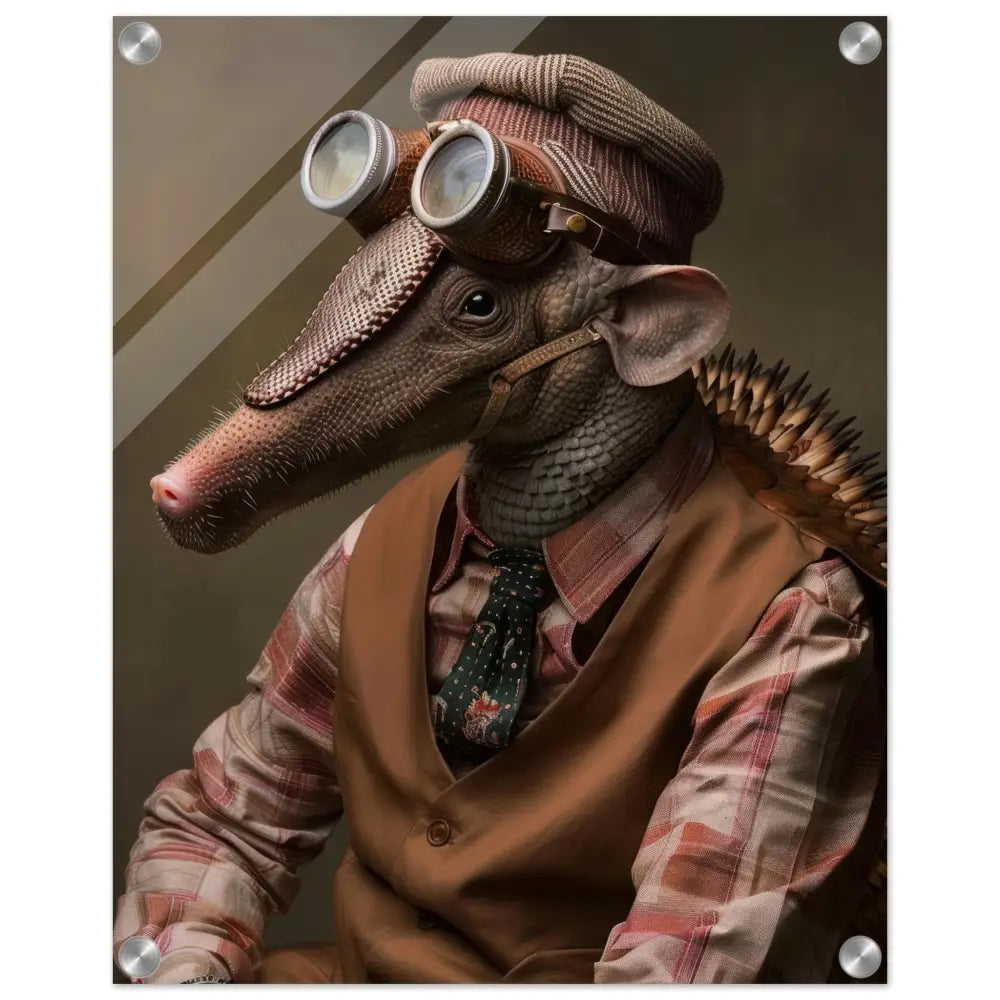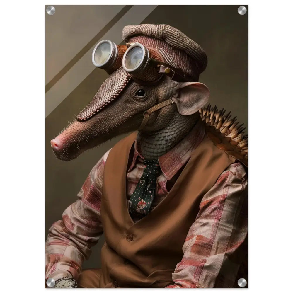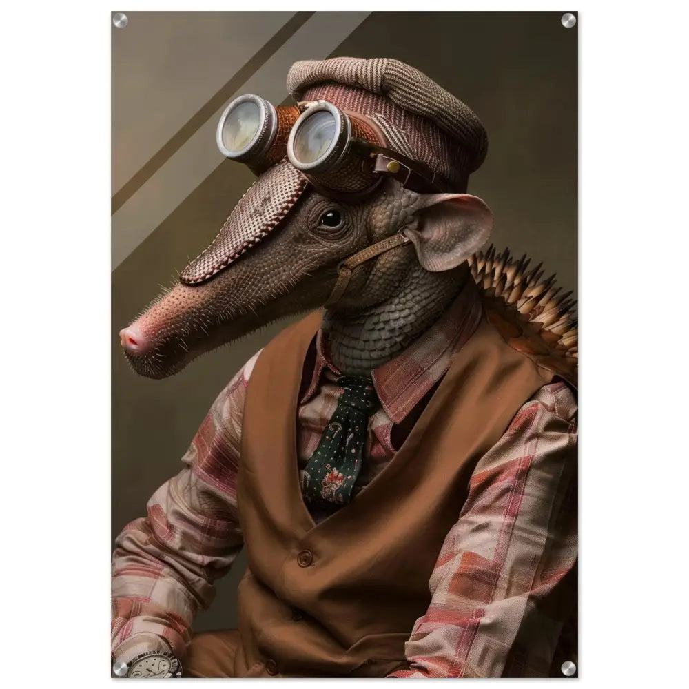 Deze afbeelding toont een dier, gekleed in een prachtige vintage steampunk outfit. Het draagt een elegante, bruinoranje vest met een patroon van ruitjes en subtiele hints van donkere roodtinten op de mouwen. Om de nek hangt een zilveren antieke klok, versterkend de klassieke uitstraling. De kop wordt geaccentueerd door een grote, retro-futuristische bril met bronzen metalen details en dikke, heldere lenzen, die het historische en futuristische combineren. De look wordt vervolledigd met een platte pet en een speelse donkerblauwe stropdas met bloemrijke patronen. De achtergrond is eenvoudig en bruin, wat de nadruk legt op de gedetailleerde steampunk-kleding van het dier.