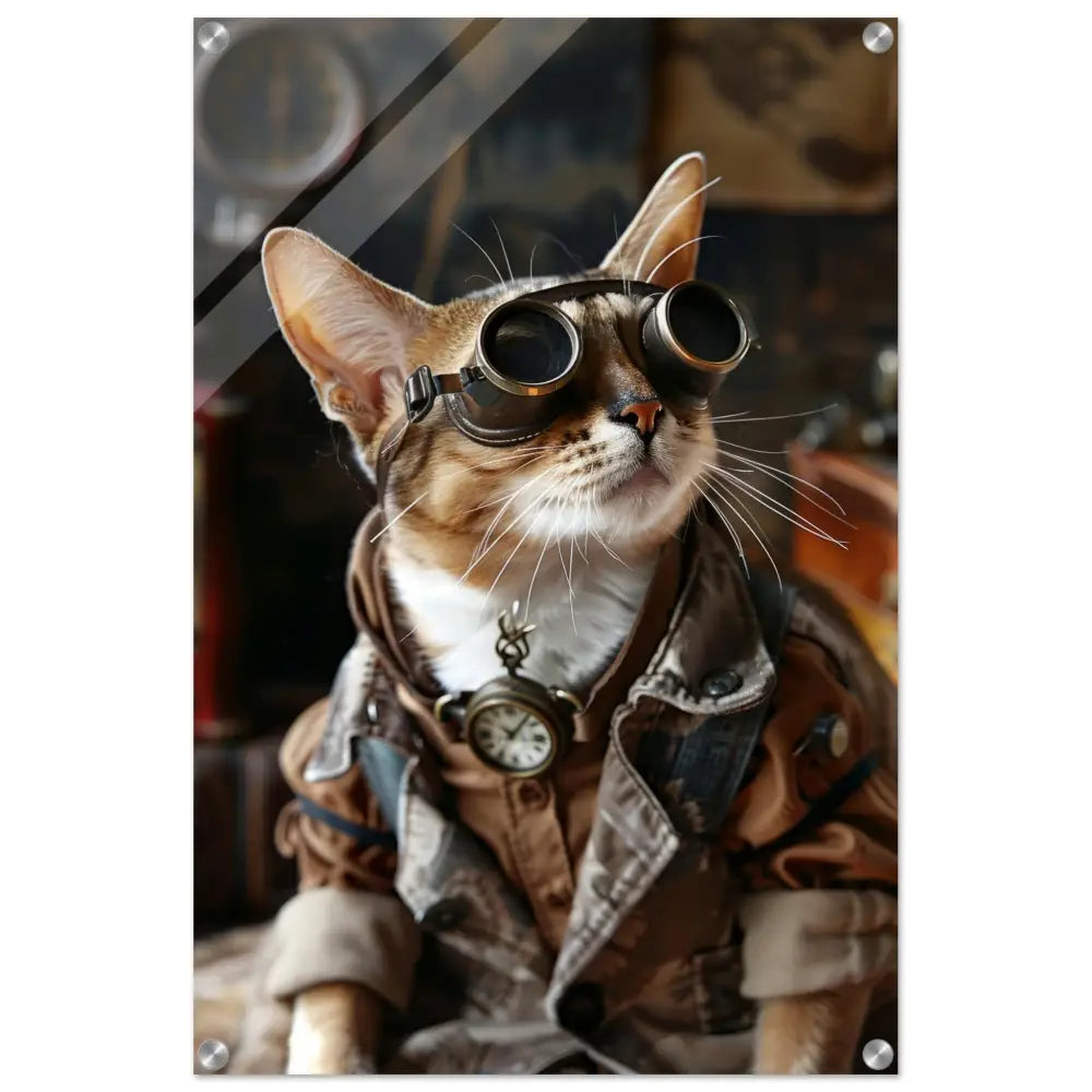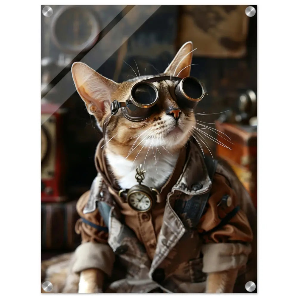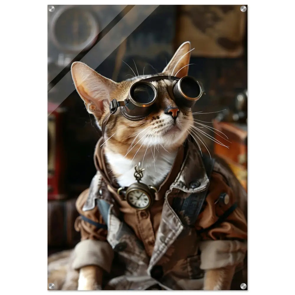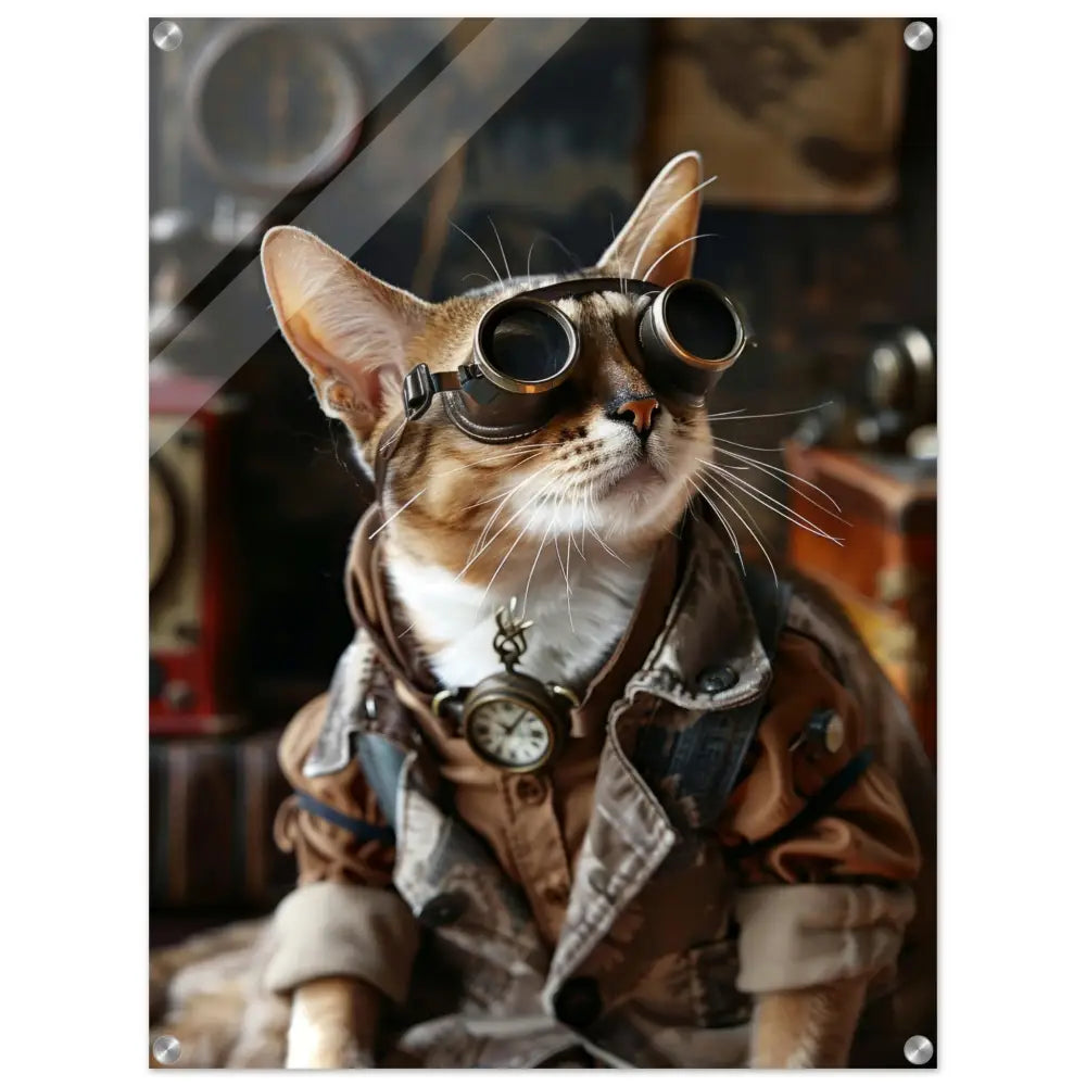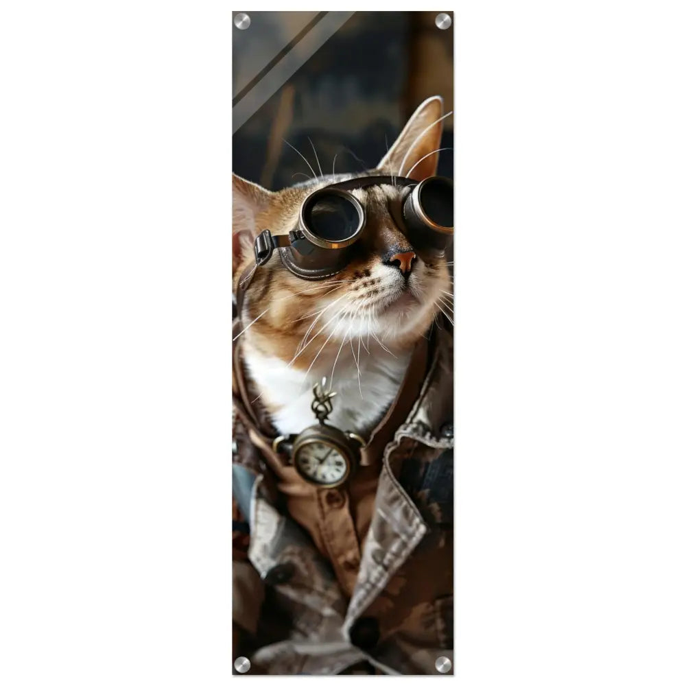 Dit schilderij toont een kat, gekleed in een prachtige vintage steampunk outfit. De kat draagt een sierlijke, bruin-beige jas met fijnzinnige patronen en koperen accenten. Om de nek van de kat hangt een antiek ogende klok, verfijnd in een verschoten bronskleur. Op het hoofd van de kat prijkt een robuuste bril met metalen details in een sombere, bronzen tint, wat haar opmerkelijk avontuurlijk doet lijken. De outfit wordt gecompleteerd door elegante, beige bontachtige manchetjes, stoere leren accenten en contrasterende stiksels. De achtergrond is donker en industrieel, wat de steampunk sfeer perfect benadrukt.