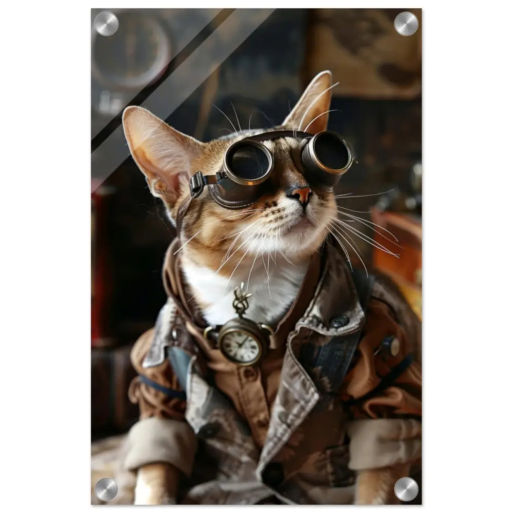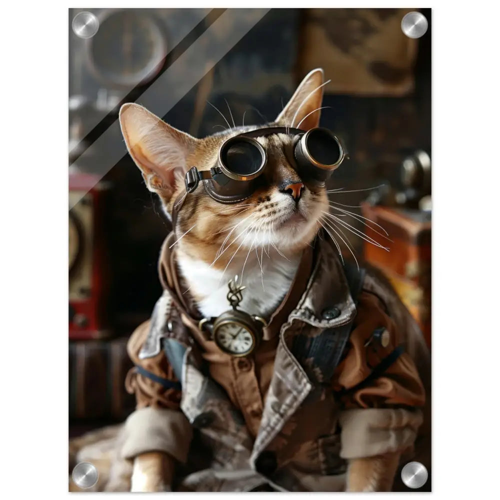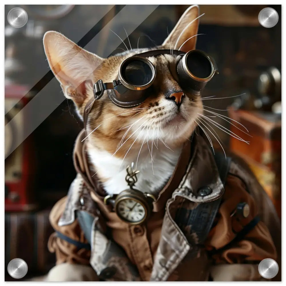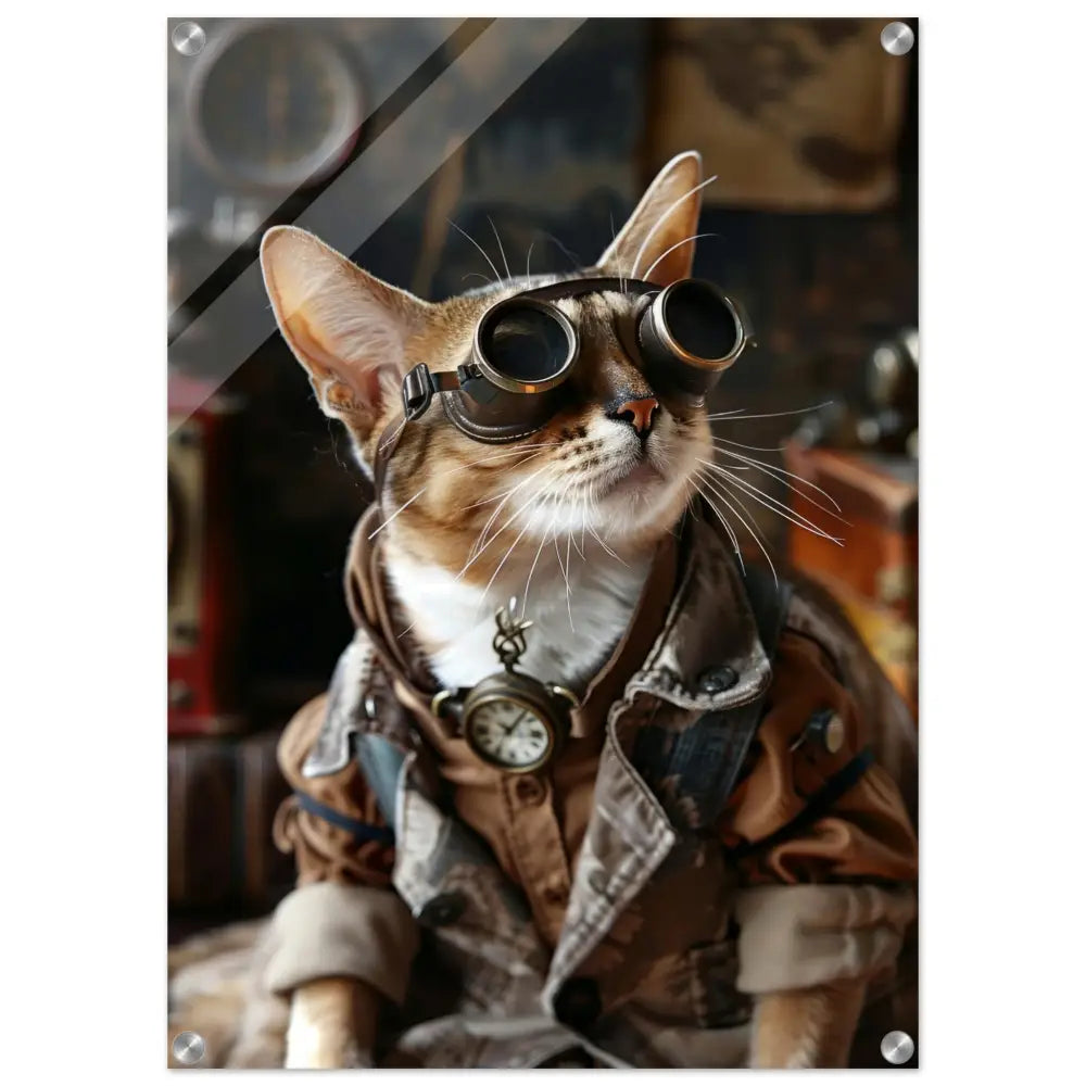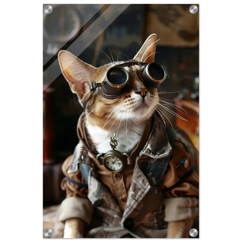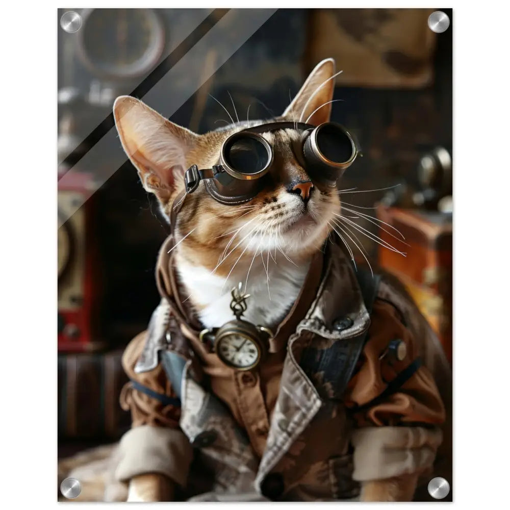 Dit schilderij toont een kat, gekleed in een prachtige vintage steampunk outfit. De kat draagt een sierlijke, bruin-beige jas met fijnzinnige patronen en koperen accenten. Om de nek van de kat hangt een antiek ogende klok, verfijnd in een verschoten bronskleur. Op het hoofd van de kat prijkt een robuuste bril met metalen details in een sombere, bronzen tint, wat haar opmerkelijk avontuurlijk doet lijken. De outfit wordt gecompleteerd door elegante, beige bontachtige manchetjes, stoere leren accenten en contrasterende stiksels. De achtergrond is donker en industrieel, wat de steampunk sfeer perfect benadrukt.