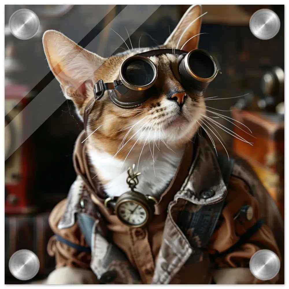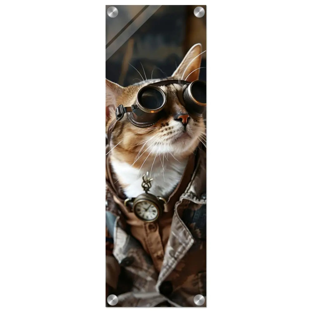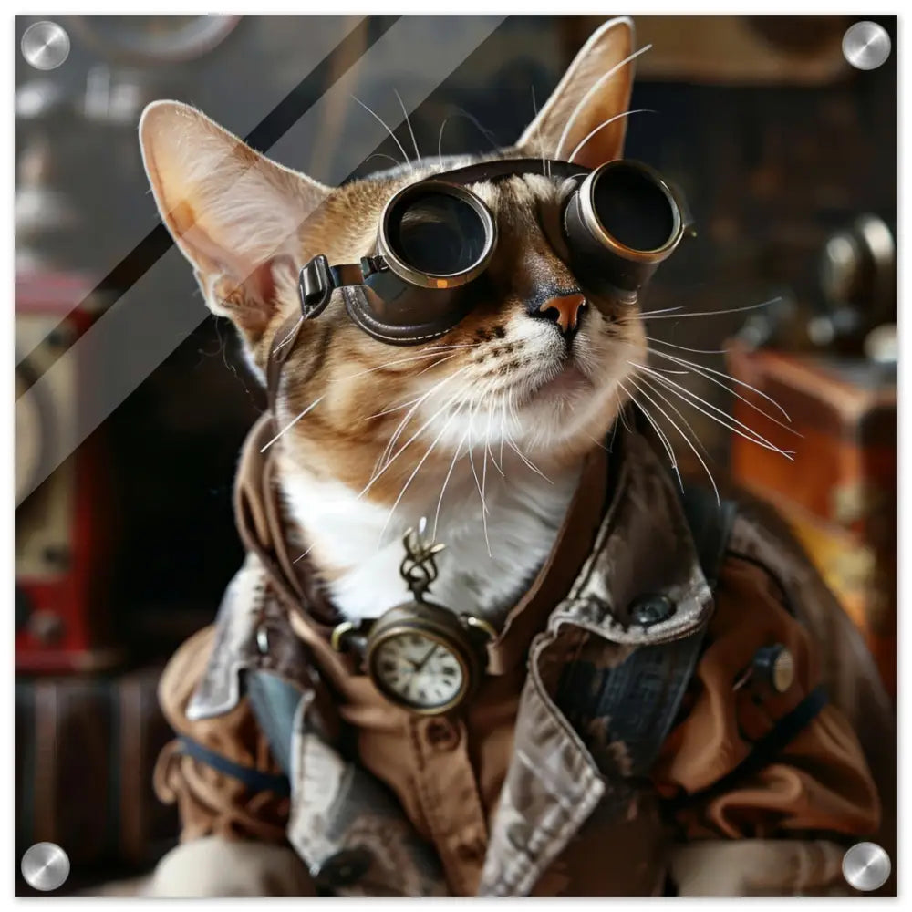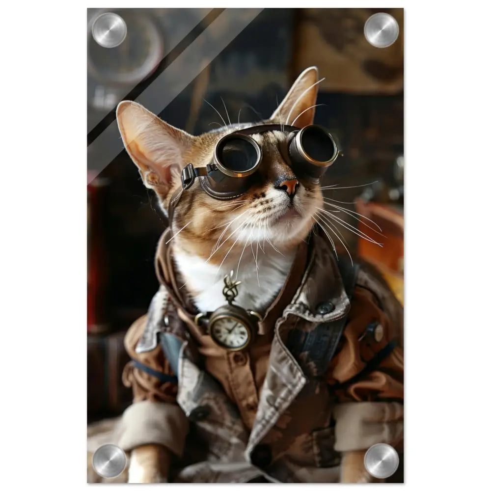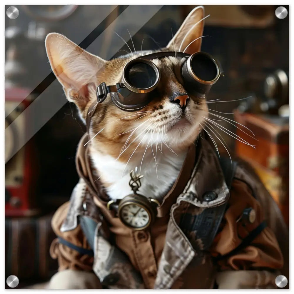 Dit schilderij toont een kat, gekleed in een prachtige vintage steampunk outfit. De kat draagt een sierlijke, bruin-beige jas met fijnzinnige patronen en koperen accenten. Om de nek van de kat hangt een antiek ogende klok, verfijnd in een verschoten bronskleur. Op het hoofd van de kat prijkt een robuuste bril met metalen details in een sombere, bronzen tint, wat haar opmerkelijk avontuurlijk doet lijken. De outfit wordt gecompleteerd door elegante, beige bontachtige manchetjes, stoere leren accenten en contrasterende stiksels. De achtergrond is donker en industrieel, wat de steampunk sfeer perfect benadrukt.
