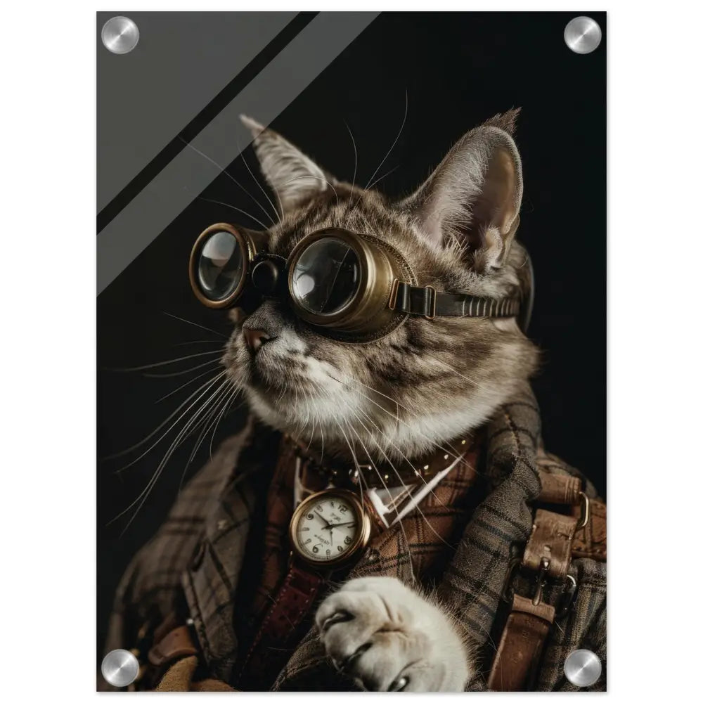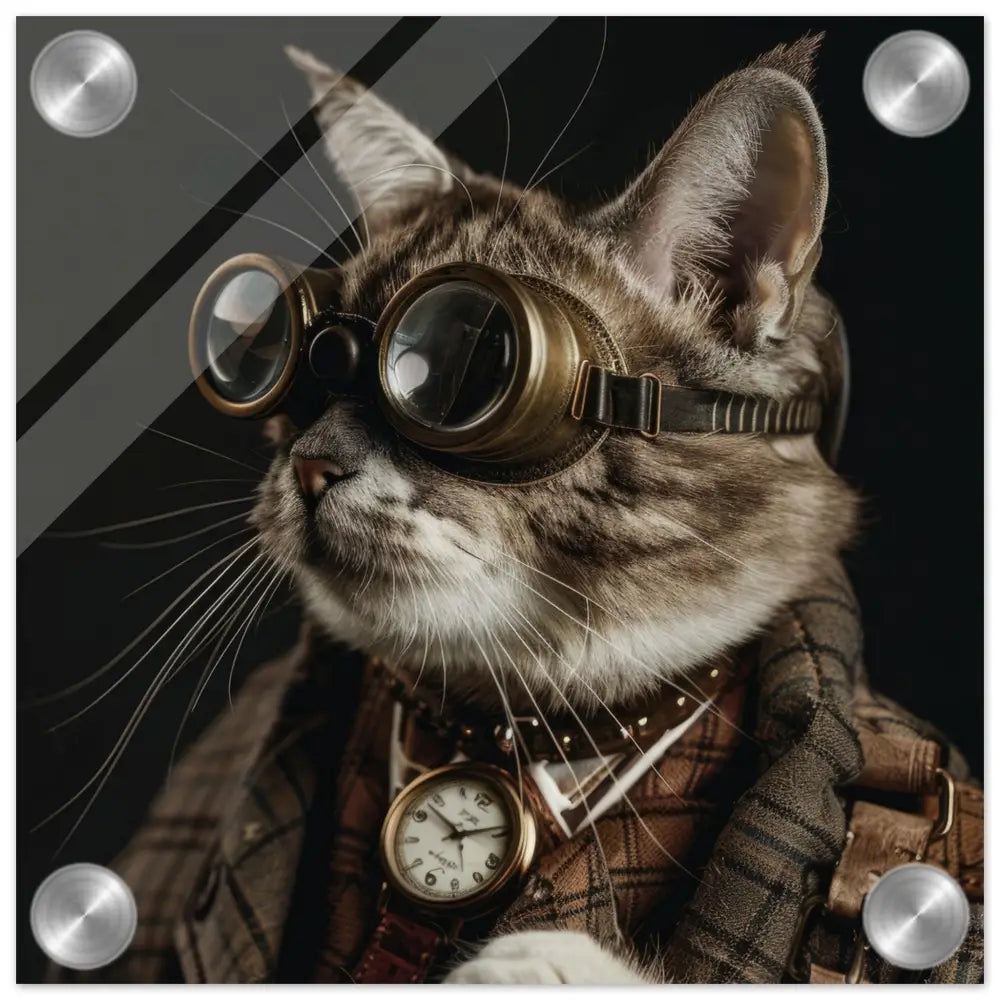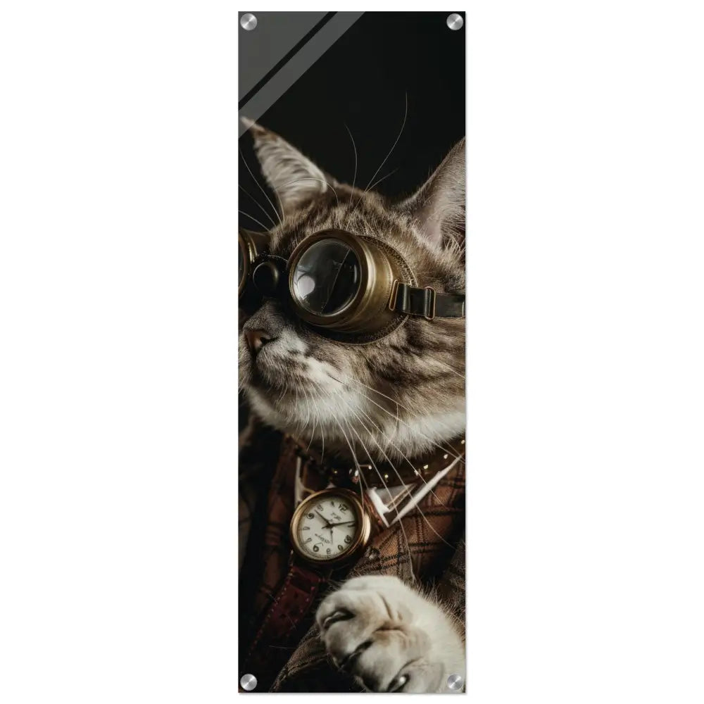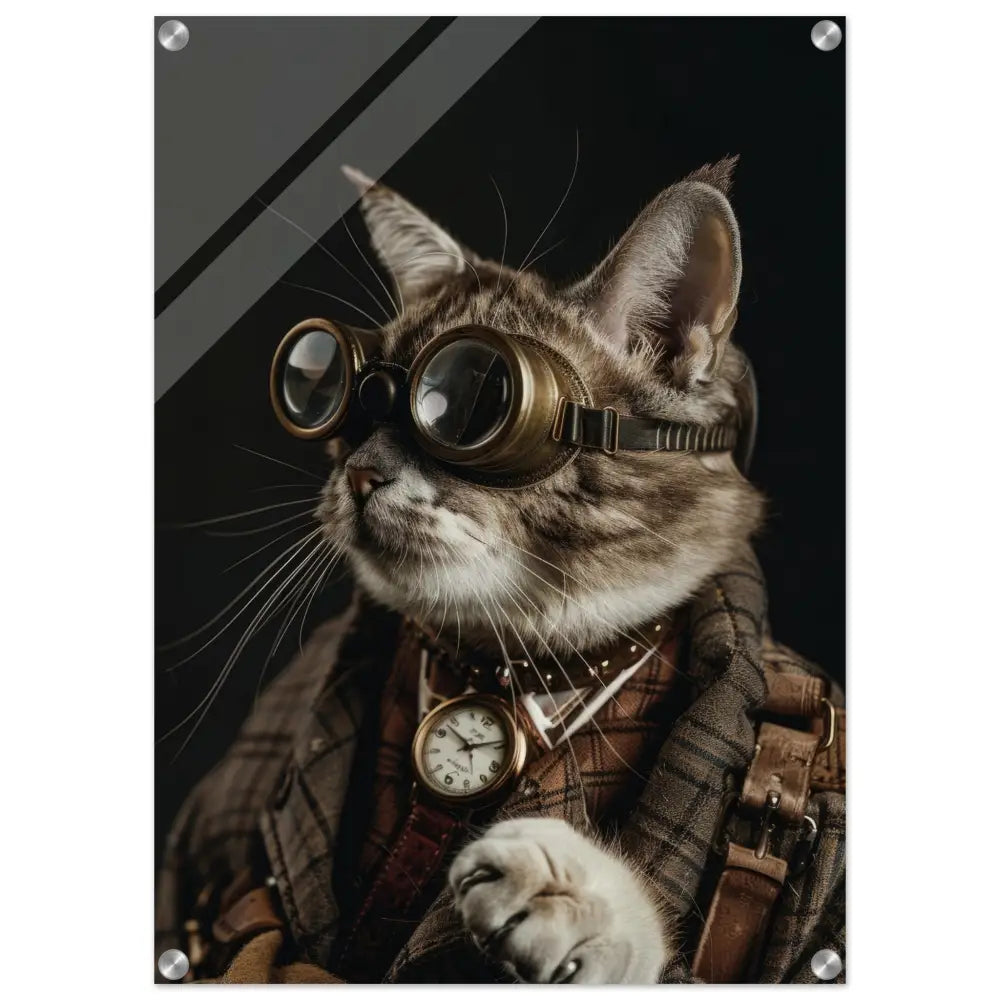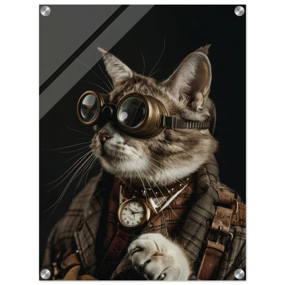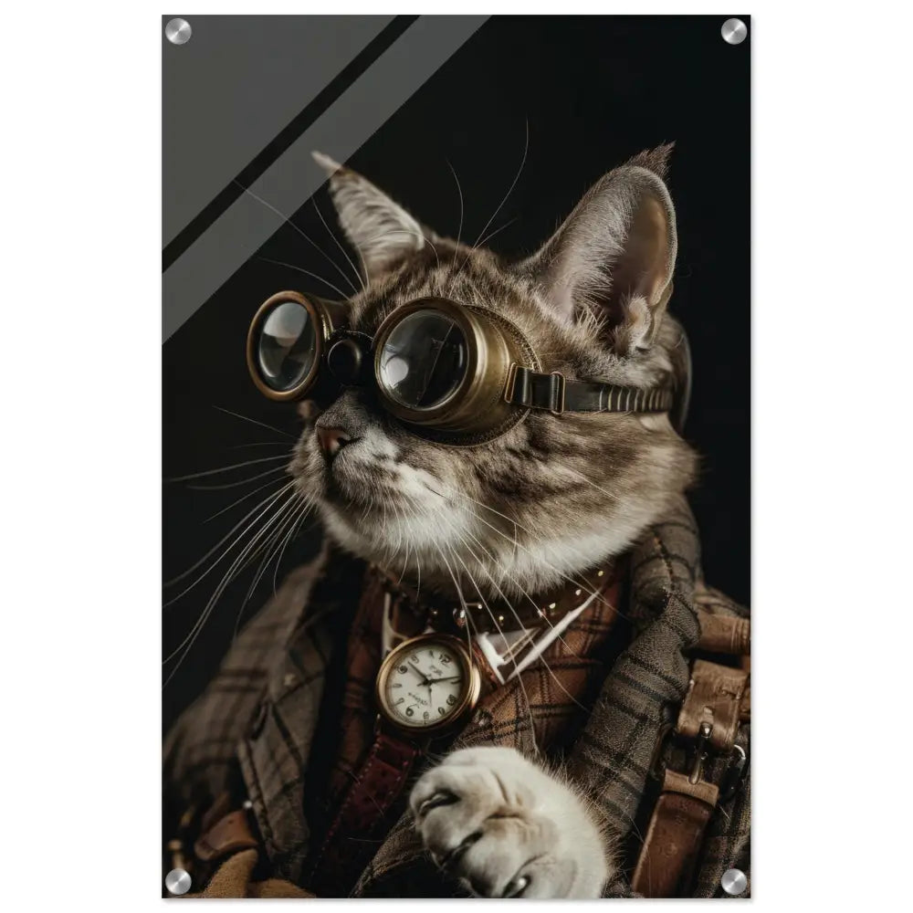 Dit schilderij toont een kat, gekleed in een prachtige vintage steampunk outfit. De kat draagt een elegant geruite jas in aardetinten, versterkt met leren accenten en contrasterende stiksels. Om haar nek hangt een antieke gouden klok die haar aristocratische uitstraling versterkt. Op haar hoofd rust een paar grote, bronzen retro-futuristische brillen met gedetailleerde metalen afwerkingen, waardoor ze eruitziet als een avontuurlijke tijdreiziger. Haar pootjes zijn voorzien van stijlvol, grijsachtige bontachtige manchetjes die het geheel afmaken. De achtergrond is donker, wat de focus op de prachtig uitgedoste kat legt en haar complexe steampunk details benadrukt.