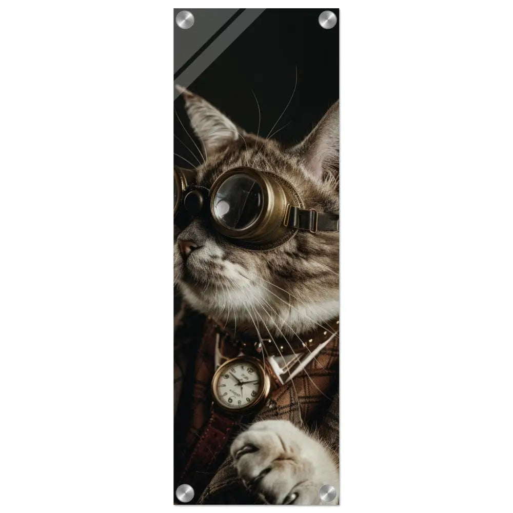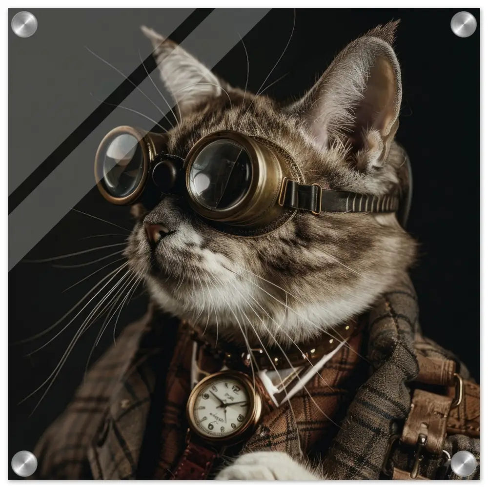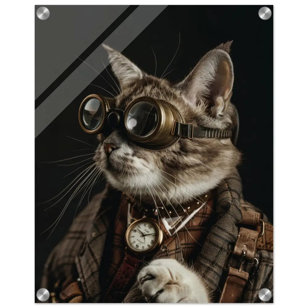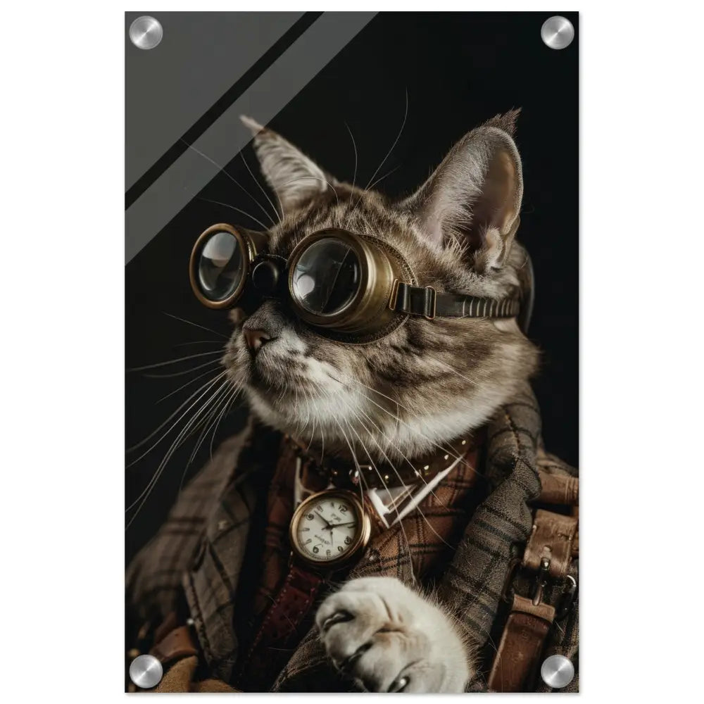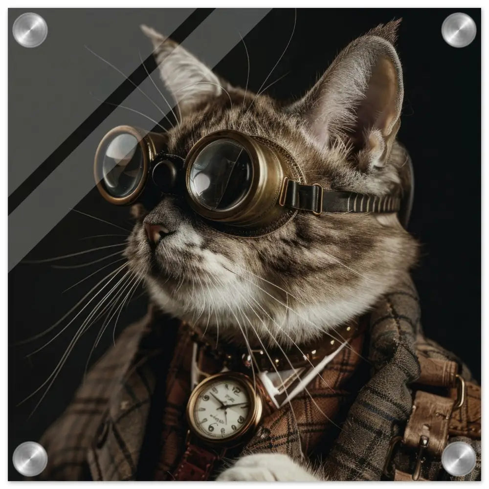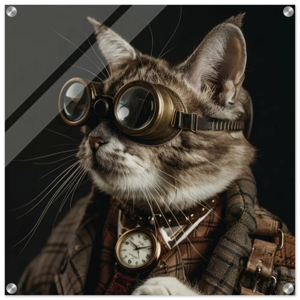 Dit schilderij toont een kat, gekleed in een prachtige vintage steampunk outfit. De kat draagt een elegant geruite jas in aardetinten, versterkt met leren accenten en contrasterende stiksels. Om haar nek hangt een antieke gouden klok die haar aristocratische uitstraling versterkt. Op haar hoofd rust een paar grote, bronzen retro-futuristische brillen met gedetailleerde metalen afwerkingen, waardoor ze eruitziet als een avontuurlijke tijdreiziger. Haar pootjes zijn voorzien van stijlvol, grijsachtige bontachtige manchetjes die het geheel afmaken. De achtergrond is donker, wat de focus op de prachtig uitgedoste kat legt en haar complexe steampunk details benadrukt.