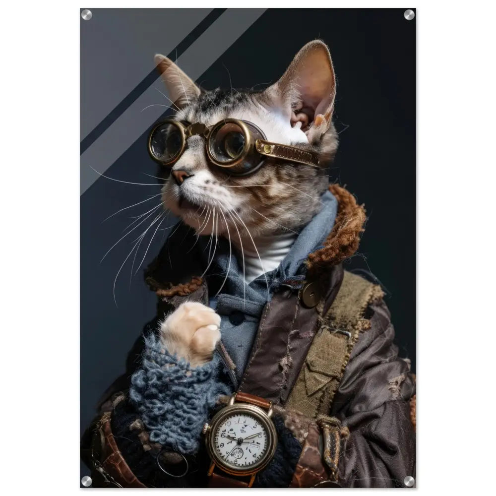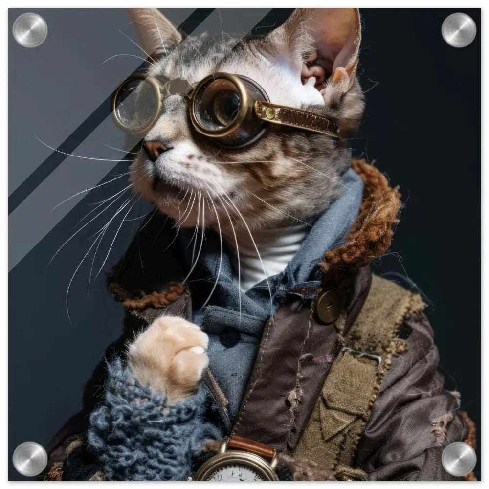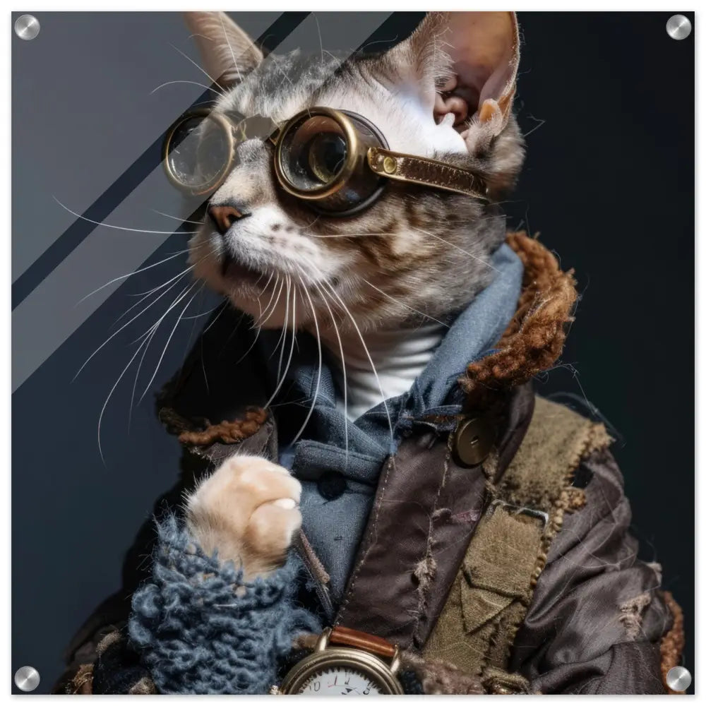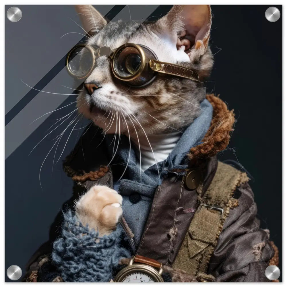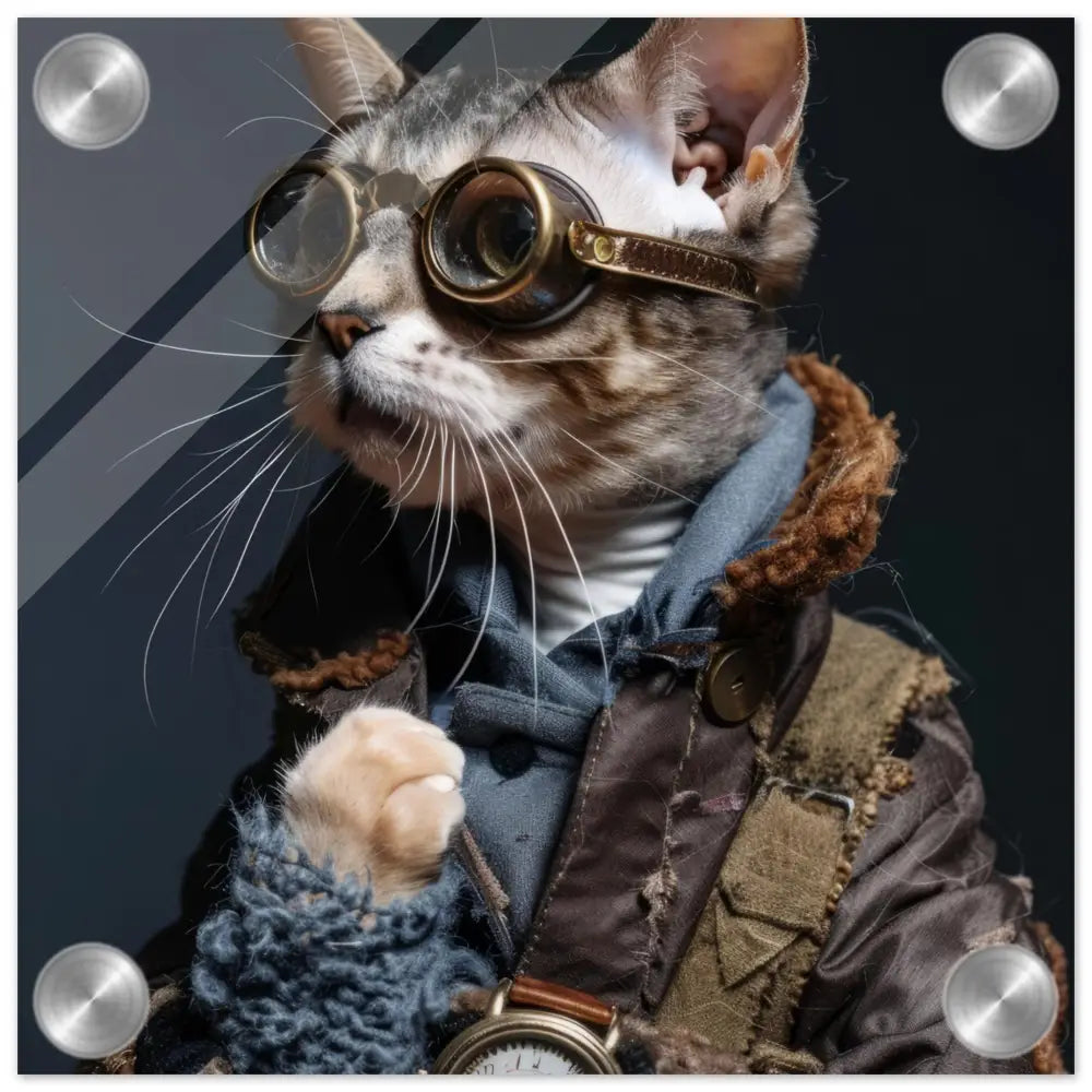 Dit schilderij toont een kat, gekleed in een prachtige vintage steampunk outfit. Hij draagt een stijlvolle, bruine leren jas met delicate patches en verweerde accenten. Om zijn nek hangt een antieke gouden klok, die goed contrasteert met de warme kleurtinten van zijn kleding. Op zijn kop prijken grote, bronskleurige retro-futuristische brillen met ingewikkelde metalen details. Zijn poten zijn voorzien van blauwe, bontachtige manchetjes die het geheel extra elegant maken. De achtergrond is donker en neutraal, wat de aandacht extra vestigt op de gedetailleerde steampunk kleding van de kat.