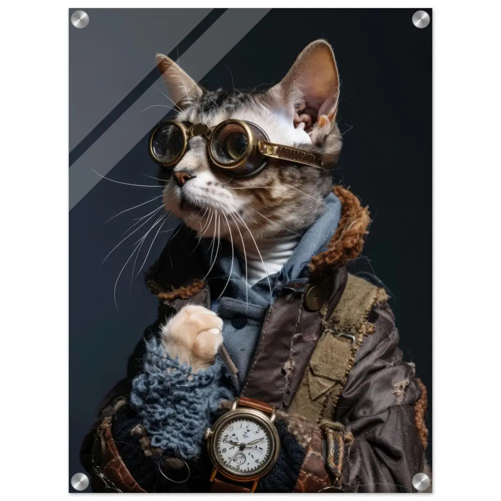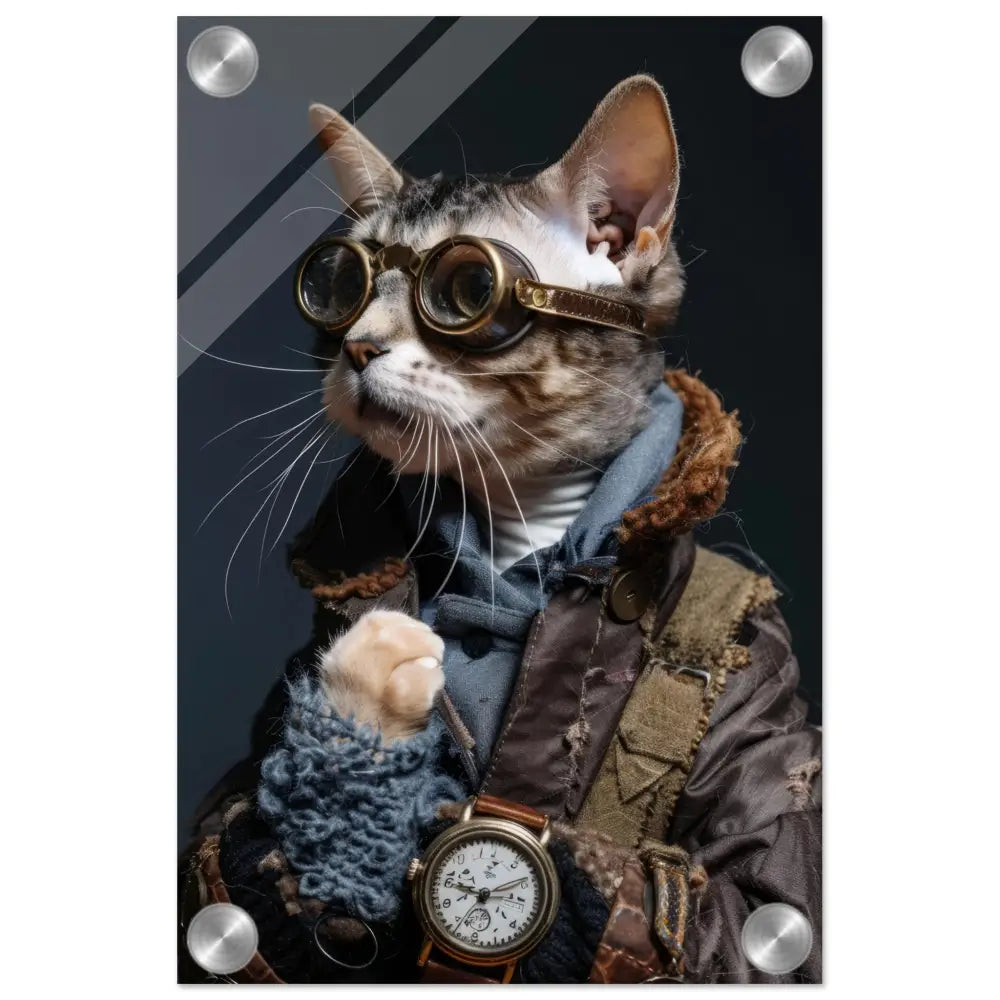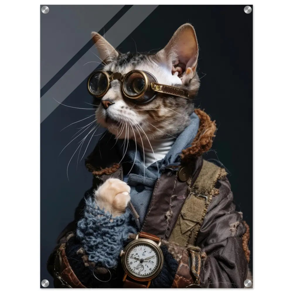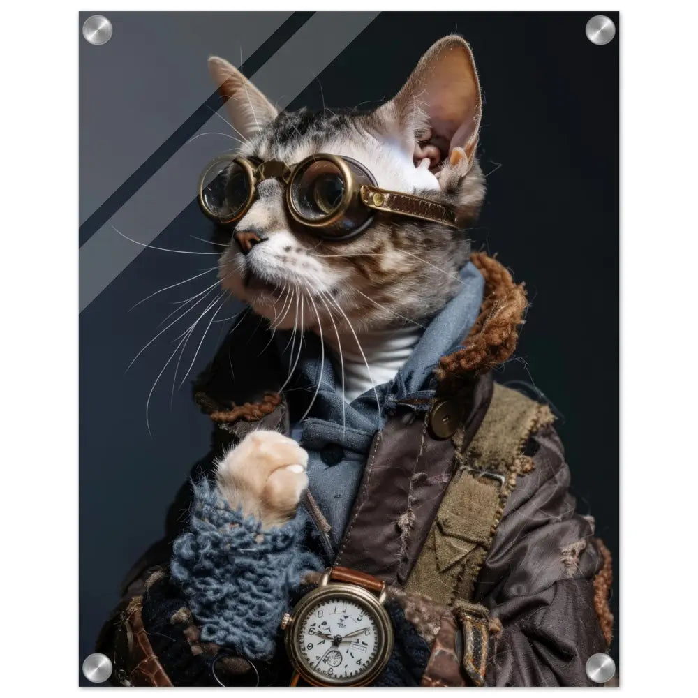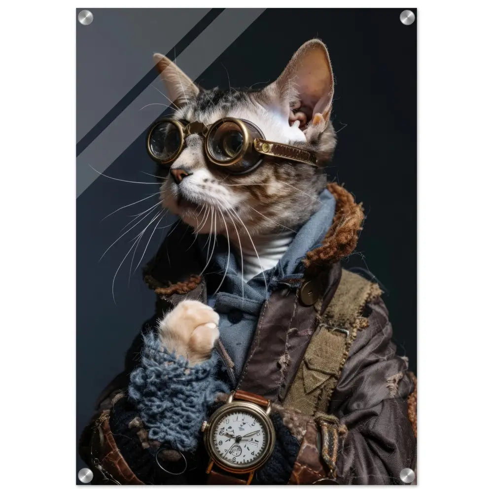 Dit schilderij toont een kat, gekleed in een prachtige vintage steampunk outfit. Hij draagt een stijlvolle, bruine leren jas met delicate patches en verweerde accenten. Om zijn nek hangt een antieke gouden klok, die goed contrasteert met de warme kleurtinten van zijn kleding. Op zijn kop prijken grote, bronskleurige retro-futuristische brillen met ingewikkelde metalen details. Zijn poten zijn voorzien van blauwe, bontachtige manchetjes die het geheel extra elegant maken. De achtergrond is donker en neutraal, wat de aandacht extra vestigt op de gedetailleerde steampunk kleding van de kat.