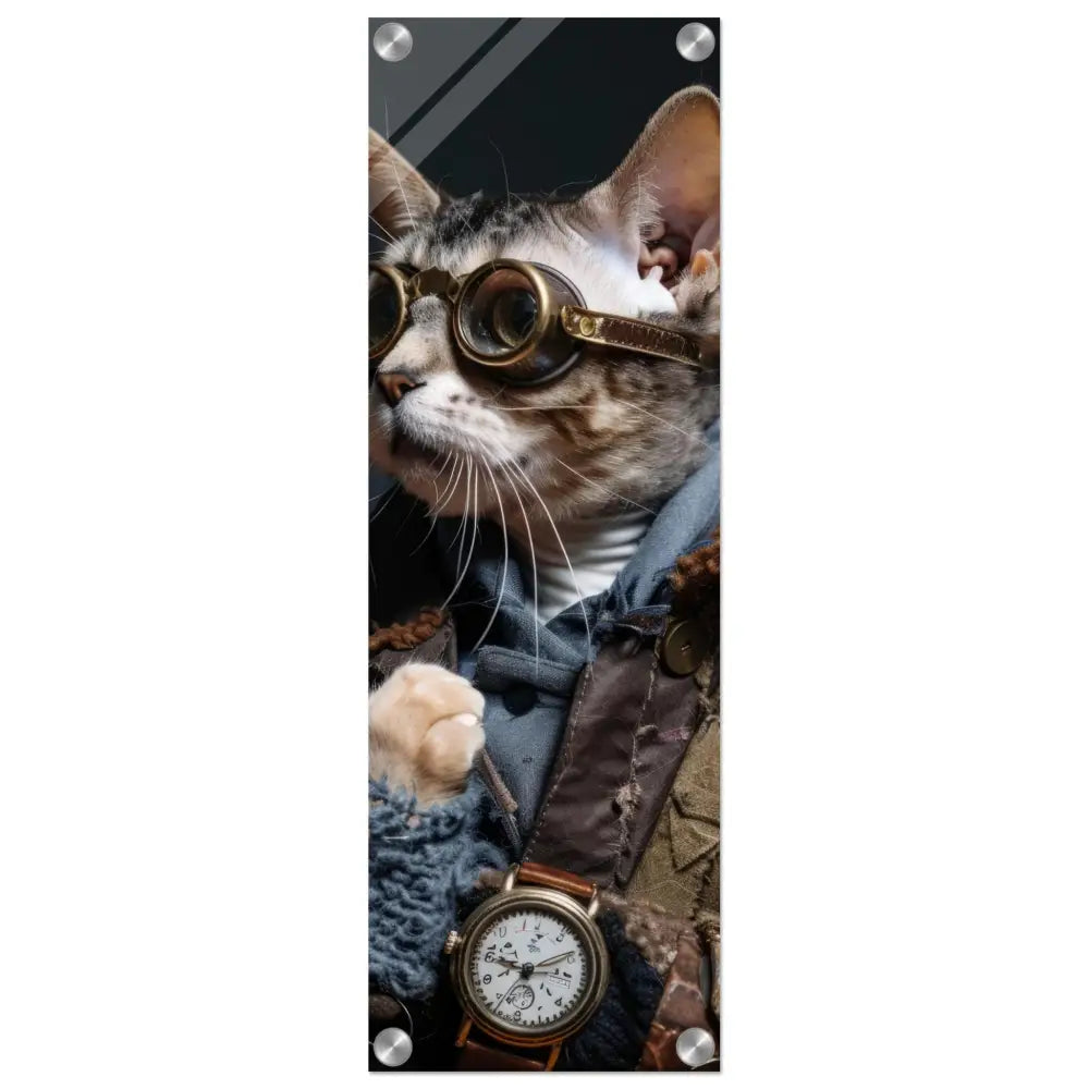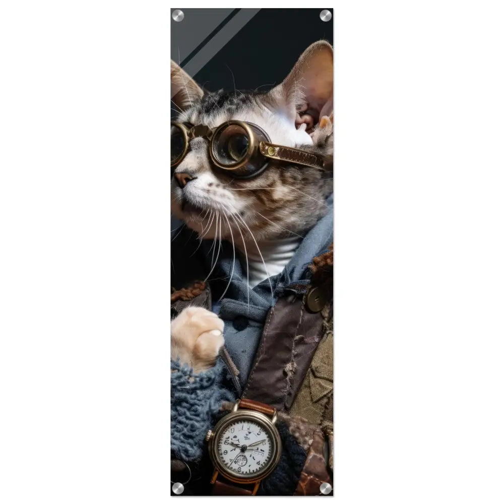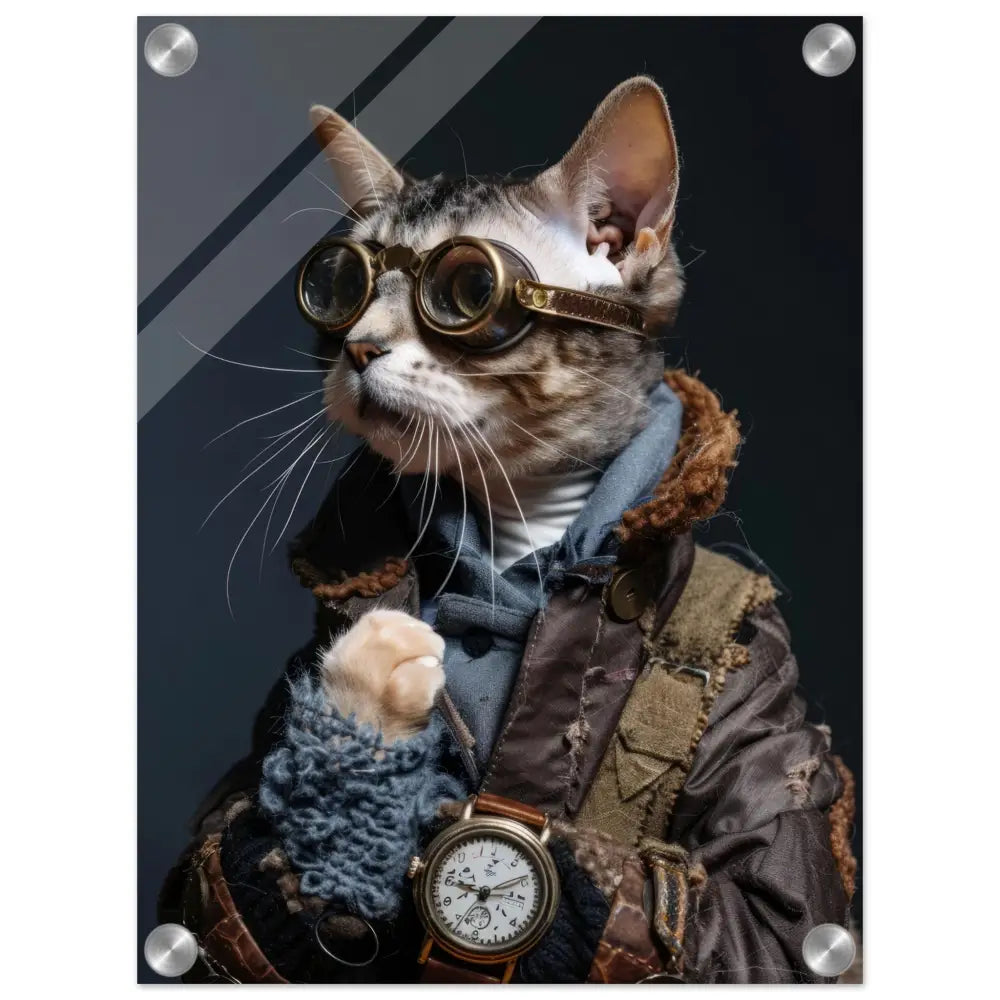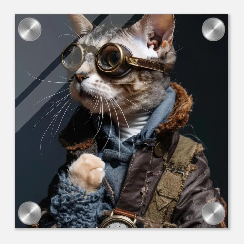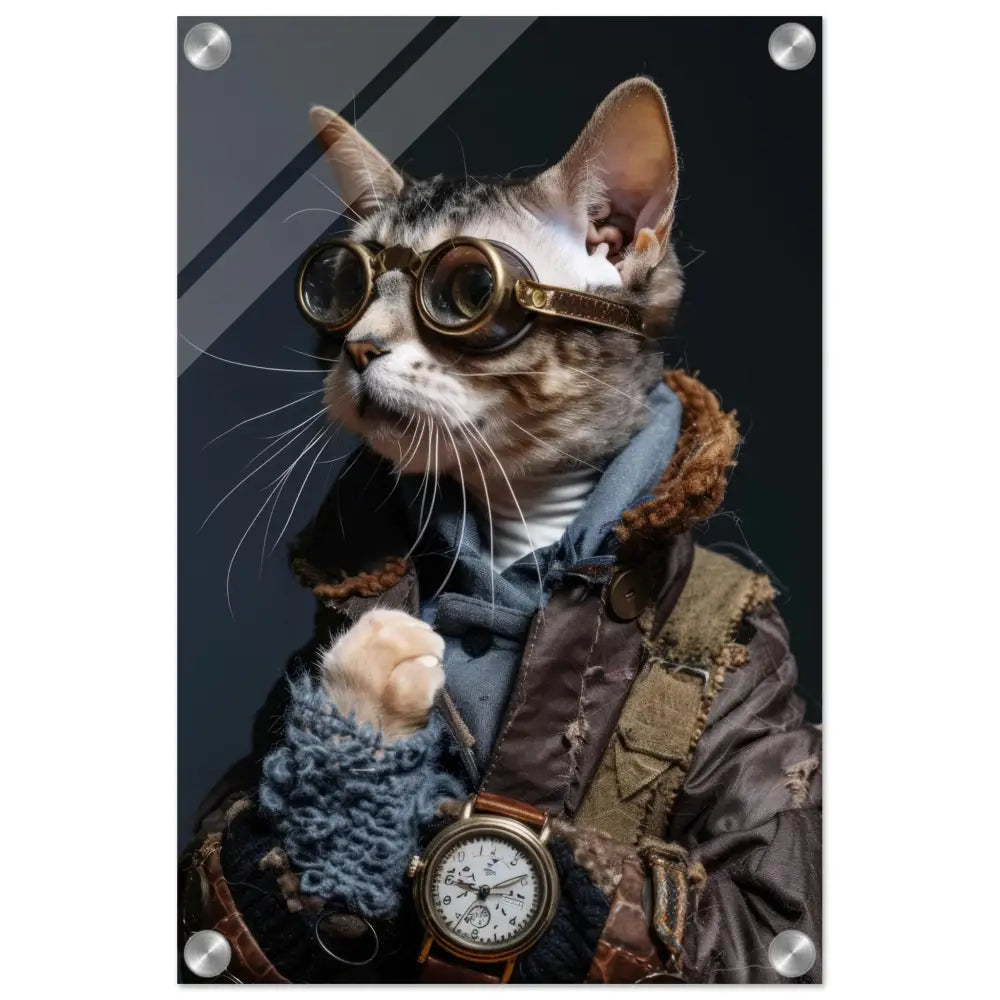 Dit schilderij toont een kat, gekleed in een prachtige vintage steampunk outfit. Hij draagt een stijlvolle, bruine leren jas met delicate patches en verweerde accenten. Om zijn nek hangt een antieke gouden klok, die goed contrasteert met de warme kleurtinten van zijn kleding. Op zijn kop prijken grote, bronskleurige retro-futuristische brillen met ingewikkelde metalen details. Zijn poten zijn voorzien van blauwe, bontachtige manchetjes die het geheel extra elegant maken. De achtergrond is donker en neutraal, wat de aandacht extra vestigt op de gedetailleerde steampunk kleding van de kat.