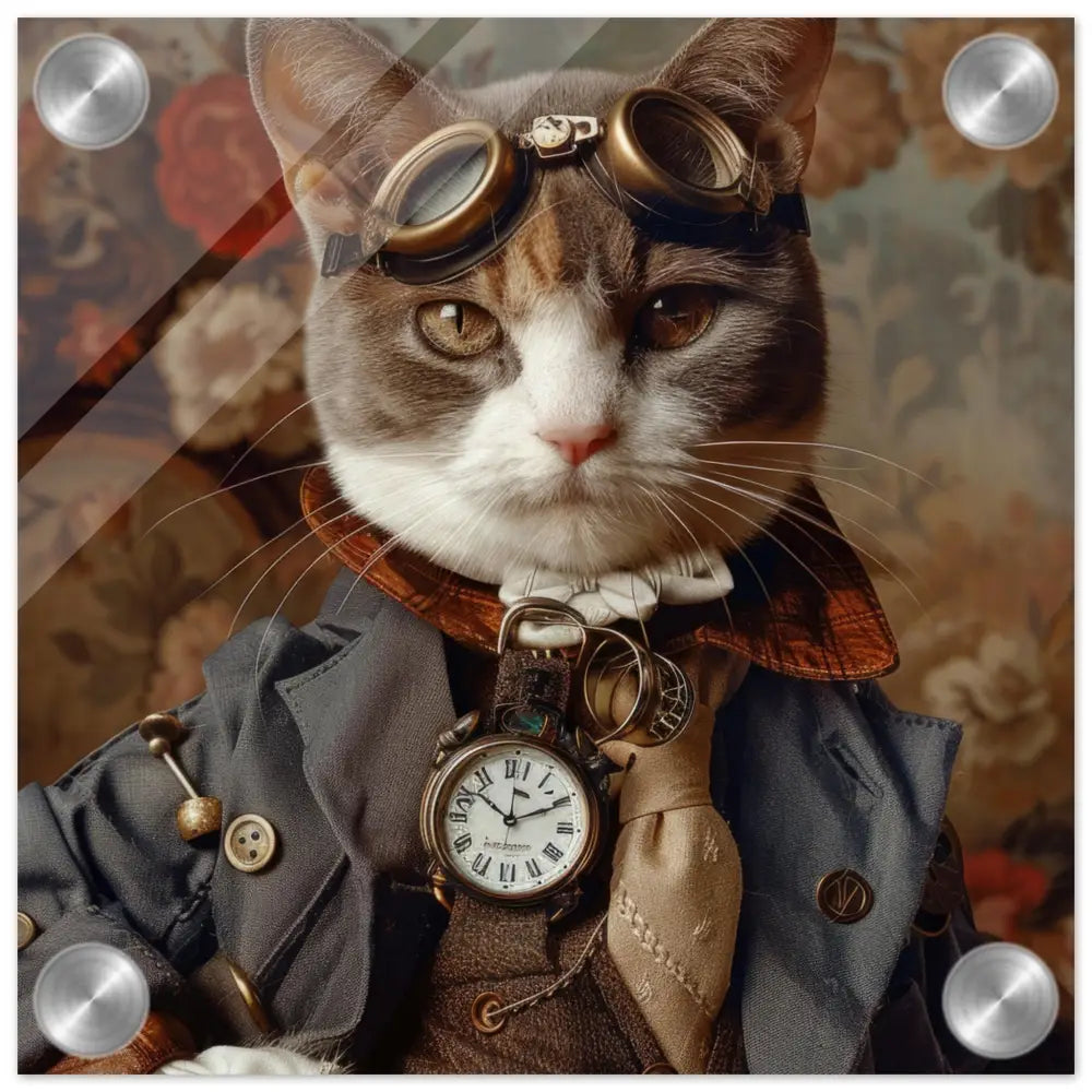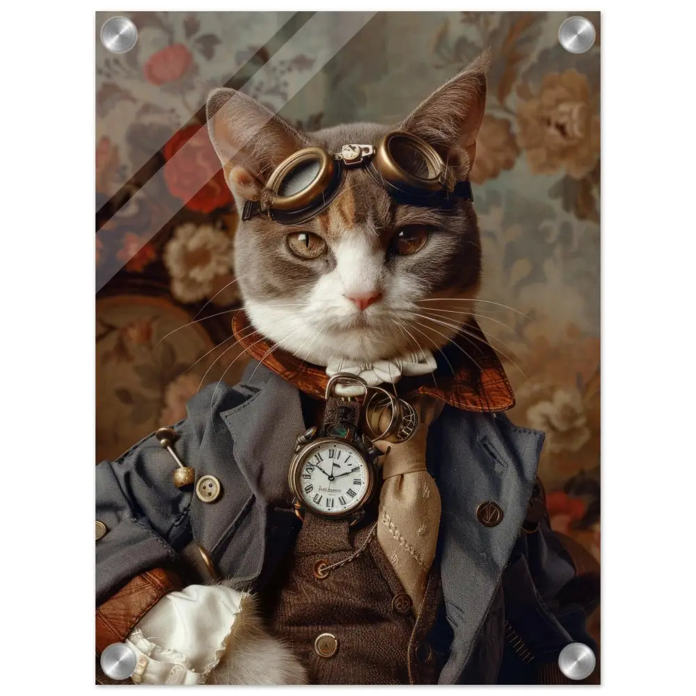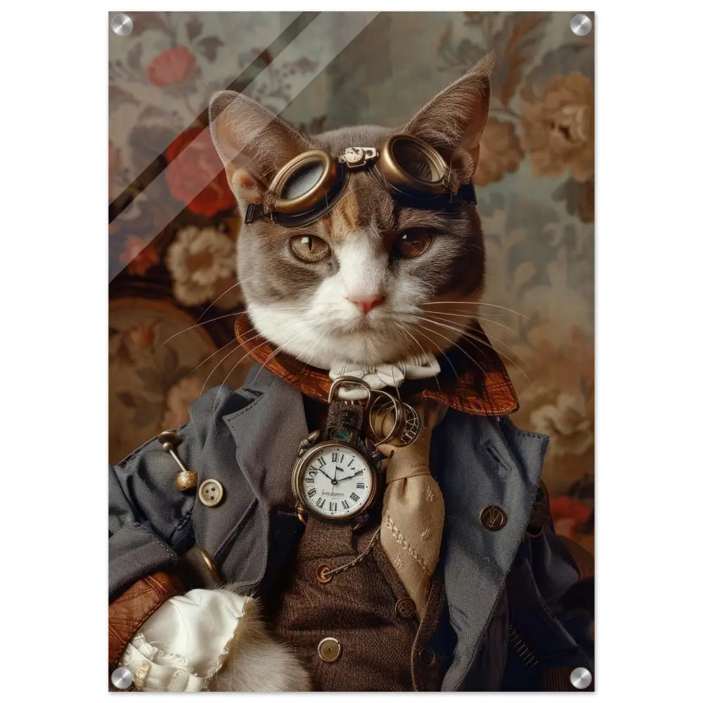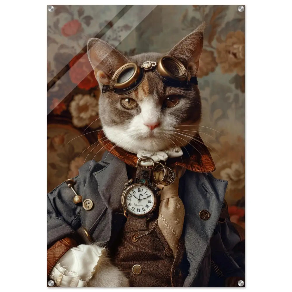 Dit schilderij toont een kat, gekleed in een prachtige vintage steampunk outfit. Ze draagt een elegante, donkerblauwe jas met gouden knopen en subtiele leren accenten. Om haar nek hangt een antieke zilveren klok, die haar aristocratische uitstraling benadrukt. Haar kop wordt gesierd door een paar retro-futuristische brillen met metalen details in bronzen tinten, waardoor ze eruitziet als een avontuurlijke tijdreiziger. Haar pootjes zijn voorzien van witte, bontachtige manchetjes die het ensemble compleet maken. De achtergrond, versierd met bloemenbehang, versterkt de romantische en klassieke sfeer van het portret.