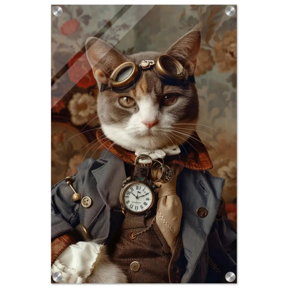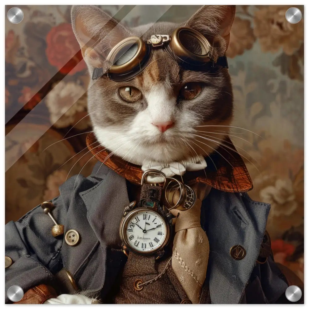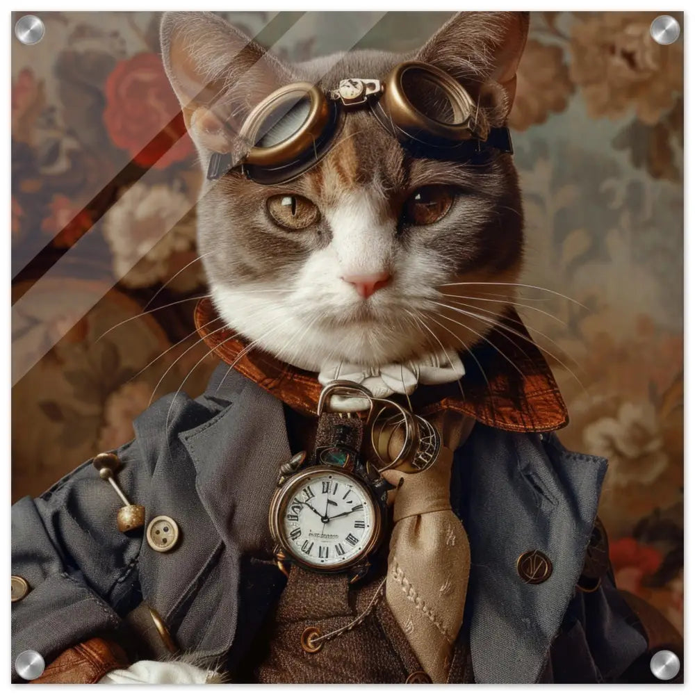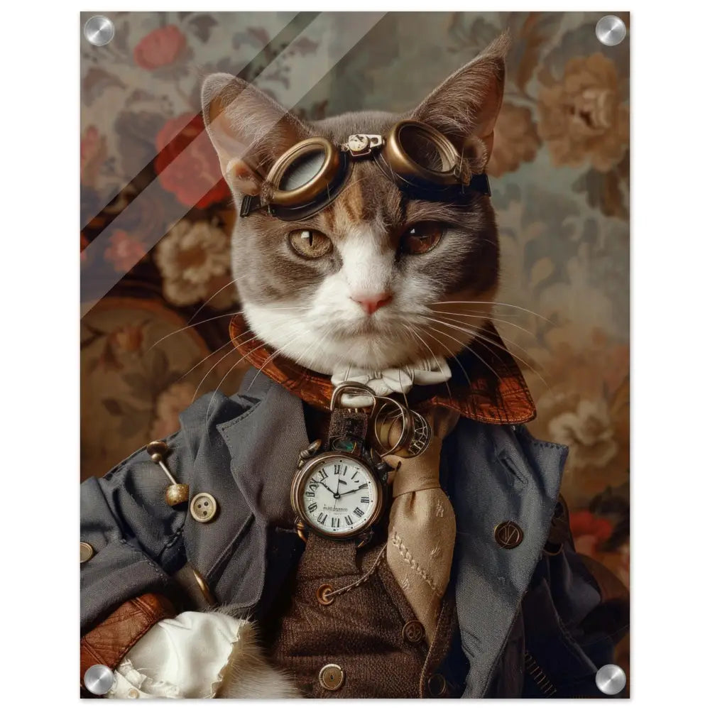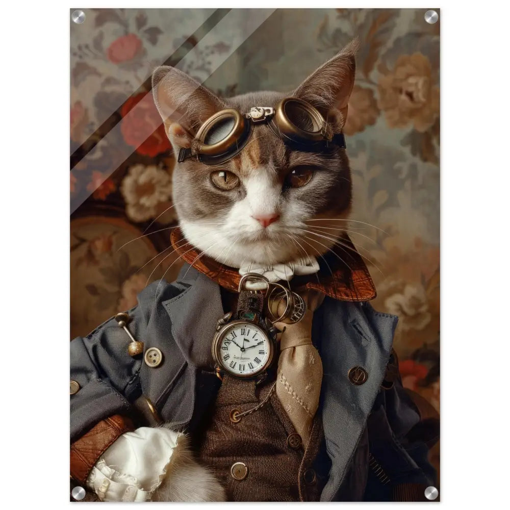 Dit schilderij toont een kat, gekleed in een prachtige vintage steampunk outfit. Ze draagt een elegante, donkerblauwe jas met gouden knopen en subtiele leren accenten. Om haar nek hangt een antieke zilveren klok, die haar aristocratische uitstraling benadrukt. Haar kop wordt gesierd door een paar retro-futuristische brillen met metalen details in bronzen tinten, waardoor ze eruitziet als een avontuurlijke tijdreiziger. Haar pootjes zijn voorzien van witte, bontachtige manchetjes die het ensemble compleet maken. De achtergrond, versierd met bloemenbehang, versterkt de romantische en klassieke sfeer van het portret.
