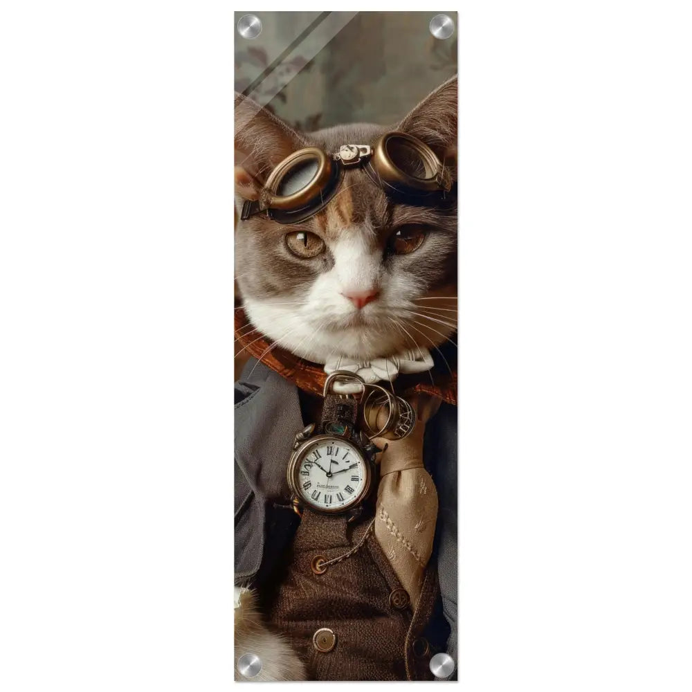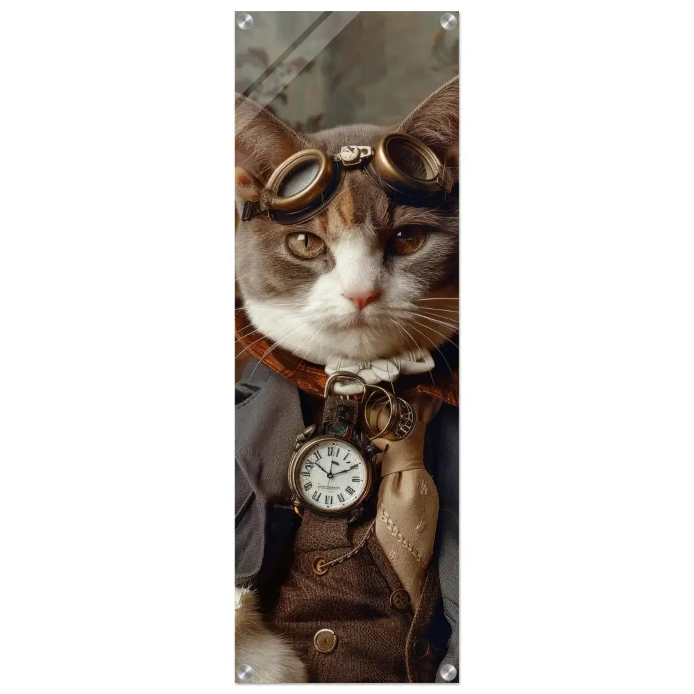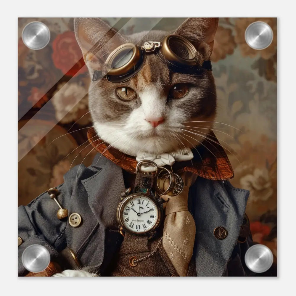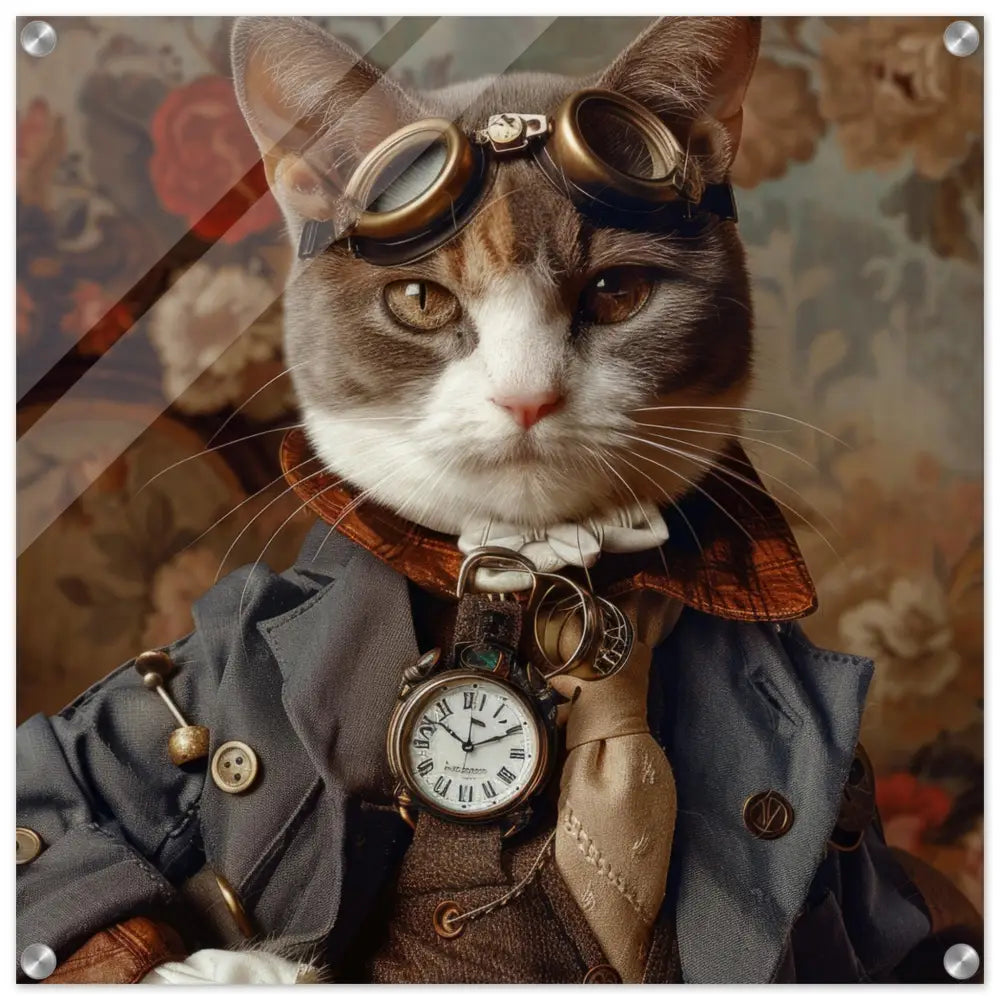 Dit schilderij toont een kat, gekleed in een prachtige vintage steampunk outfit. Ze draagt een elegante, donkerblauwe jas met gouden knopen en subtiele leren accenten. Om haar nek hangt een antieke zilveren klok, die haar aristocratische uitstraling benadrukt. Haar kop wordt gesierd door een paar retro-futuristische brillen met metalen details in bronzen tinten, waardoor ze eruitziet als een avontuurlijke tijdreiziger. Haar pootjes zijn voorzien van witte, bontachtige manchetjes die het ensemble compleet maken. De achtergrond, versierd met bloemenbehang, versterkt de romantische en klassieke sfeer van het portret.