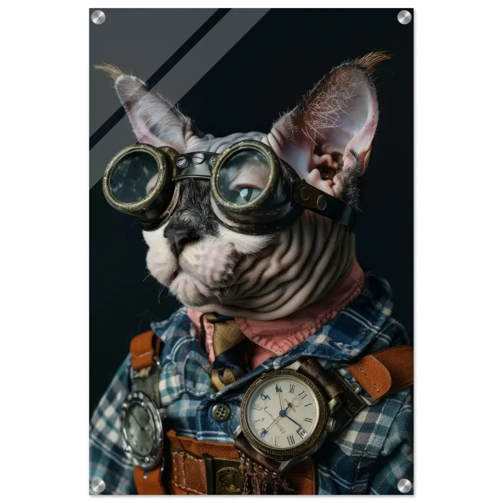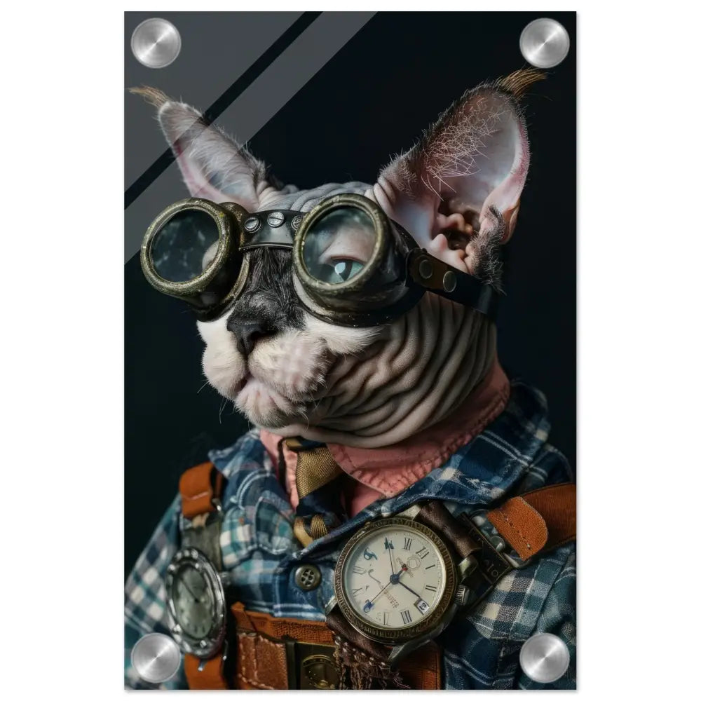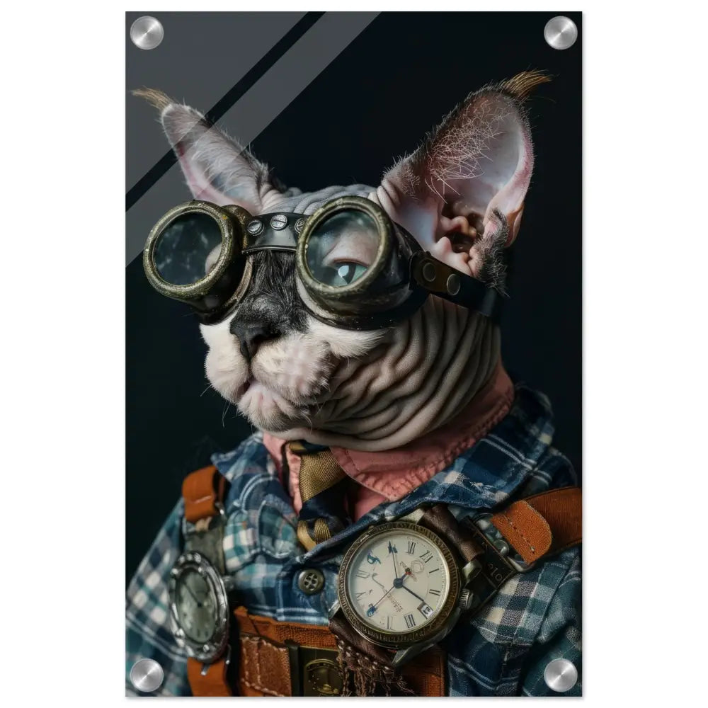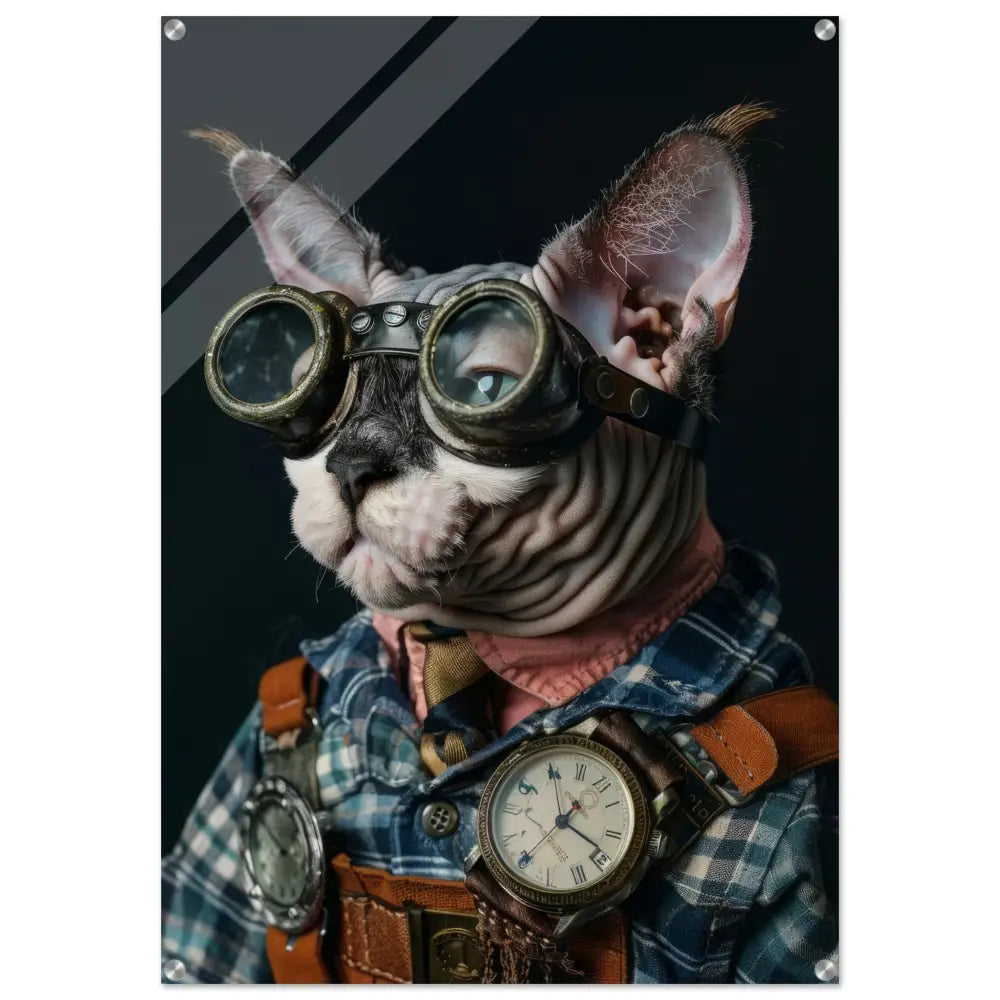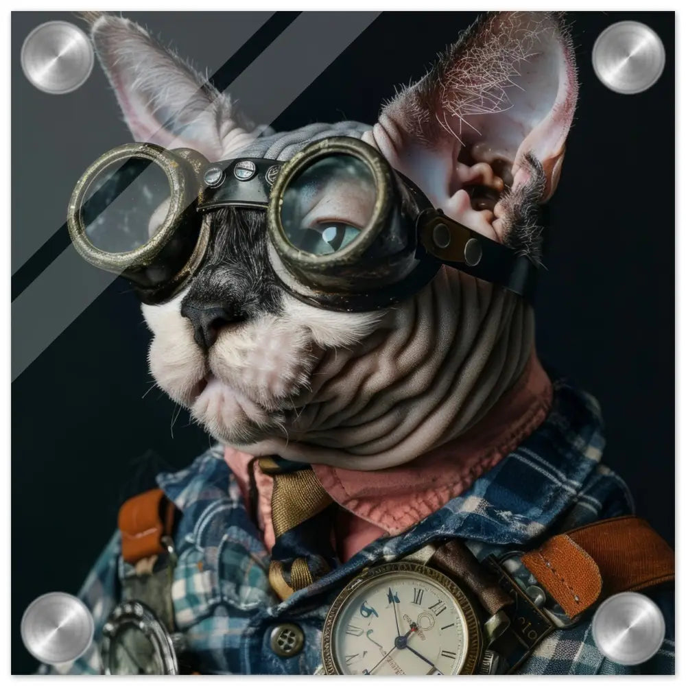 Dit schilderij toont een statige kat, gekleed in een prachtige vintage steampunk outfit. De kat draagt een verfijnde, blauwgeruite jas met subtiele metallic patronen en donkerblauwe accenten. Om zijn nek hangt een antieke, goudkleurige klok, die een vleugje elegantie toevoegt aan het geheel. Op zijn hoofd prijkt een stoere, retro-futuristische bril met bronzen metalen details, wat zijn avontuurlijke uitstraling benadrukt. Zijn pootjes zijn versierd met luxe, bruine bontachtige manchetjes en leren accenten, naast contrasterende stiksels die een unieke stijl geven. De achtergrond is donker, waardoor de steampunk-elementen prachtig naar voren komen.