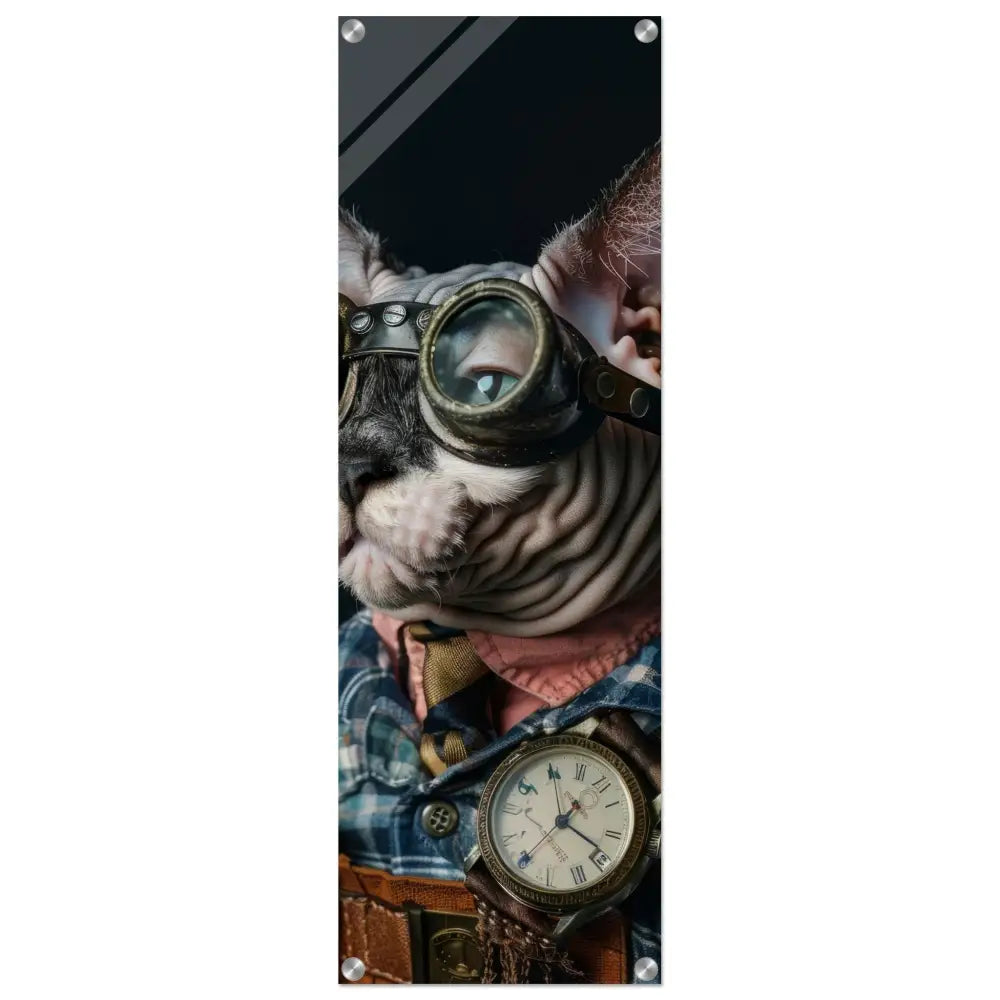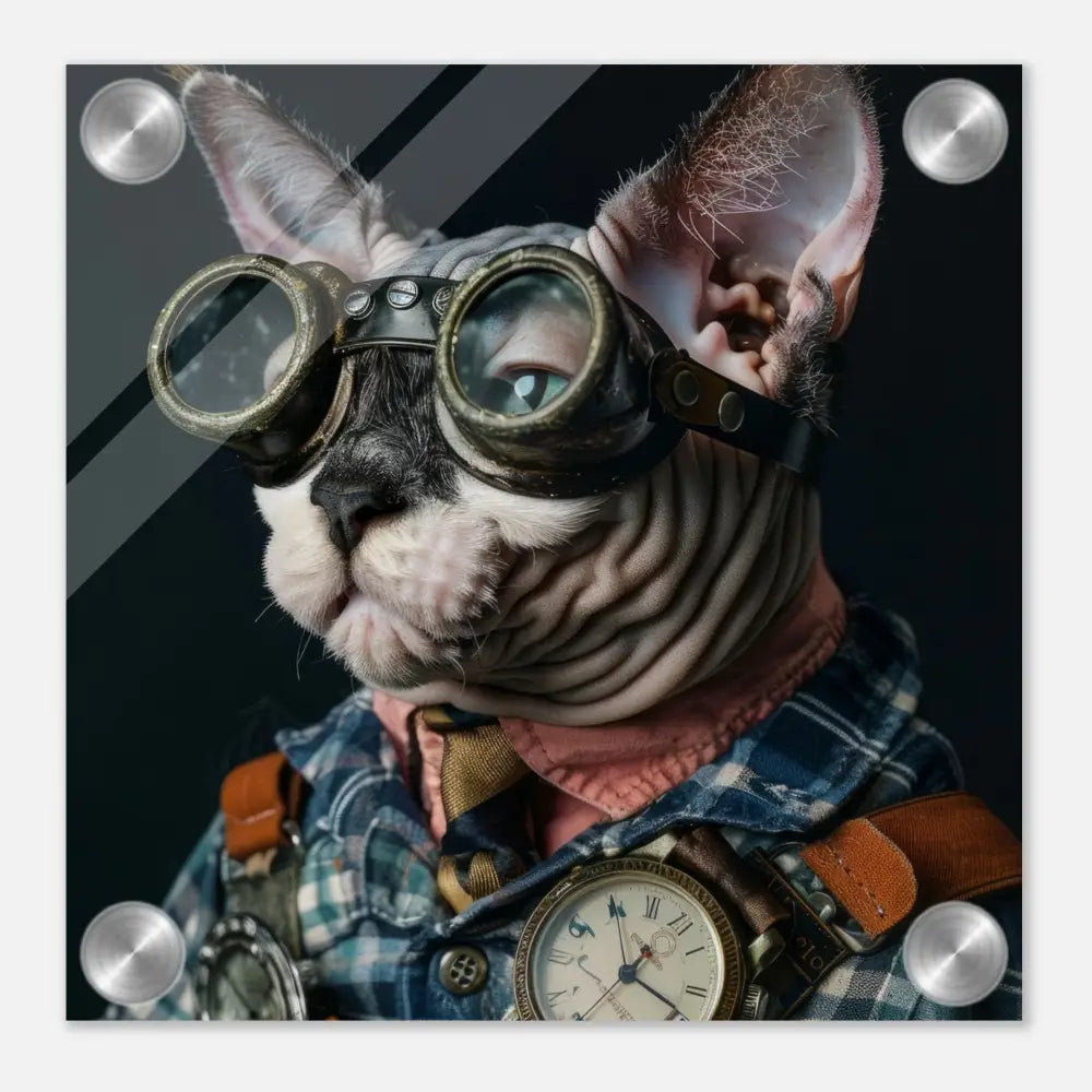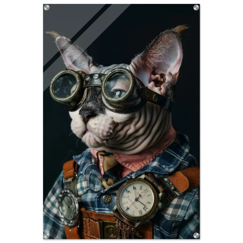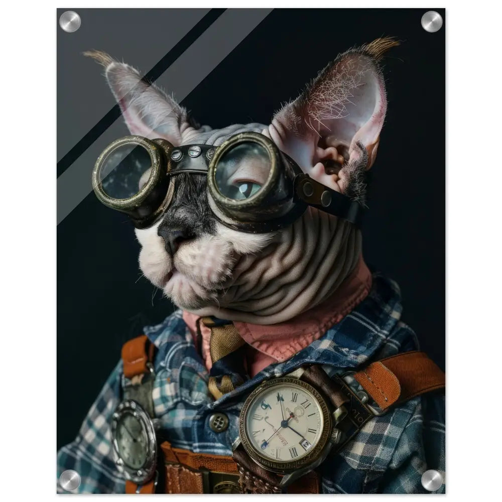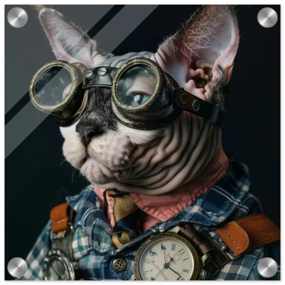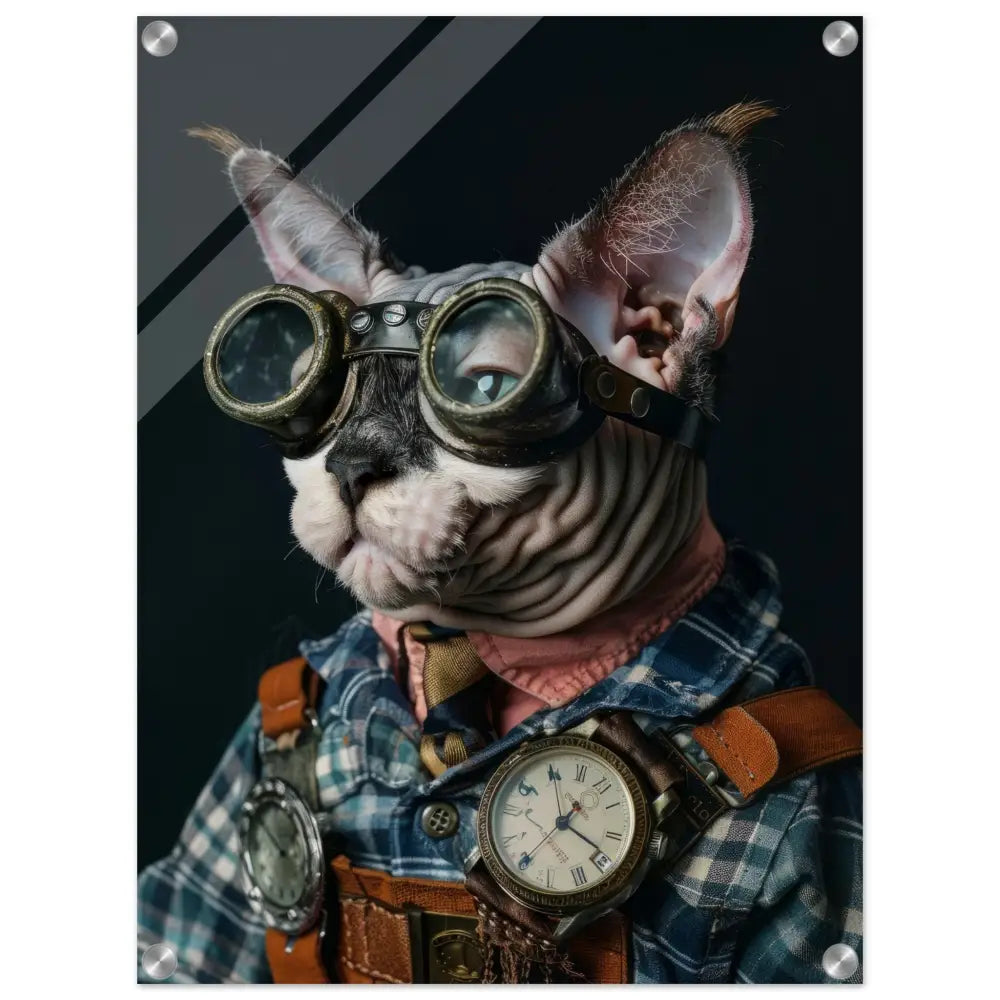 Dit schilderij toont een statige kat, gekleed in een prachtige vintage steampunk outfit. De kat draagt een verfijnde, blauwgeruite jas met subtiele metallic patronen en donkerblauwe accenten. Om zijn nek hangt een antieke, goudkleurige klok, die een vleugje elegantie toevoegt aan het geheel. Op zijn hoofd prijkt een stoere, retro-futuristische bril met bronzen metalen details, wat zijn avontuurlijke uitstraling benadrukt. Zijn pootjes zijn versierd met luxe, bruine bontachtige manchetjes en leren accenten, naast contrasterende stiksels die een unieke stijl geven. De achtergrond is donker, waardoor de steampunk-elementen prachtig naar voren komen.