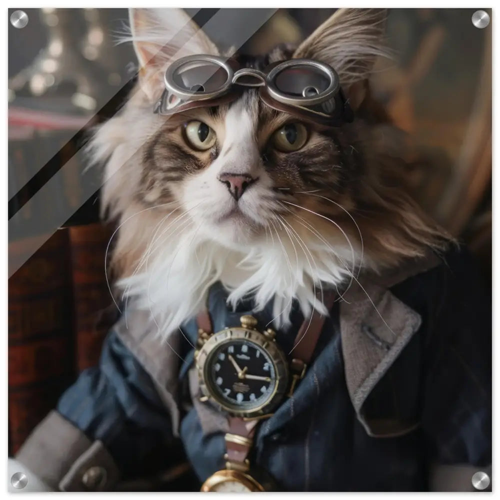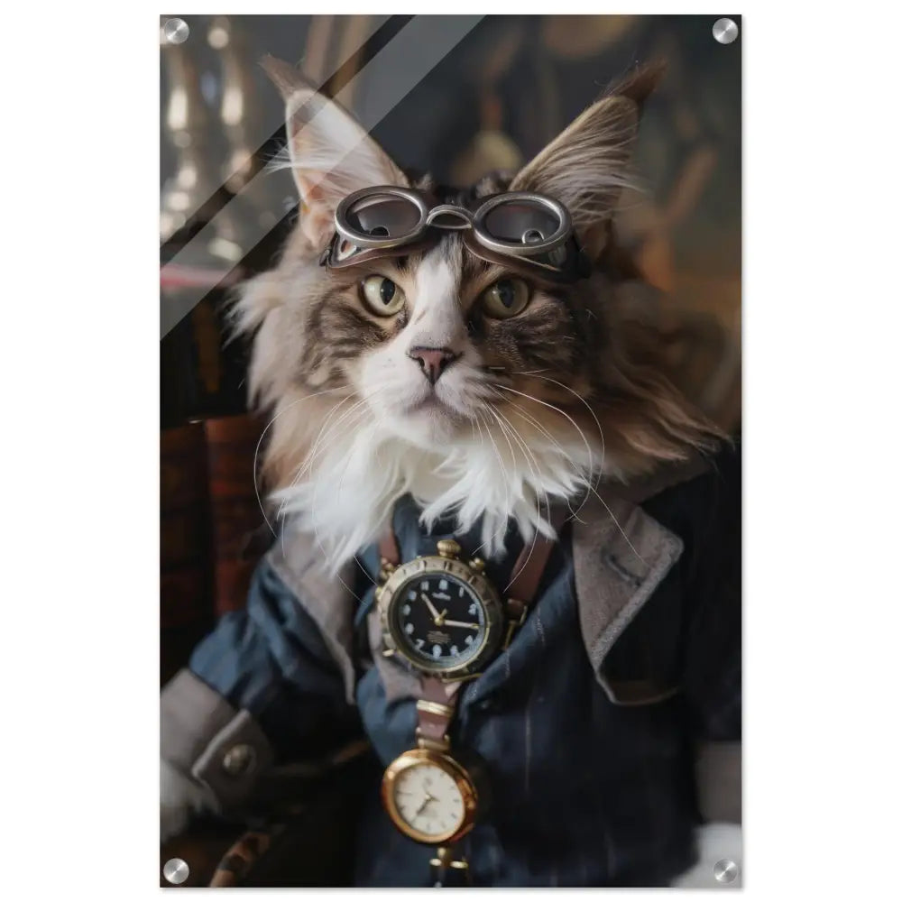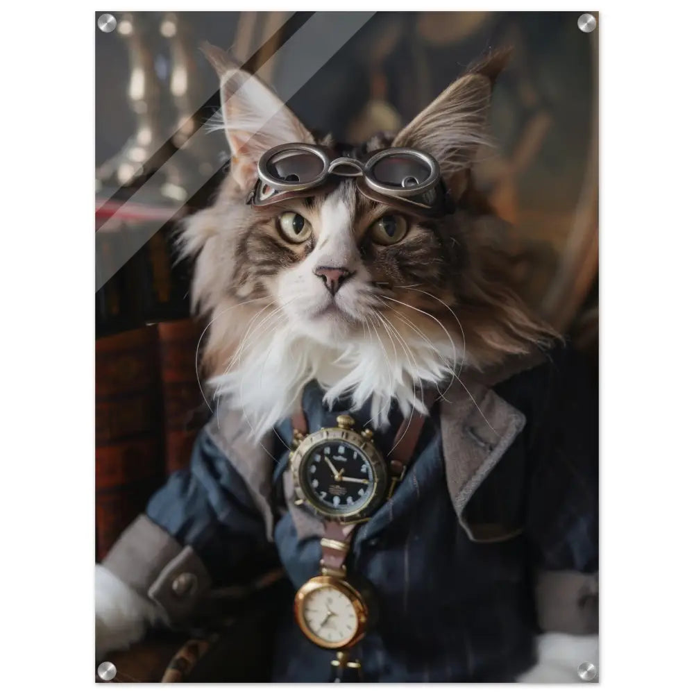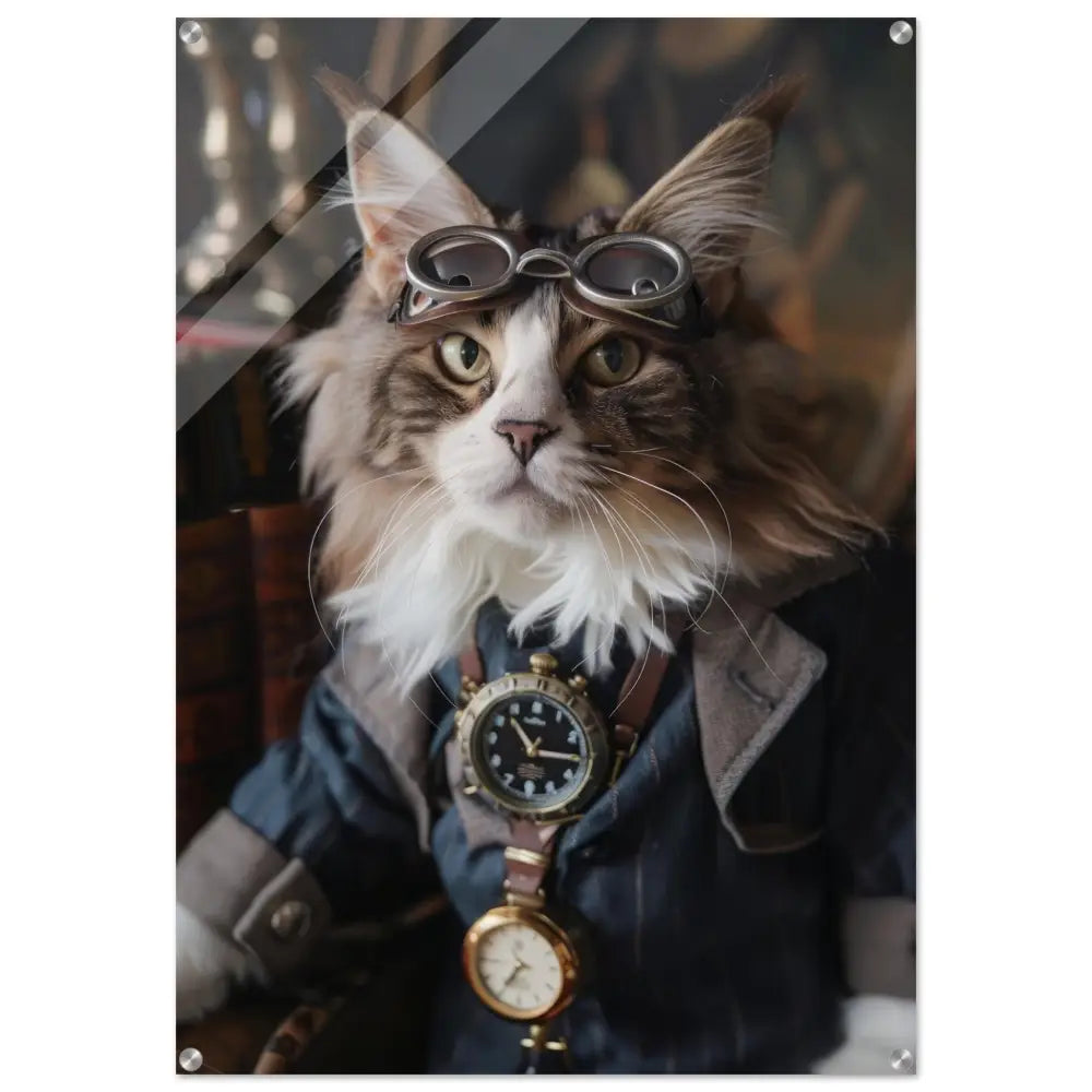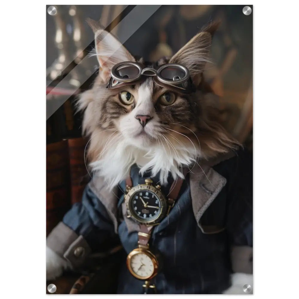 Dit schilderij toont een kat, gekleed in een prachtige vintage steampunk outfit. De kat draagt een verfijnde, donkerblauwe jas met subtiele streepdetails en zilveren accenten. Om de nek van de kat hangt een antieke klok, waarvan de zijkanten en wijzerplaat een diepzwarte kleur hebben. Boven op het hoofd rust een paar robuuste, bronzen steampunk brillen met schitterende metalen details. De stijlvolle look wordt verder verrijkt door de grijze bontachtige manchetjes om de poten, leren accenten en contrasterende stiksels. De achtergrond bestaat uit klassiek meubilair en warme tinten, wat de hele compositie een gezellige en tijdloze sfeer geeft.