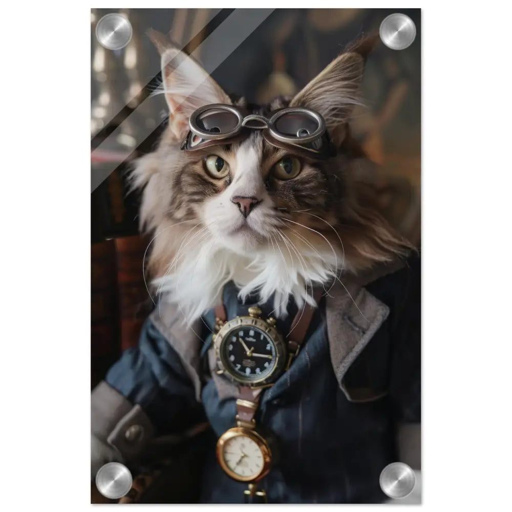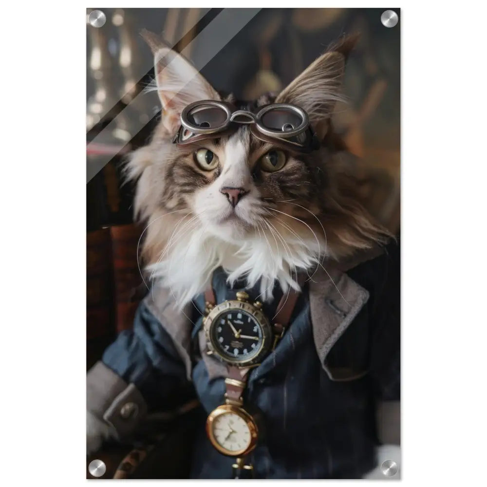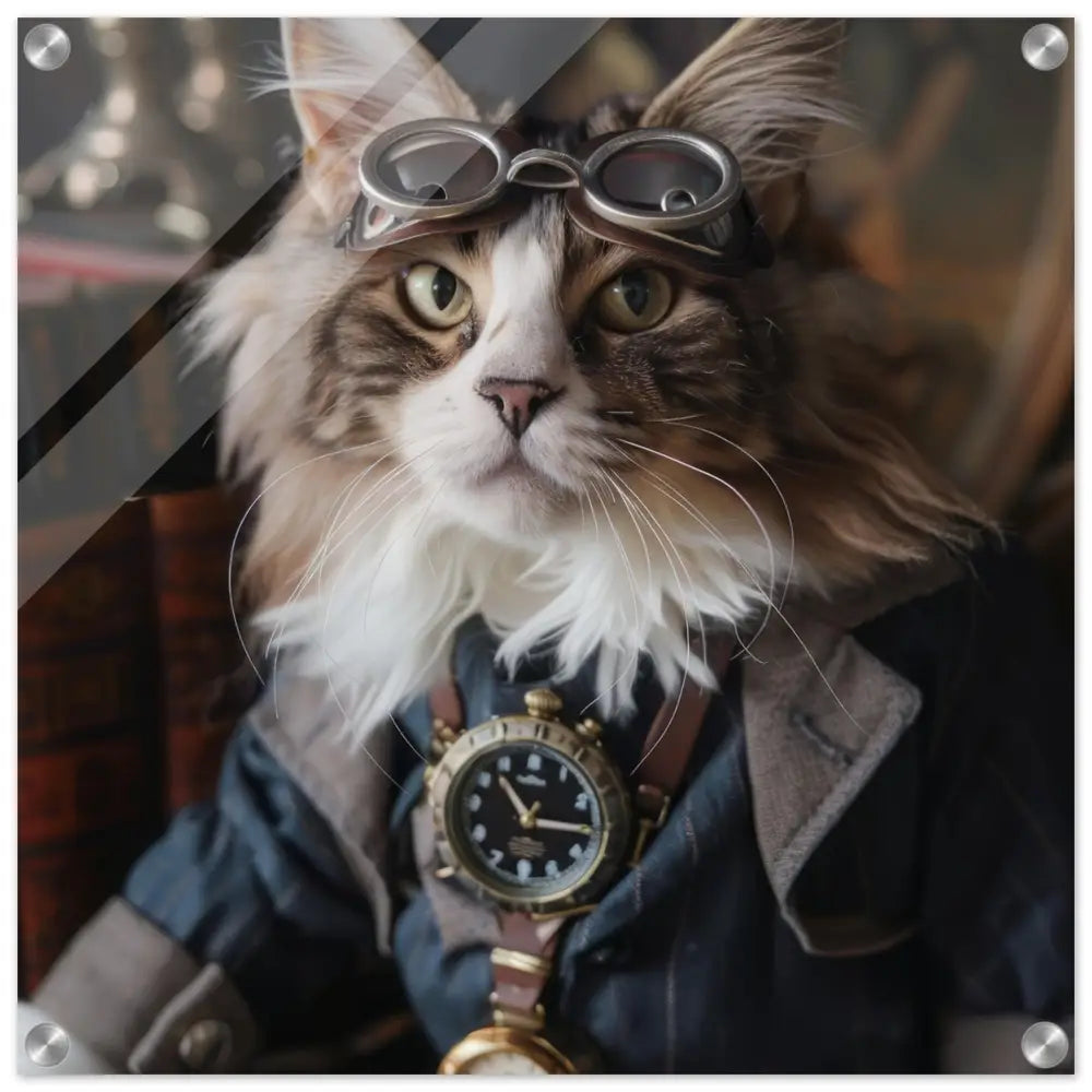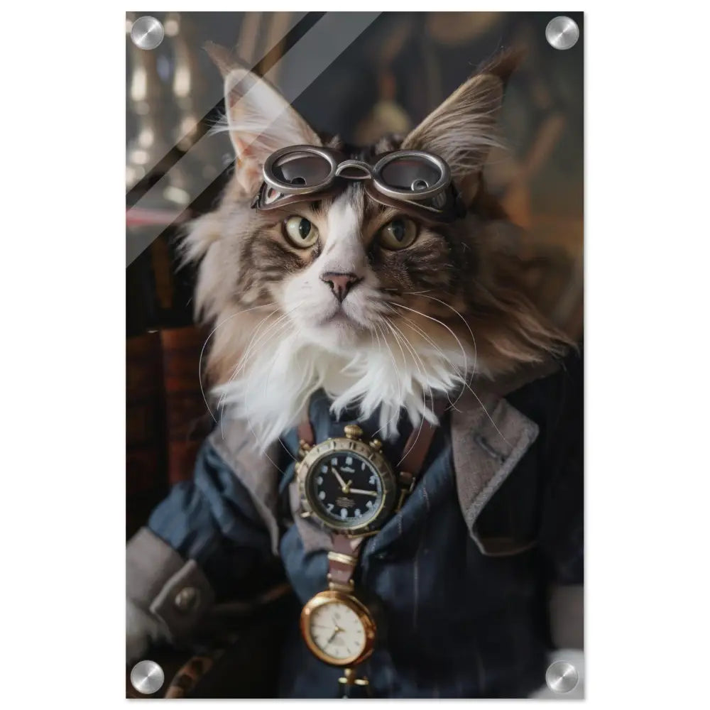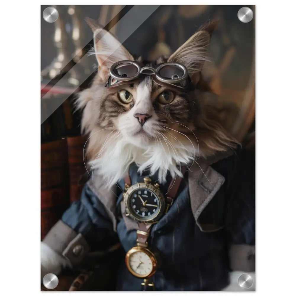 Dit schilderij toont een kat, gekleed in een prachtige vintage steampunk outfit. De kat draagt een verfijnde, donkerblauwe jas met subtiele streepdetails en zilveren accenten. Om de nek van de kat hangt een antieke klok, waarvan de zijkanten en wijzerplaat een diepzwarte kleur hebben. Boven op het hoofd rust een paar robuuste, bronzen steampunk brillen met schitterende metalen details. De stijlvolle look wordt verder verrijkt door de grijze bontachtige manchetjes om de poten, leren accenten en contrasterende stiksels. De achtergrond bestaat uit klassiek meubilair en warme tinten, wat de hele compositie een gezellige en tijdloze sfeer geeft.