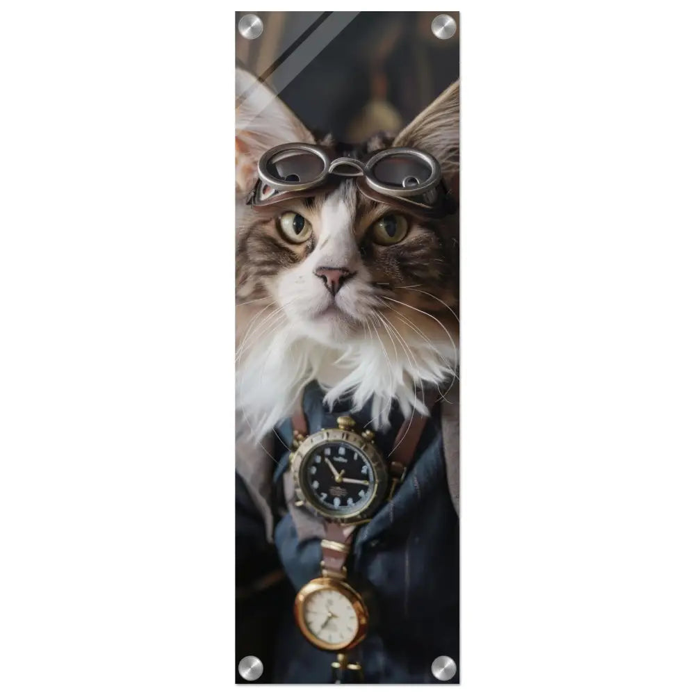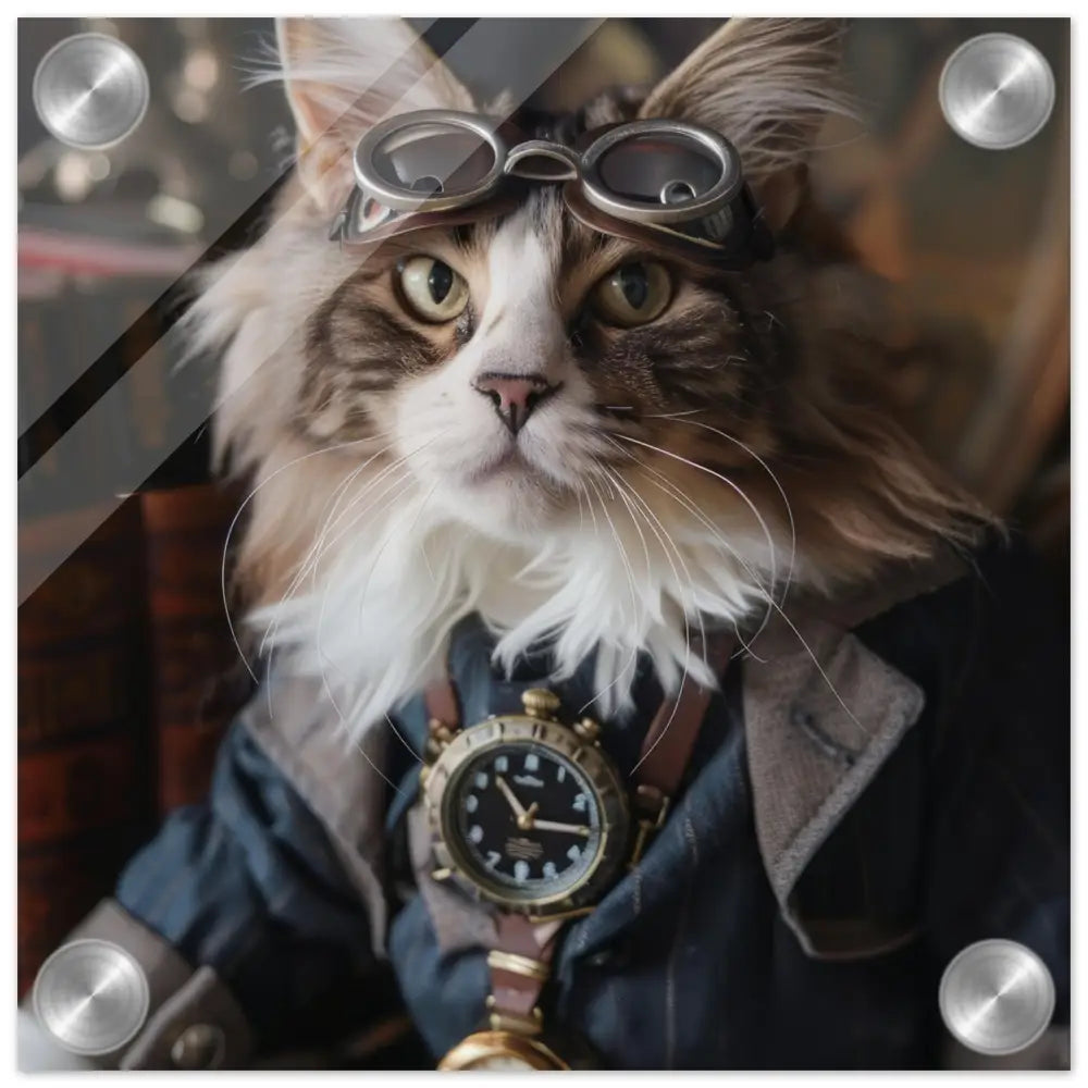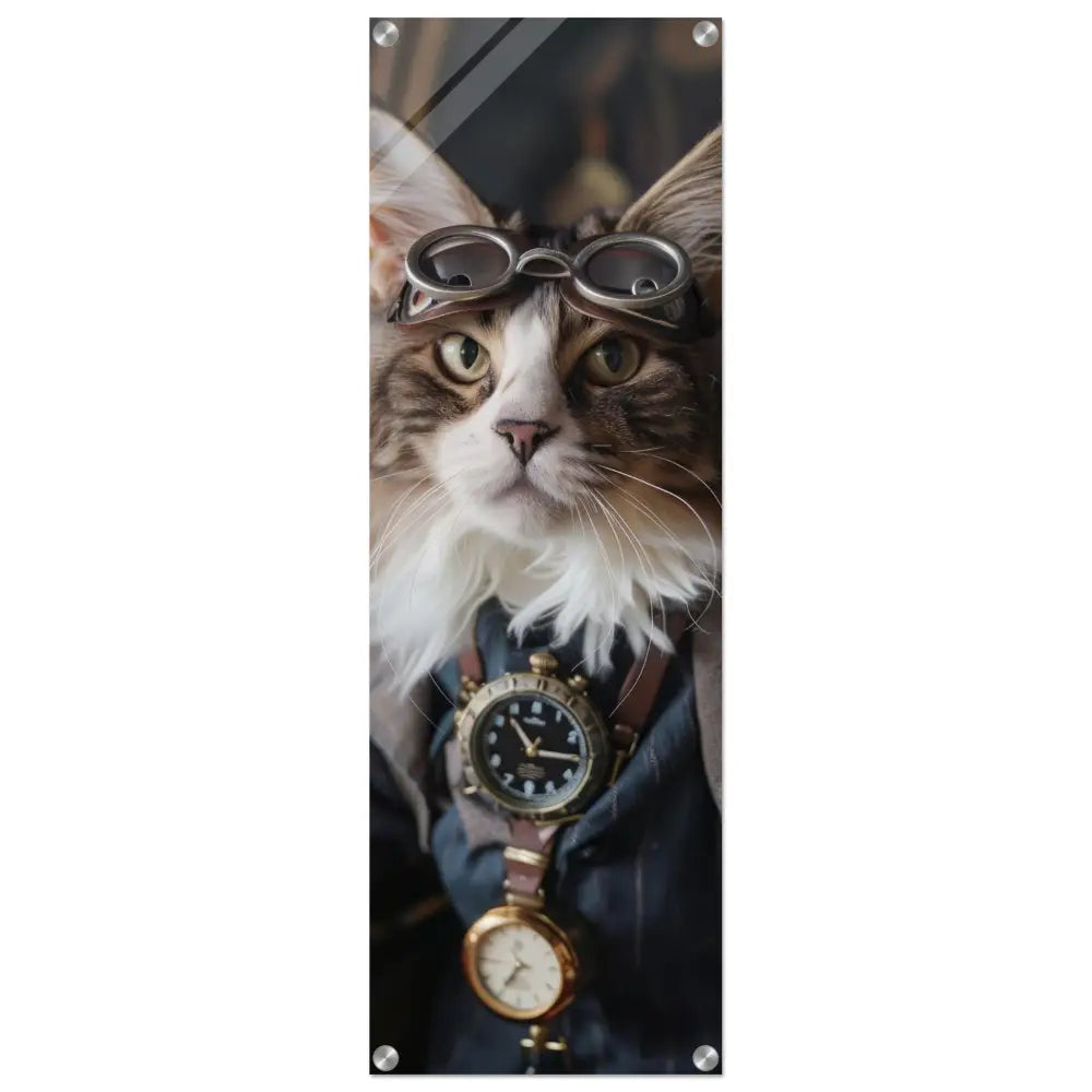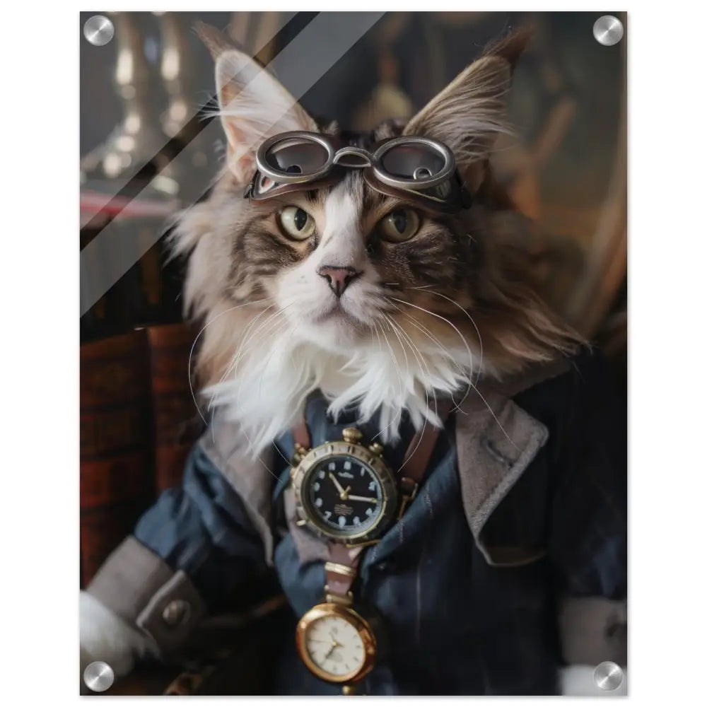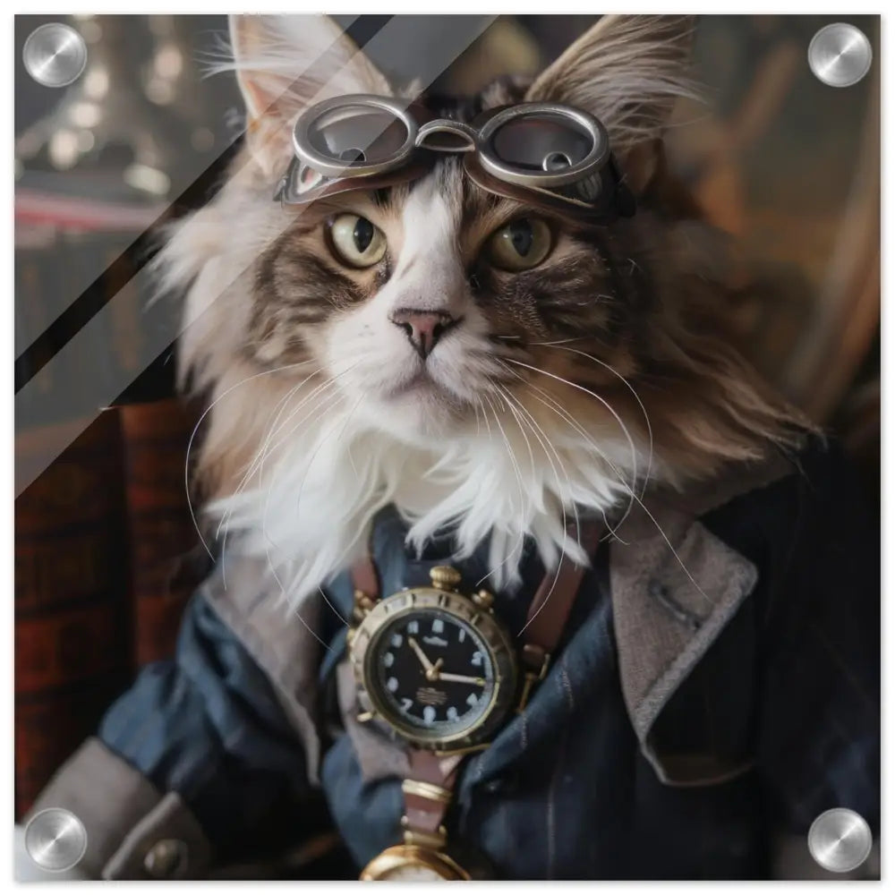 Dit schilderij toont een kat, gekleed in een prachtige vintage steampunk outfit. De kat draagt een verfijnde, donkerblauwe jas met subtiele streepdetails en zilveren accenten. Om de nek van de kat hangt een antieke klok, waarvan de zijkanten en wijzerplaat een diepzwarte kleur hebben. Boven op het hoofd rust een paar robuuste, bronzen steampunk brillen met schitterende metalen details. De stijlvolle look wordt verder verrijkt door de grijze bontachtige manchetjes om de poten, leren accenten en contrasterende stiksels. De achtergrond bestaat uit klassiek meubilair en warme tinten, wat de hele compositie een gezellige en tijdloze sfeer geeft.