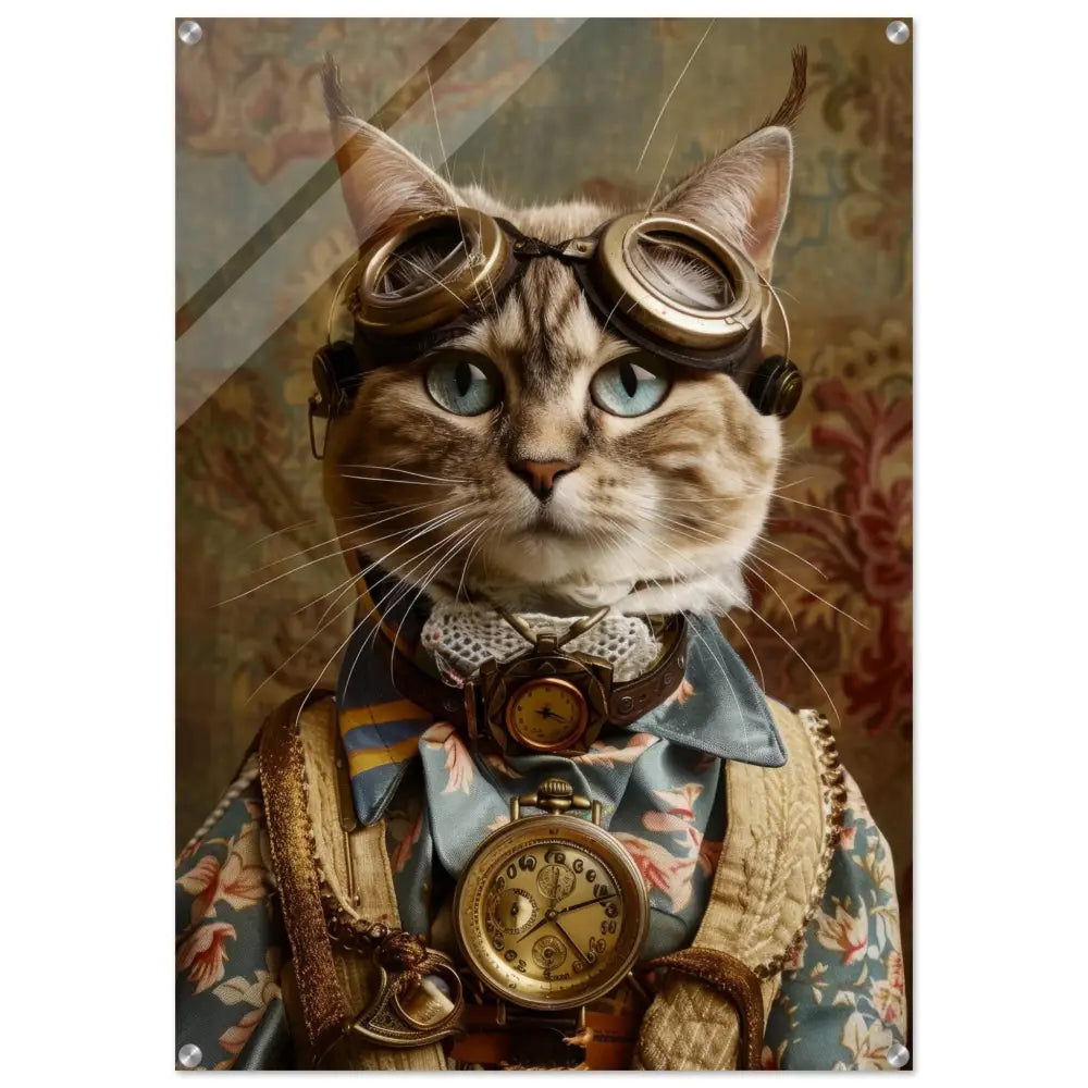Dit schilderij toont een kat, gekleed in een prachtige vintage steampunk outfit. De kat draagt een elegante, blauwe jas met ingewikkelde bloemenpatronen en verfijnde brokaat accenten. Om haar nek hangt een antieke gouden klok, die haar charmante en historische uitstraling versterkt. Verder wordt haar kop gesierd door een paar grote, retro-futuristische brillen met bronzen metalen details, wat haar een avontuurlijke, wetenschappelijke flair geeft. Haar pootjes zijn voorzien van subtiele, beige leren accenten die perfect contrasteren met de jas. De achtergrond bevat een romantisch, gedrapeerd bloemenbehang, waardoor de afbeelding een nostalgische sfeer krijgt.