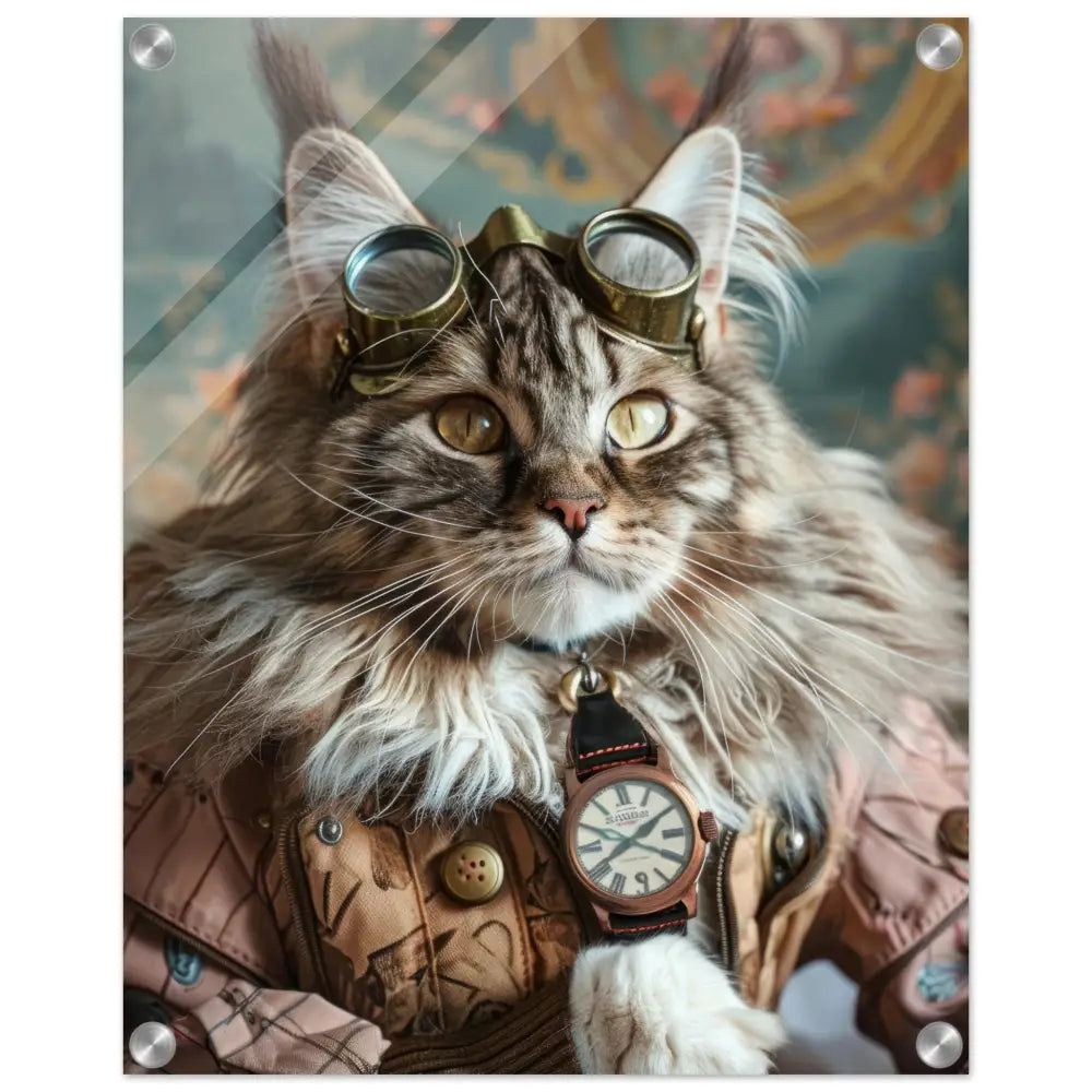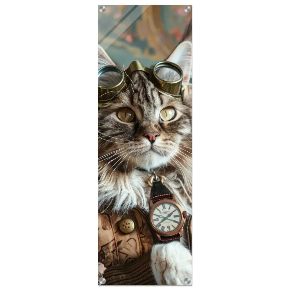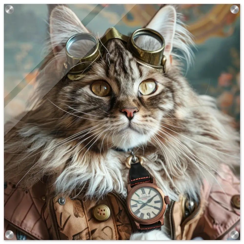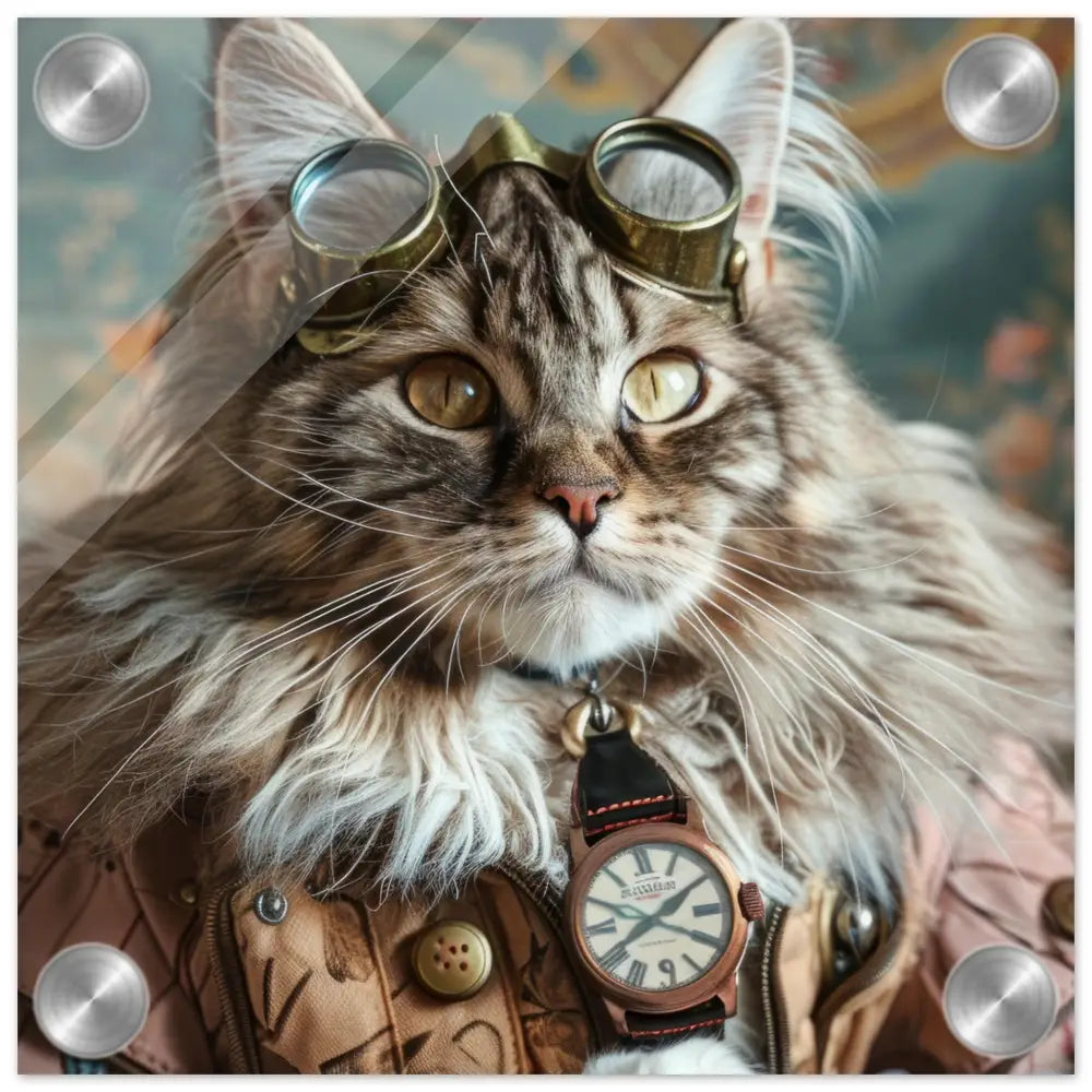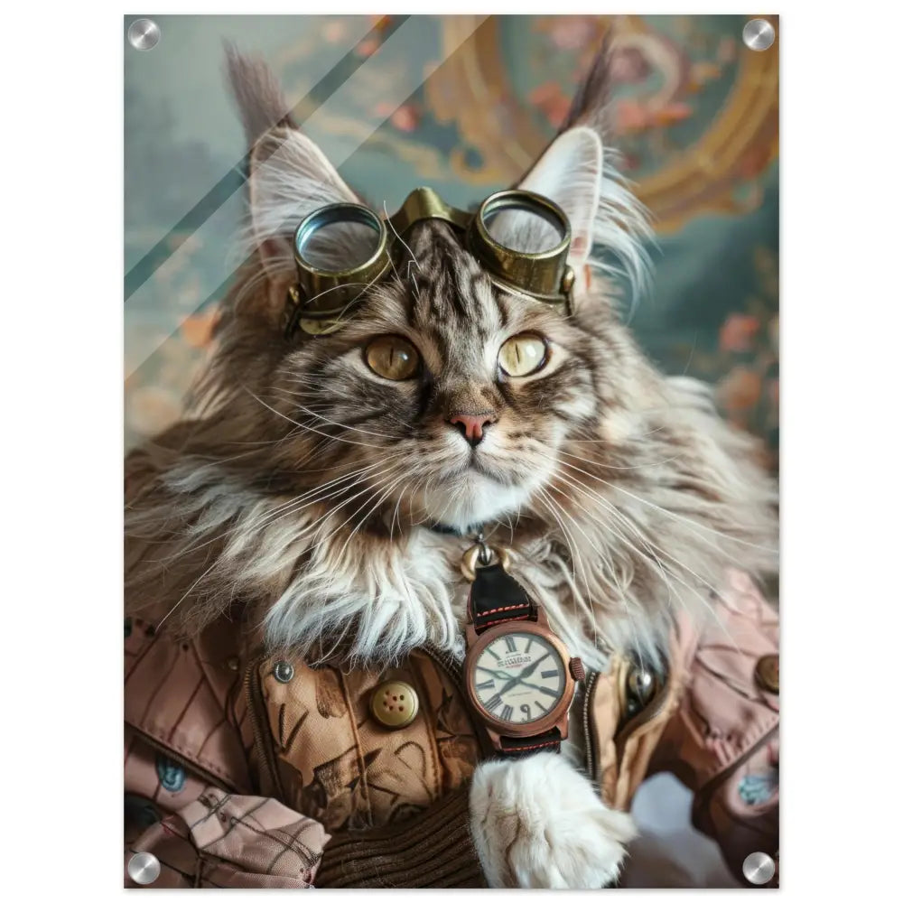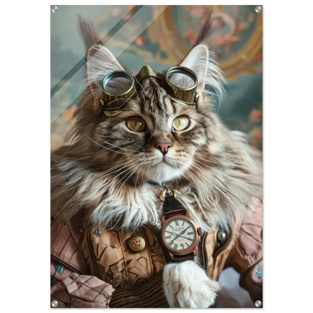 Dit schilderij toont een kat, gekleed in een prachtige vintage steampunk outfit. De kat draagt een sierlijke, beige jas met ingewikkelde patronen en knoopaccenten. Om zijn nek hangt een antieke klok met een koperkleurige omlijsting, wat zijn elegante verschijning benadrukt. Op zijn kop rust een paar grote, retro-futuristische brillen met bronzen metalen details, waardoor hij lijkt op een tijdreiziger. Zijn pootjes zijn versierd met elegante, bontachtige manchetjes die perfect bij de leren accenten van zijn outfit passen. De achtergrond heeft een kunstzinnige schildering, die een rustieke maar fantasierijke sfeer toevoegt aan de afbeelding.