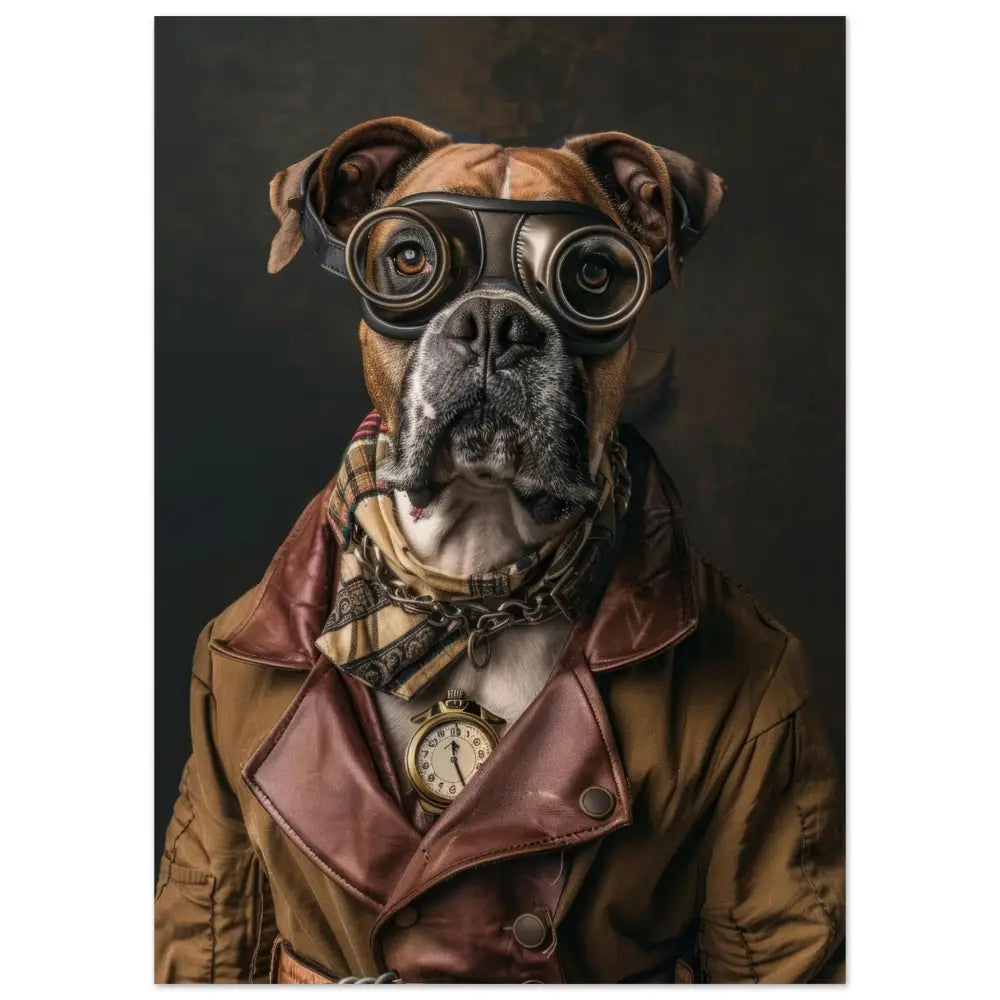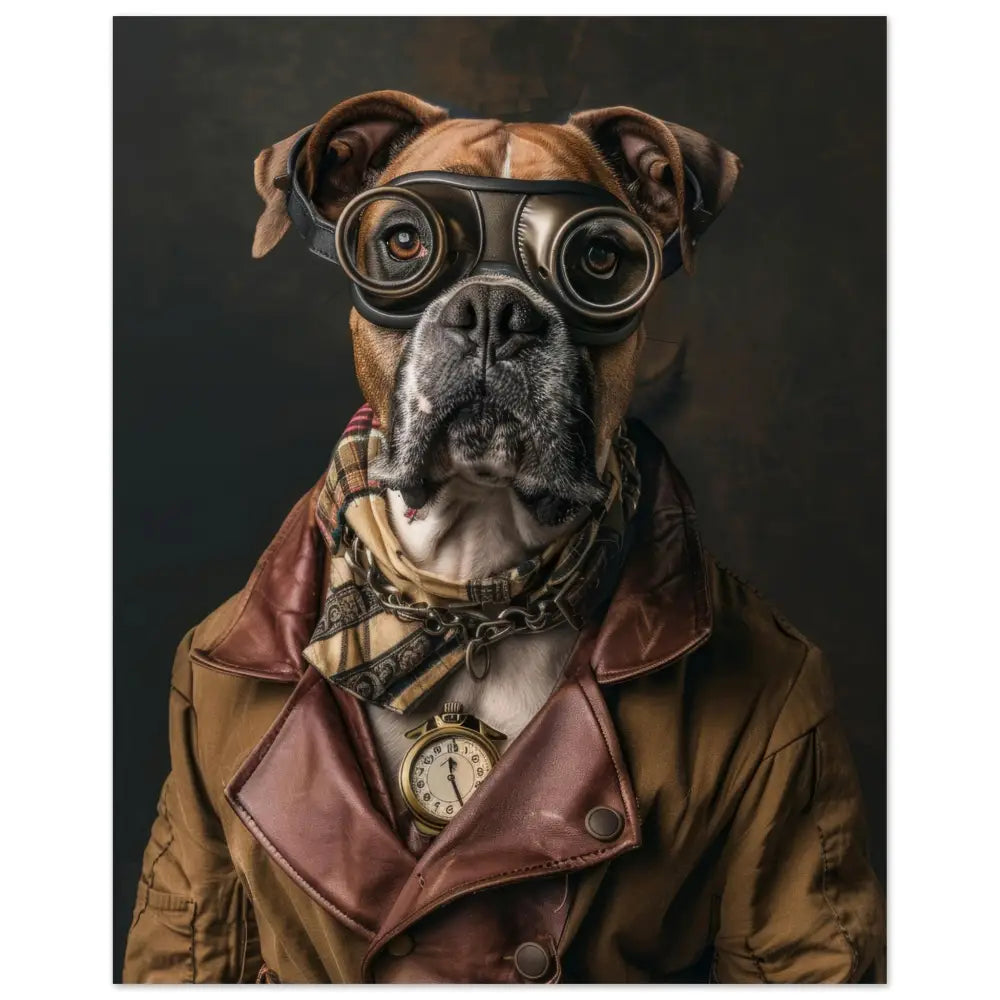 Deze afbeelding toont een dier, gekleed in een prachtige vintage steampunk outfit. Het draagt een stijlvolle, bruin leren jas met subtiele metalen knopen en schouderstukken die zijn versierd met lichte naden. Om de nek van de hond hangt een antieke gouden klok, die een opvallende elegantie toevoegt aan het geheel. De kop wordt gesierd door een grote, retro-futuristische bril met donkere metalen details, waardoor deze hond eruitziet als een tijdreiziger uit een andere wereld. De poten zijn voorzien van bescheiden leren gespen, compleet met contrasterende stiksels. Op de achtergrond is een donkere, industriële setting te zien, wat de steampunk sfeer compleet maakt.