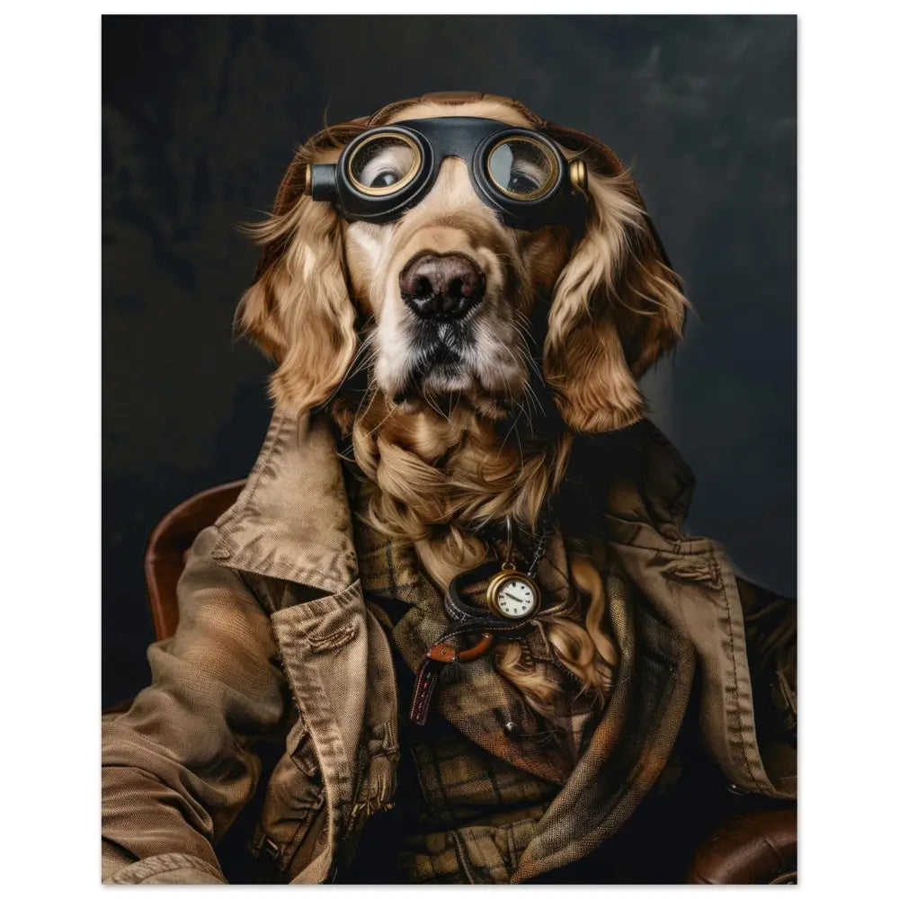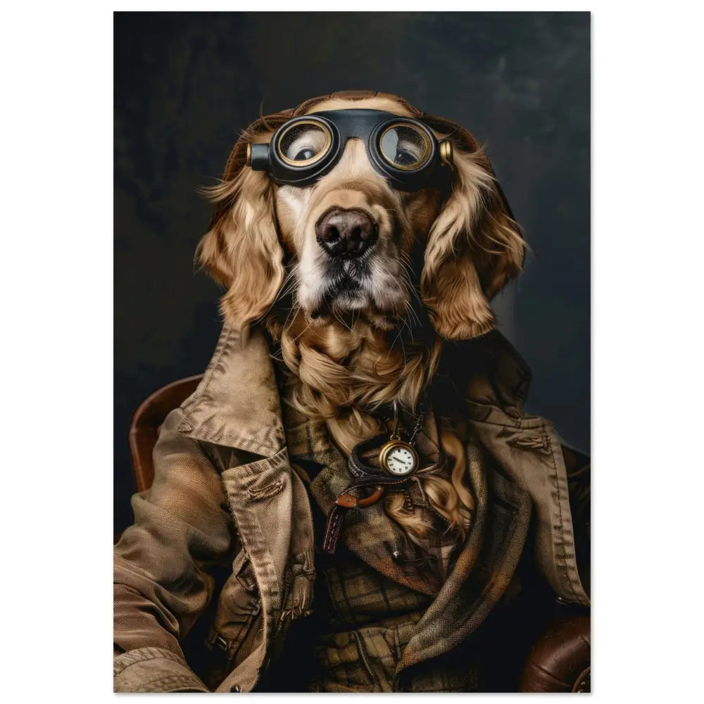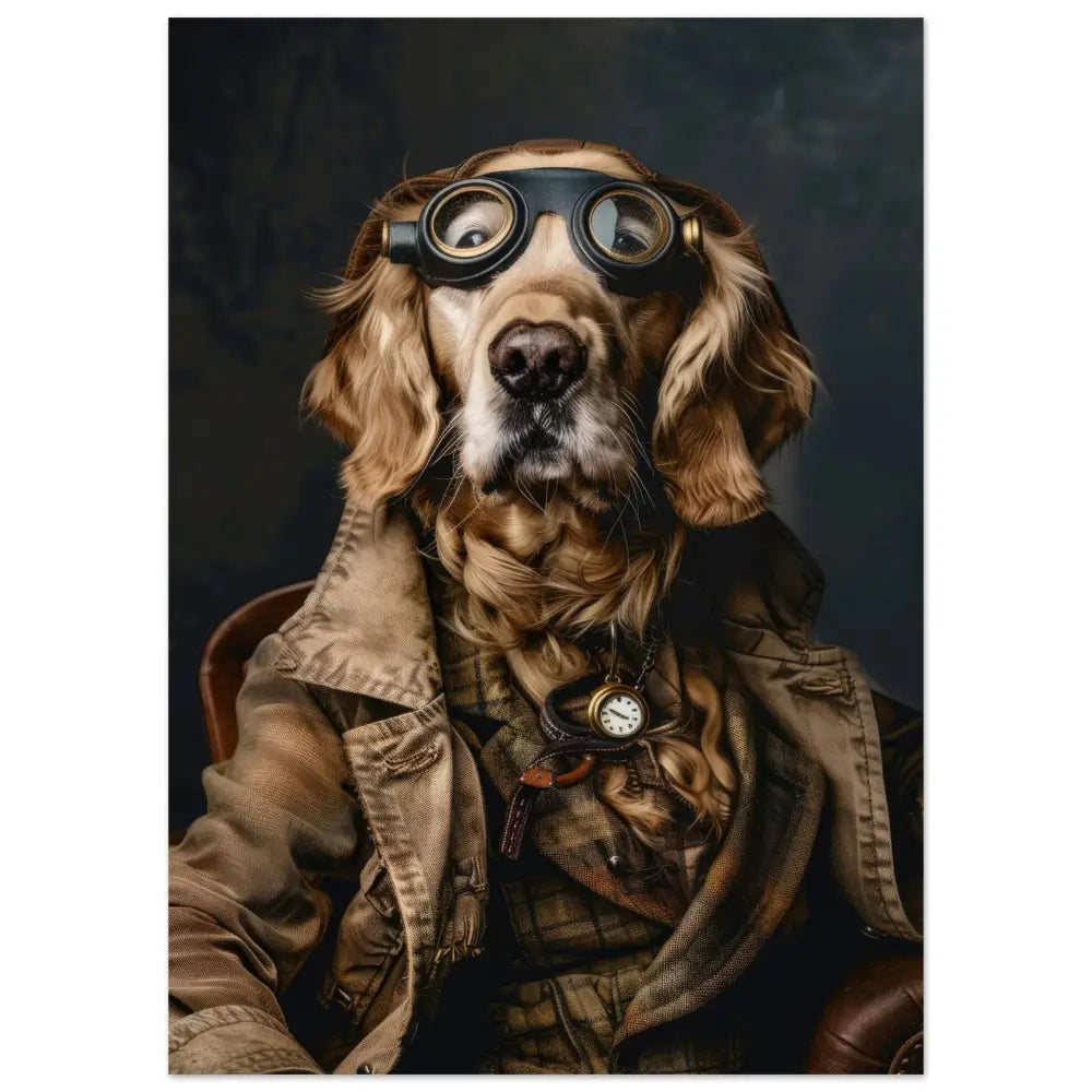 Deze afbeelding toont een dier, gekleed in een prachtige vintage steampunk outfit. Het draagt een elegante, bruingroene jas met subtiele, verweerde accenten die een antieke charme uitstralen. Om de nek hangt een delicate gouden klok, die op een gedetailleerde donkere riem is bevestigd. Op het hoofd rust een paar opvallende, retro-futuristische brillen met metalen details in diepzwarte kleur, waardoor het een intrigerende, avontuurlijke look krijgt. De pootjes zijn voorzien van eenvoudige, maar stijlvolle leren accenten die het geheel netjes afwerken. De achtergrond is mysterieus donker en laat het steampunk-thema nog meer opvallen.
