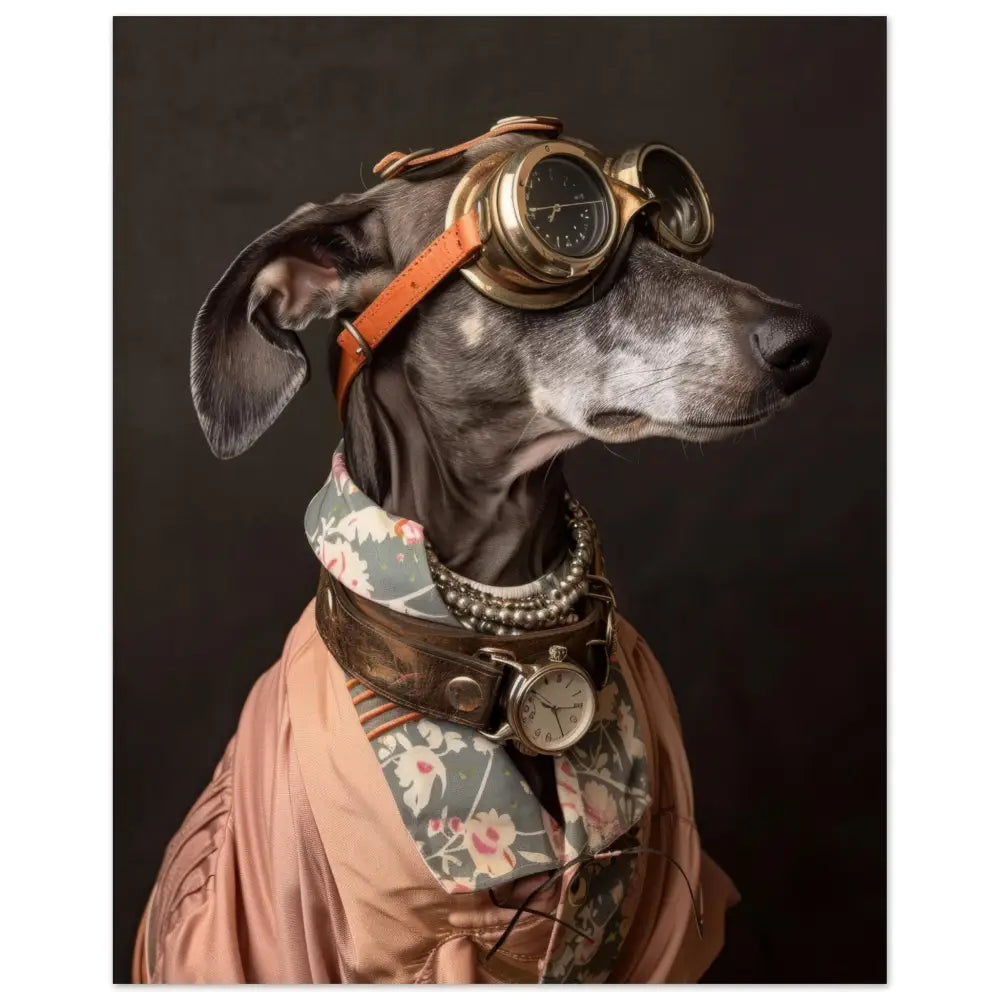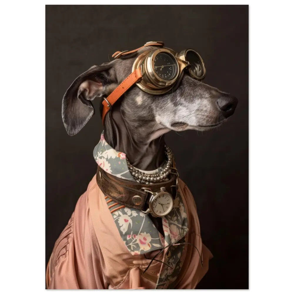 Deze afbeelding toont een hond, gekleed in een prachtige steampunk outfit. Het draagt een elegante roze jas met bloemmotieven en subtiele details bij de schouders. Om de nek hangt een antieke zilveren klok, die contrasteert met de geraffineerde outfit en de sierlijke kralenketting. Op het hoofd van de hond prijkt een paar grote, retro-futuristische brillen met gouden metalen details en een bruin leren bandje, die perfect aansluiten bij de steampunk esthetiek. De afbeelding wordt gecompleteerd door zwarte leren accenten en contrasterende stiksels, tegen een donkere, ingetogen achtergrond, wat het geheel een mystieke en tijdloze uitstraling geeft.