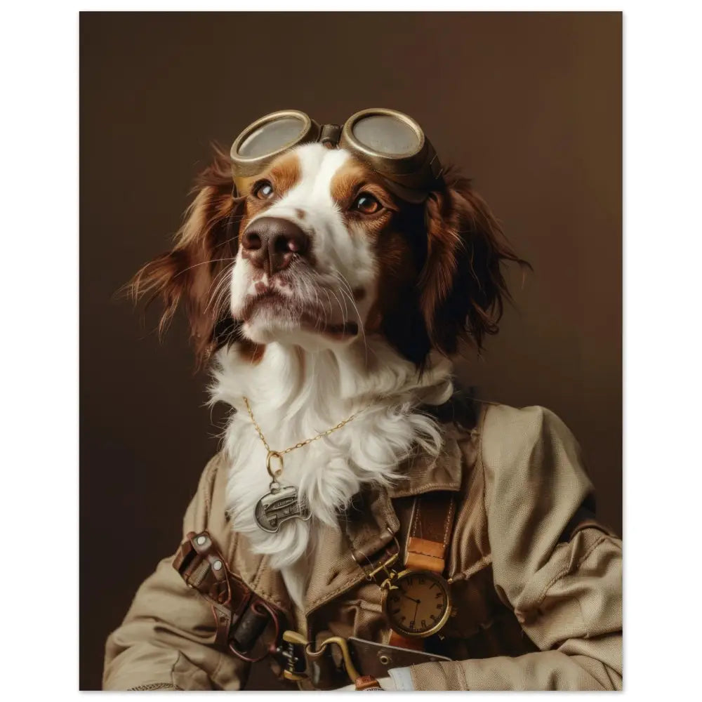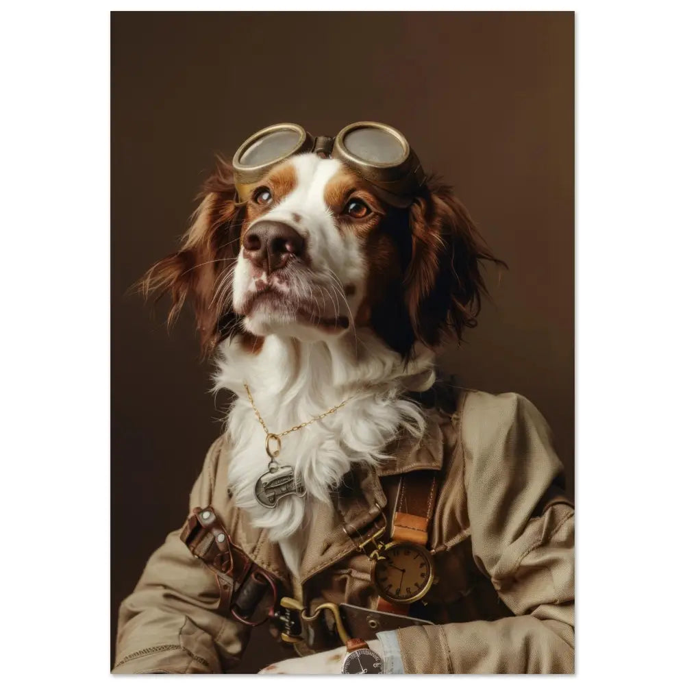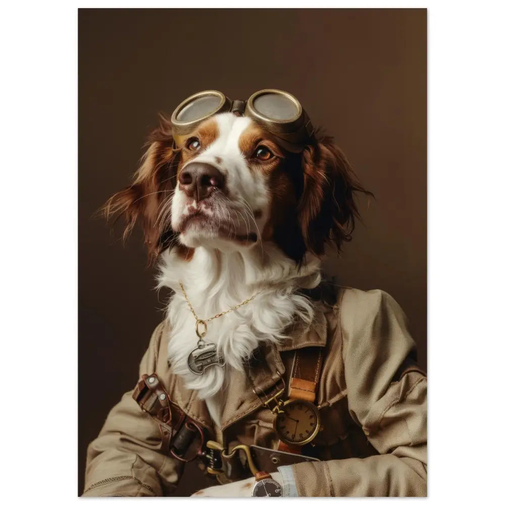 Deze afbeelding toont een hond, gekleed in een prachtige vintage steampunk outfit. Het draagt een gedetailleerde, beige jas met subtiele patronen en bruine leren accenten. Om de nek hangt een antieke gouden klok, die de historische allure benadrukt. De kop wordt gesierd door een paar grote, retro-futuristische brillen met metalen details in een robuuste bronzen kleur, waardoor de hond een mysterieuze en avontuurlijke uitstraling krijgt. De pootjes zijn voorzien van sierlijke manchetjes die het geheel perfectioneren. De achtergrond is eenvoudig en effen in een warme bruine tint, zodat alle aandacht naar de stijlvolle hond gaat.