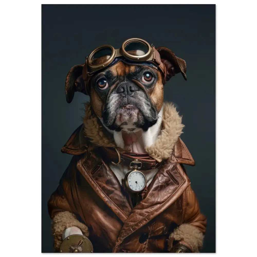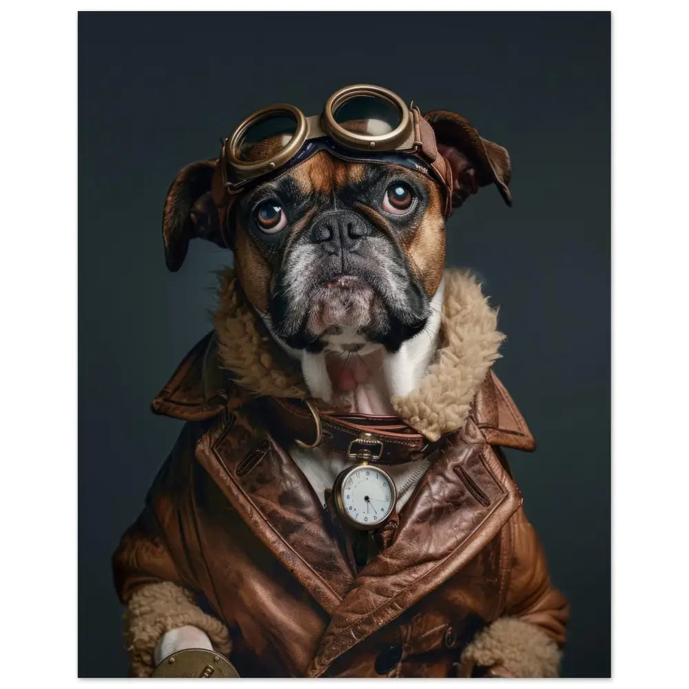 Deze afbeelding toont een dier, gekleed in een prachtige vintage steampunk outfit. Het draagt een robuuste, bruine leren jas met wijde revers en met bontachtige accenten langs de kraag en manchetten. Om de nek hangt een antieke gouden klok die een vleugje elegantie toevoegt aan zijn uitstraling. De kop van dit dier wordt geaccentueerd door een paar grote, met brons beklede retro-futuristische brillen, waarmee het de indruk wekt van een geduchte tijdreiziger. Verder zijn er leren riemen en metalen bouten als decoratieve details aanwezig. De achtergrond is smaakvol donker gehouden, waardoor het hoofdmotief sterk naar voren komt.