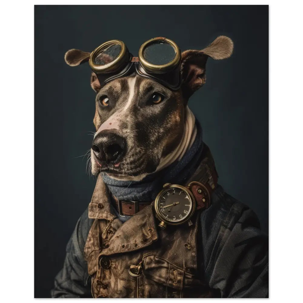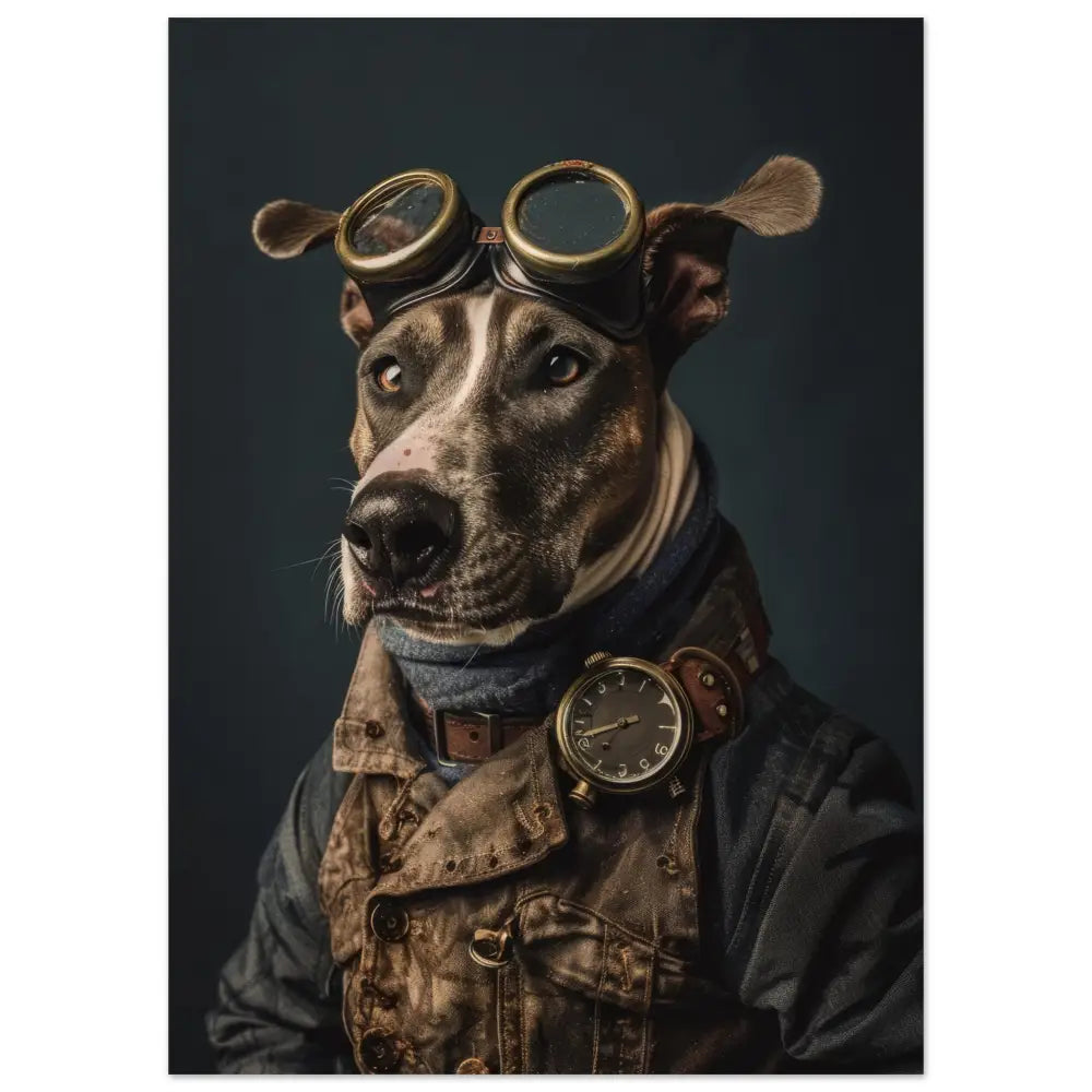 Deze afbeelding toont een dier, gekleed in een prachtige vintage steampunk outfit. Het draagt een verweerde, bruine leren jas met opvallende metalen knopen en subtiele gouden stiksels. Om de nek hangt een antieke zilveren klok met een zwarte wijzerplaat, die een tijdloze charme uitstraalt. De kop wordt gesierd door een paar grote, bronzen retro-futuristische brillen met stevige metalen details, wat de uitstraling van een stoere ontdekkingsreiziger geeft. Verder zijn de pootjes voorzien van donkere leren manchetjes met contrasterende stiksels, en dragen bij aan de ruwe uitstraling. De achtergrond is een eenvoudige, donkere tint, waardoor het dier extra opvalt.