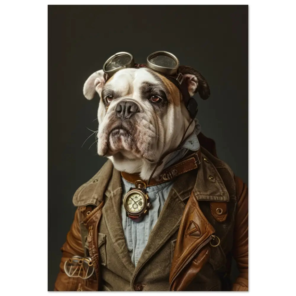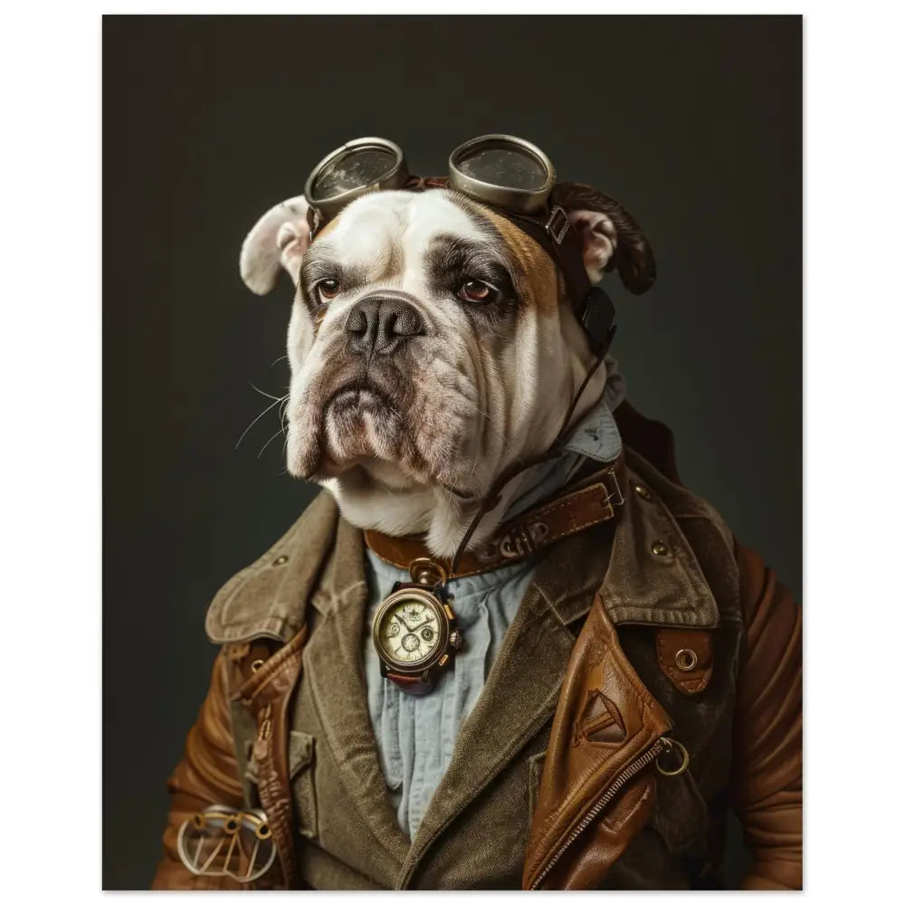 Deze afbeelding toont een dier, gekleed in een prachtige vintage steampunk outfit. Het draagt een olijfgroene jas met subtiele knopen en leren accentsluitingen. Om de nek hangt een antieke gouden klok, die prachtig afsteekt tegen de donkere vacht. De kop wordt gesierd door een paar grote, industriële bril met bronzen metalen details en dikke glazen, wat het dier een mysterieuze uitstraling geeft. De pootjes zijn voorzien van elegante, bruine leren manchetjes met stiksel in contrasterende kleuren. De achtergrond is donker en minimalistisch, waardoor de focus volledig op de gedetailleerde steampunk kleding van het dier ligt.