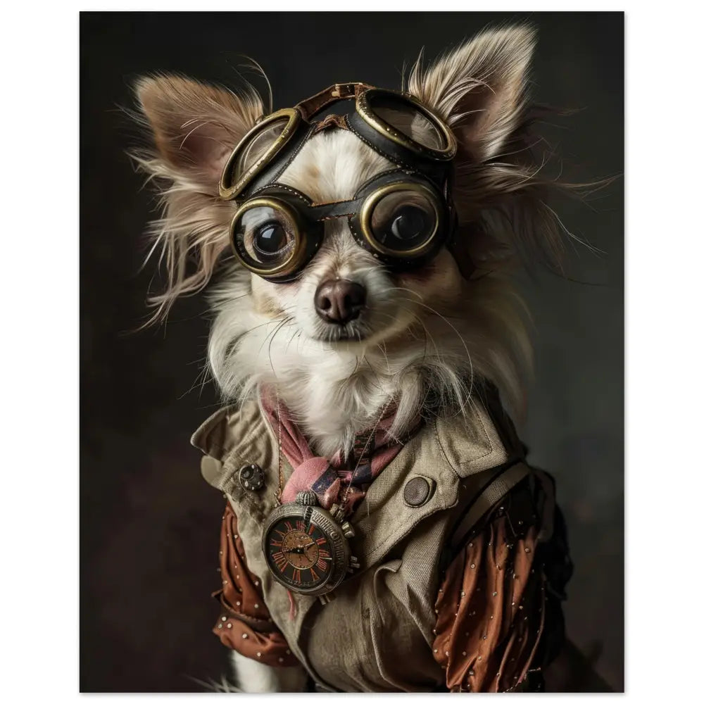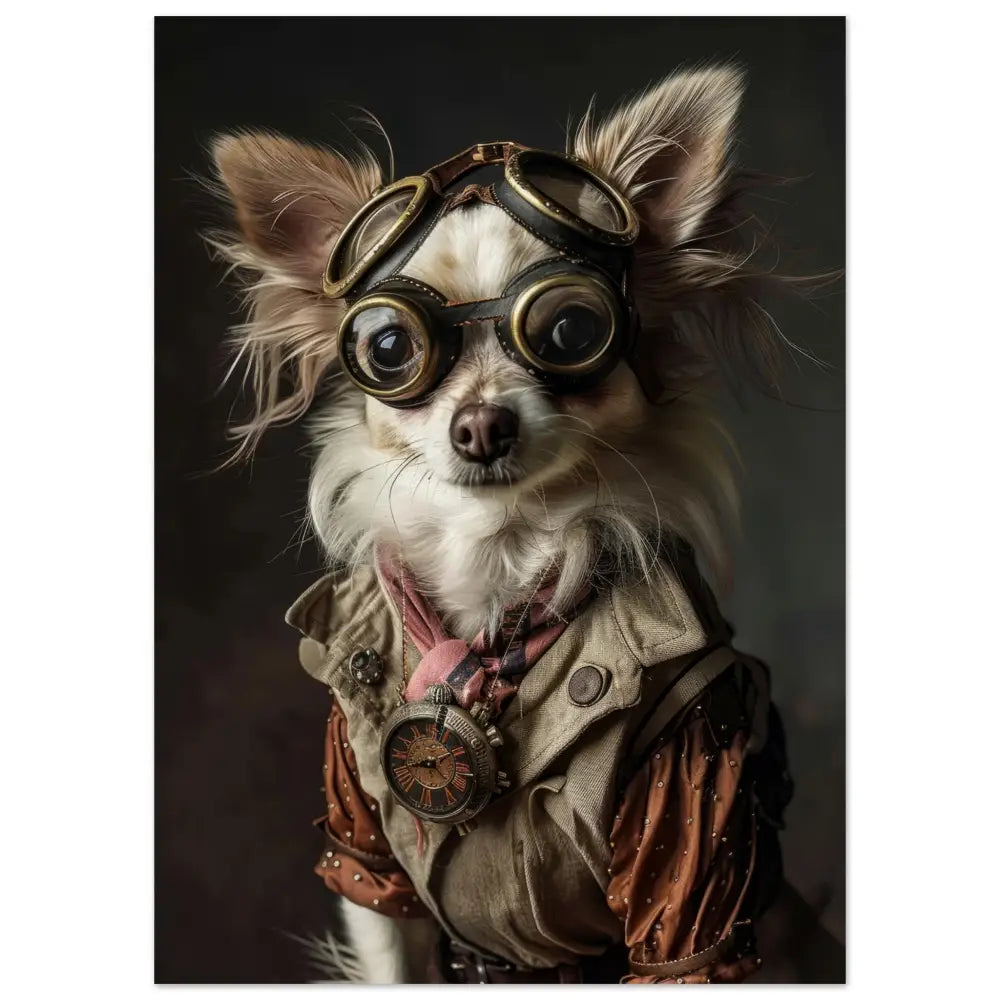 Deze afbeelding toont een hond, gekleed in een prachtige vintage steampunk outfit. De hond draagt een verfijnde beige jas met sierlijke knopen en subtiele stiksels die een vleugje elegantie toevoegen. Om de nek hangt een antieke bronzen klok, die de klassieke allure van het steampunk-thema benadrukt. De kop wordt gesierd door een paar grote, retro-futuristische brillen met metalen details in een donkerachtige tint, wat de hond een avontuurlijke en mysterieuze uitstraling geeft. De poten zijn voorzien van rode leren accenten die perfect contrasteren met de beige jas. De achtergrond is mysterieus donker, wat de hond nog meer benadrukt.