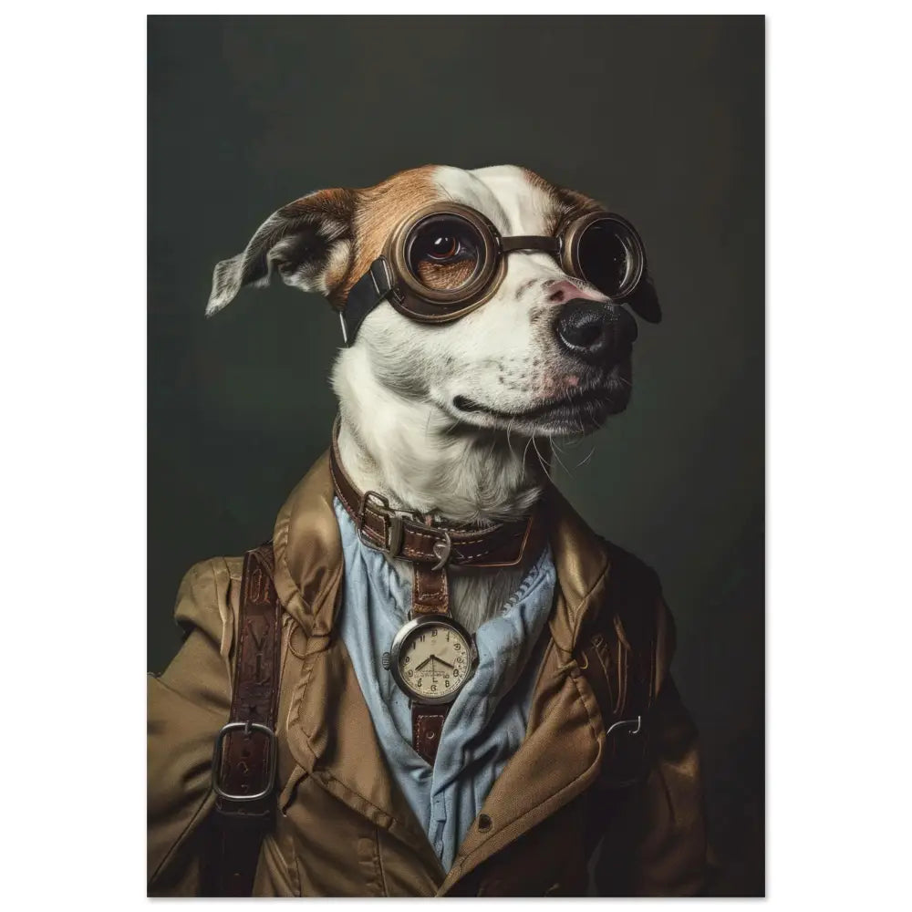 Deze afbeelding toont een hond, gekleed in een prachtige vintage steampunk outfit. Het draagt een elegante, bruine jas met subtiele, golvende patronen. Om de nek hangt een antieke, zilveren klok, die prachtig contrasteert met de donkere leren riem. De kop wordt gesierd door een paar grote, retro-futuristische brillen met bronzen metalen details, die de hond een avontuurlijke uitstraling geven. Het geheel wordt verder verfraaid door leren schouderriemen en subtiele stiksels die de outfit compleet maken. De afbeelding heeft een donkergrijze achtergrond, die de aandacht volledig op de stijlvolle hond richt.