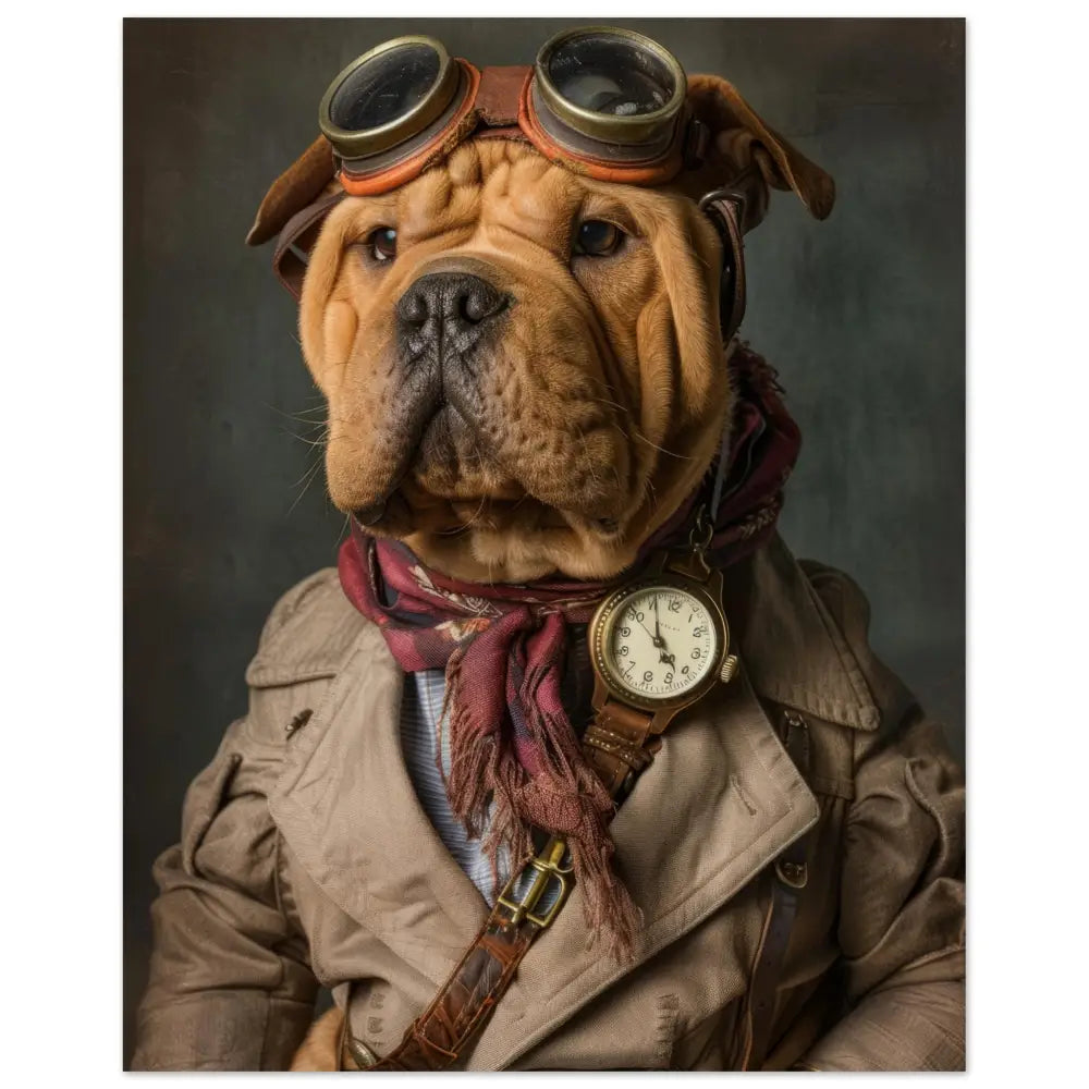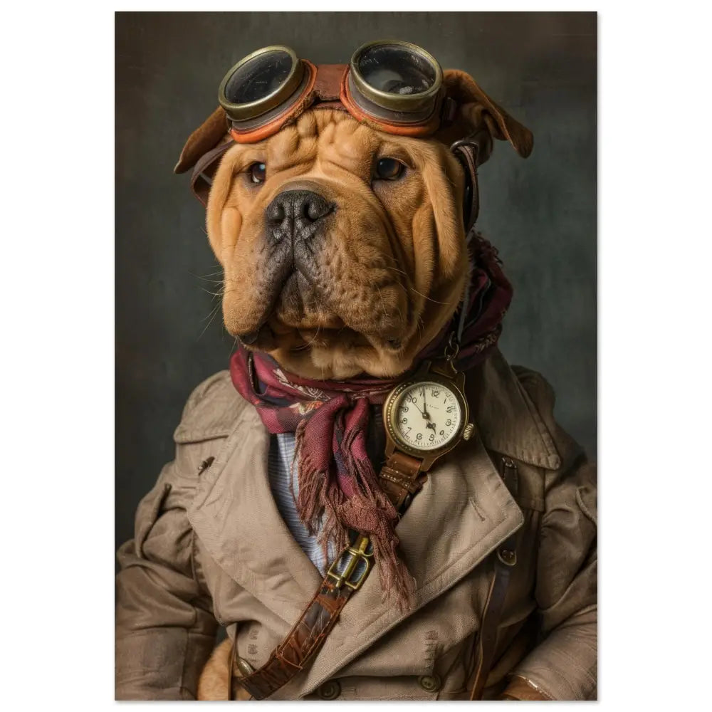 Deze afbeelding toont een dier, gekleed in een prachtige vintage steampunk outfit. Het draagt een verfijnde, zandkleurige jas met subtiele stiksels en elegante schouderepauletten. Om de nek hangt een antieke gouden klok, die de klassieke uitstraling benadrukt. De kop wordt gesierd door een paar imposante, bronzen retro-futuristische brillen met robuuste metalen details, waardoor deze eruitziet als een tijdreizende avonturier. De poten zijn voorzien van elegante, leren accenten die het geheel een authentieke, steampunk look geven. Op de achtergrond is een verweerde muur te zien, die de historiserende sfeer van het portret versterkt.