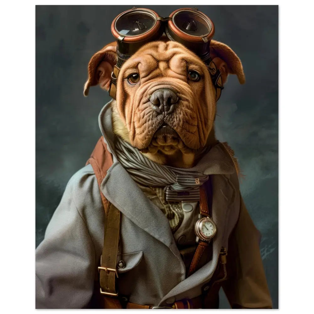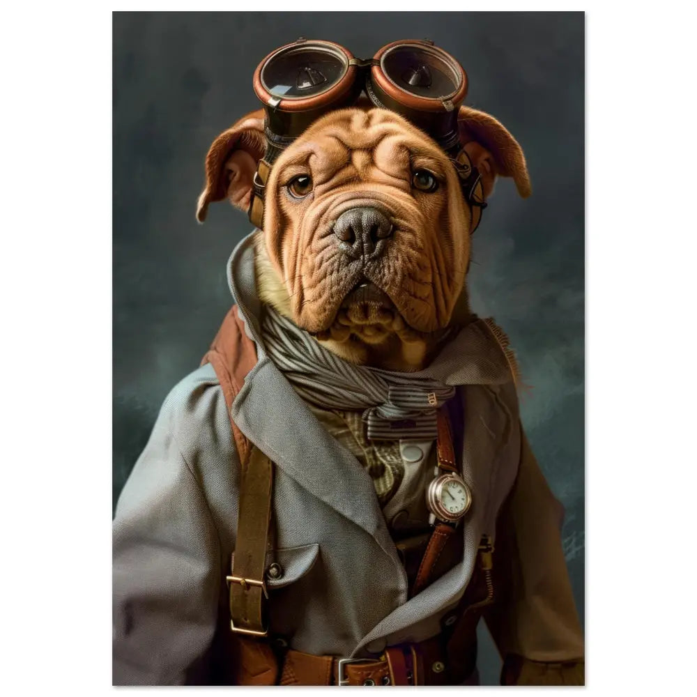 Deze afbeelding toont een dier, gekleed in een prachtige vintage steampunk outfit. Het draagt een stijlvolle, lichtgrijze jas met subtiele, geruite patronen en leren schouderstukken in een warme bruine tint. Om de nek van de hond hangt een antieke zilveren klok die elegant afsteekt tegen de jas. Bovenop het hoofd prijkt een paar imposante, retro-futuristische brillen met metalen details in koperkleur, wat het geheel een avontuurlijke sfeer geeft. De pootjes worden extra geaccentueerd door leren accenten en gedetailleerde stiksels. De achtergrond gaat over in een mysterieuze, donkergrijze mist, waardoor het portret een intrigerende uitstraling krijgt.