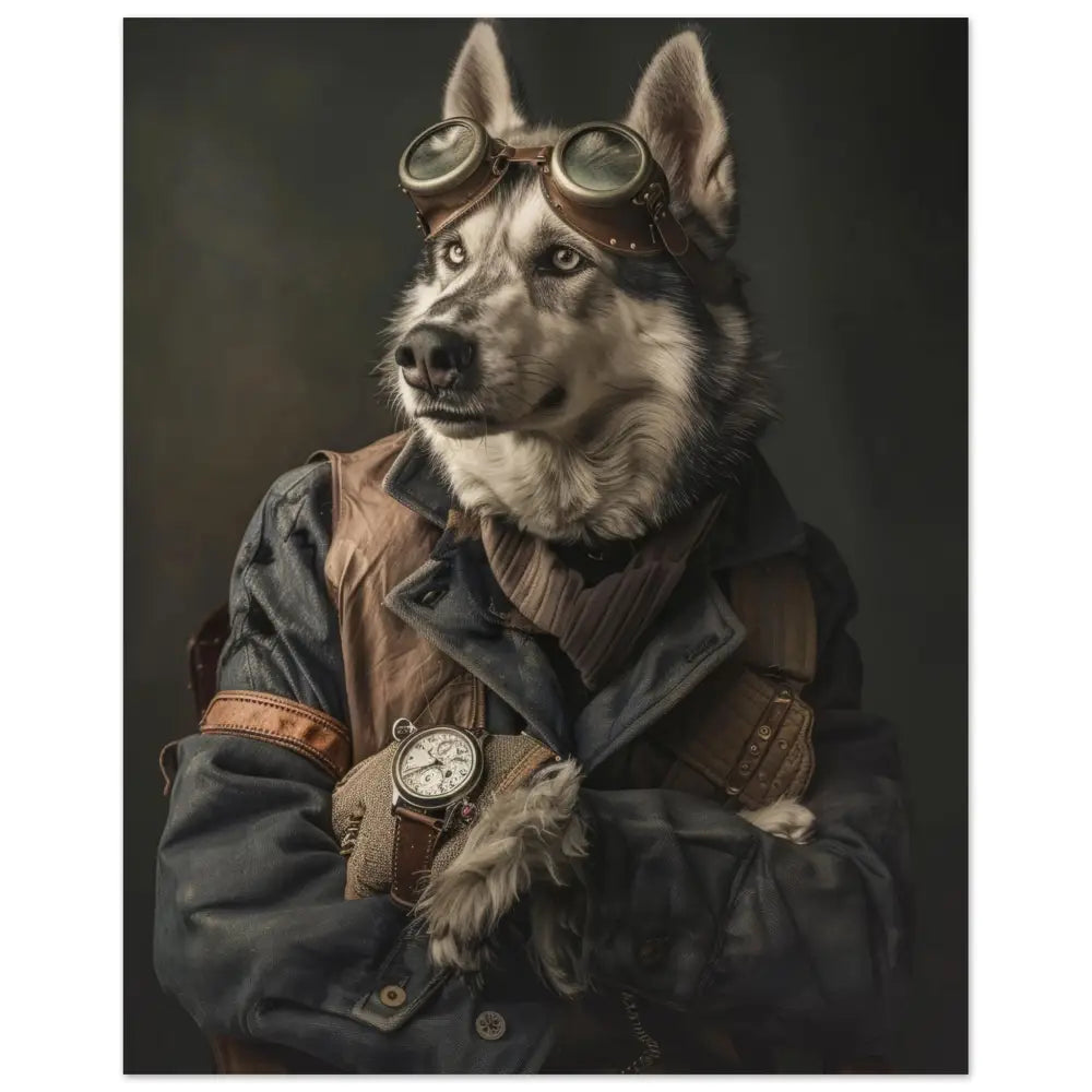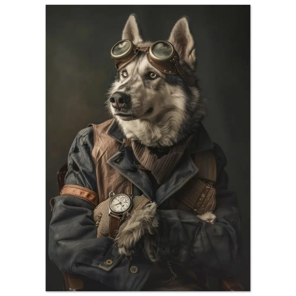 Deze afbeelding toont een dier, gekleed in een prachtige vintage steampunk outfit. Het draagt een elegante donkerblauwe jas met subtiele stiksels en leren accenten. Om de poot heeft het dier een antieke zilveren klok, die strak bevestigd is met een leren riem en bijdraagt aan de charmante retro-uitstraling. Op het hoofd prijken een paar grote steampunk-brillen met bronzen metalen details, wat de avontuurlijke vibe versterkt. De pootjes zijn versierd met grijze, bontachtige manchetjes, die de outfit compleet maken. De achtergrond is artistiek wazig, waardoor de aandacht volledig op het imposante dier in zijn gedetailleerde outfit blijft.