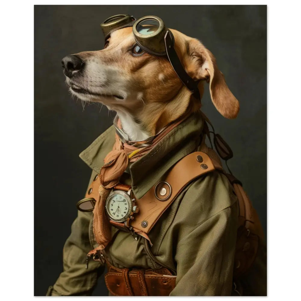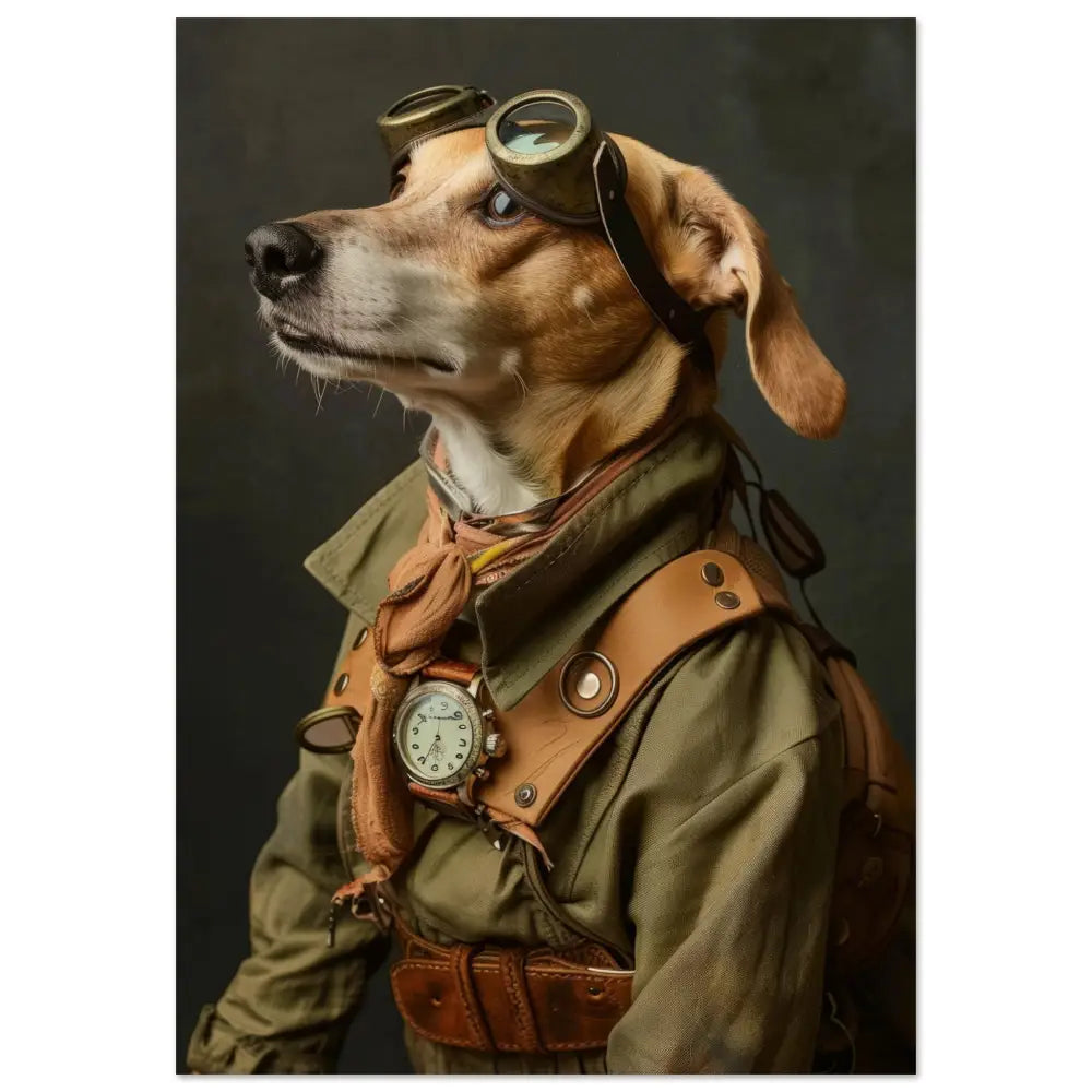 Deze afbeelding toont een dier, gekleed in een prachtige vintage steampunk outfit. Het draagt een stijlvolle, olijfgroene jas met subtiele stiksels en fraaie leren accenten. Om de nek hangt een antieke, bronzen klok die de elegantie van het ensemble benadrukt. De kop wordt gesierd door een stoere bril met metalen details in een verweerde kopertint, wat het geheel een avontuurlijke uitstraling geeft. De pootjes hebben verfijnde bontachtige manchetjes, en de leren riemen voegen een extra laag van intrige toe. De achtergrond is eenvoudig en donker, waardoor het dier en zijn gedetailleerde outfit scherp in de schijnwerpers staan.