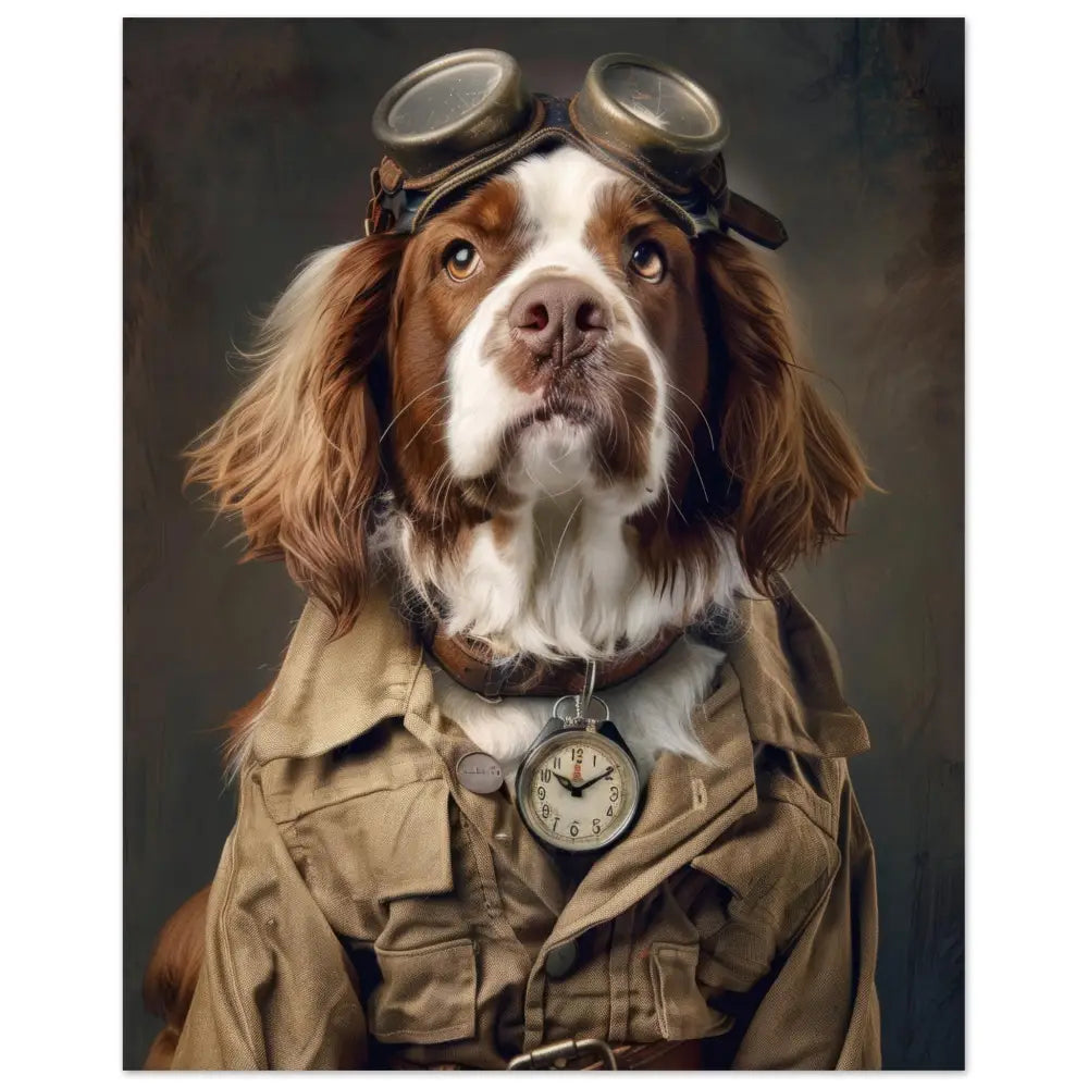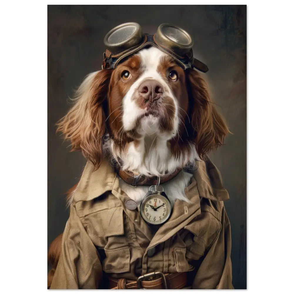 Deze afbeelding toont een hond, gekleed in een prachtige vintage steampunk outfit. De hond draagt een elegante, beige jas met zakken en subtiele stiksels die structuur toevoegen aan het ontwerp. Om de nek hangt een antieke zilveren klok, die perfect contrasteert met de warme tinten van de jas. Op het hoofd prijkt een groot paar retro-futuristische brillen met bronzen metalen details, wat de hond een gedistingeerde tijdreizigersuitstraling geeft. De pootjes zijn afgewerkt met bontachtige manchetjes en leren accenten. De achtergrond van de afbeelding is sfeervol gedecoreerd met donkere, industriële elementen, waardoor de steampunk sfeer compleet is.