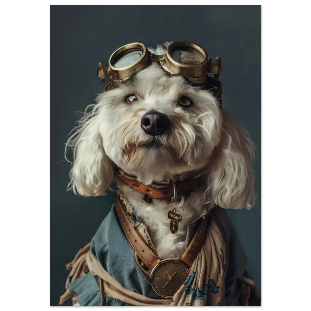 Deze afbeelding toont een dier, gekleed in een prachtige vintage steampunk outfit. Het draagt een elegante, blauwe jas met subtiele patronen en zachte stoffen. Om de nek hangt een antieke bronzen klok, die perfect contrasteert met de dikke, witte vacht van het dier. Het hoofd van het dier wordt gesierd door een opvallende steampunk bril met robuuste metalen details in een messing kleur. Verder zijn er leren accenten en riemen, die samen een decoratief geheel vormen. De achtergrond is eenvoudig gehouden, met verzachte tinten die de focus op het modieuze en futuristische uiterlijk van het dier versterken.