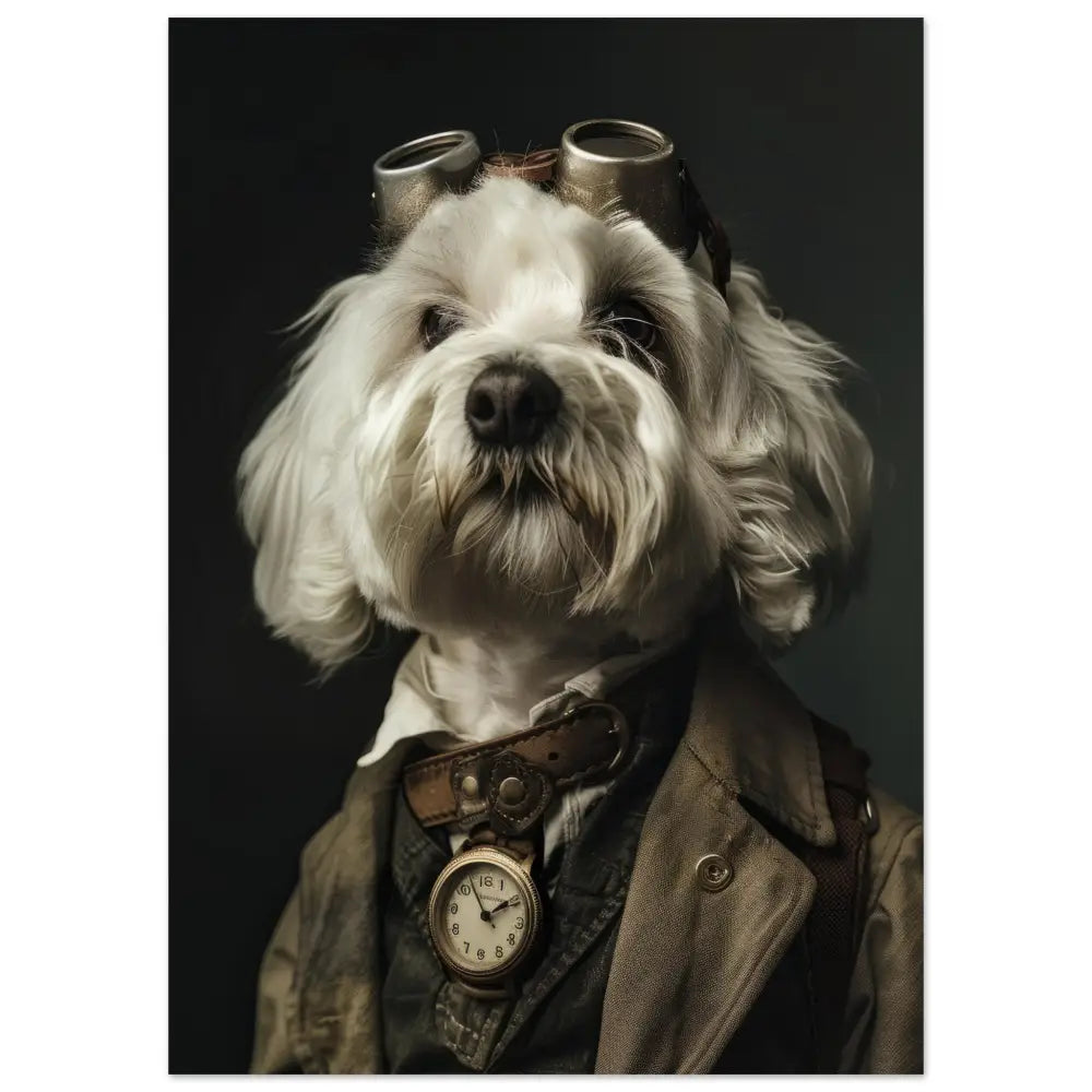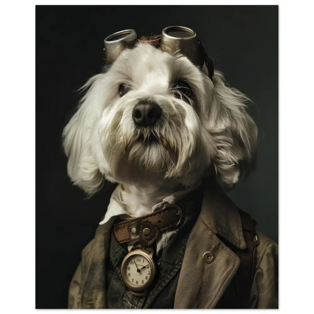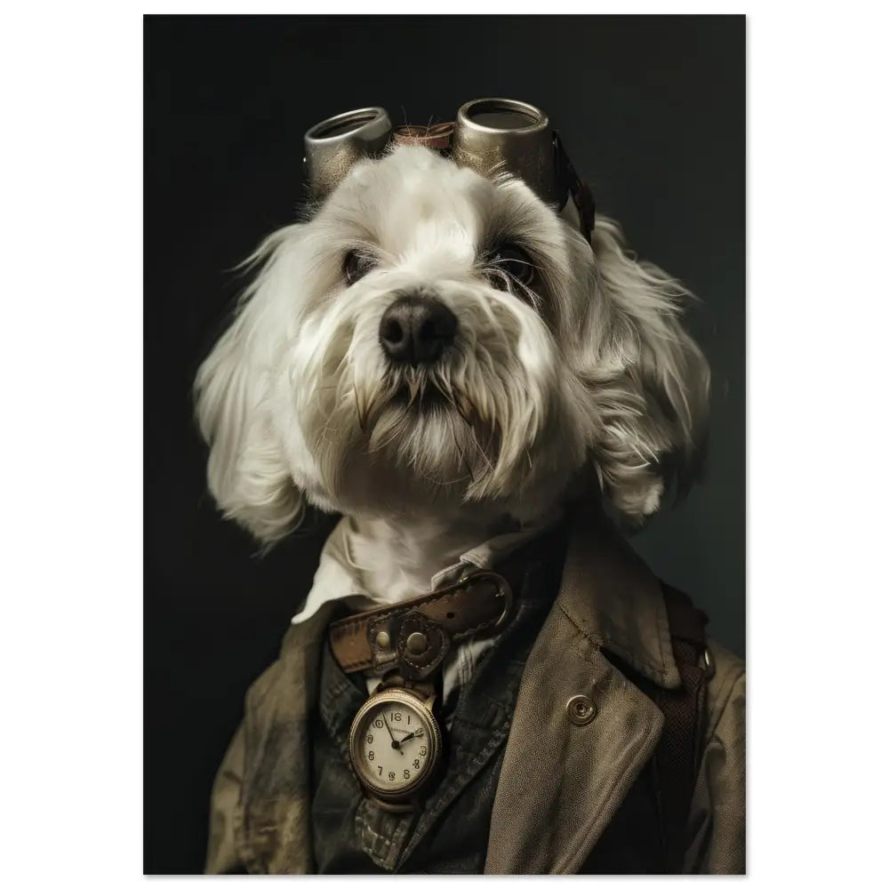 Deze afbeelding toont een dier, gekleed in een prachtige vintage steampunk outfit. Het draagt een elegante, beige jas met subtiele, ingewikkelde patronen en messingkleurige accenten. Om de nek hangt een antieke gouden klok, die de klassieke uitstraling accentueert. De kop wordt gesierd door een paar robuuste, metalen brillen in bronskleur, wat het een futuristisch tintje geeft. De pootjes zijn afgewerkt met leren, donkere manchetjes die de outfit compleet maken. De achtergrond is donker en ingetogen, wat de aandacht volledig op het stijlvol geklede dier vestigt.