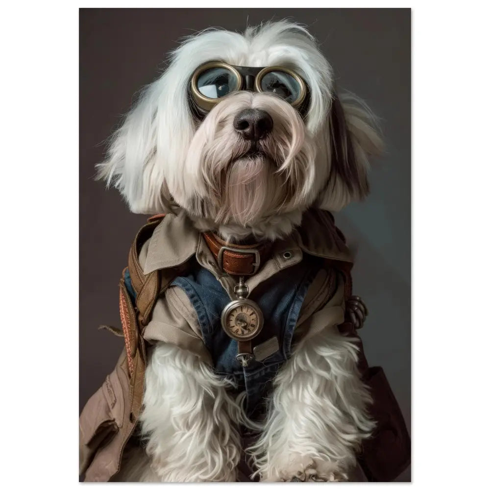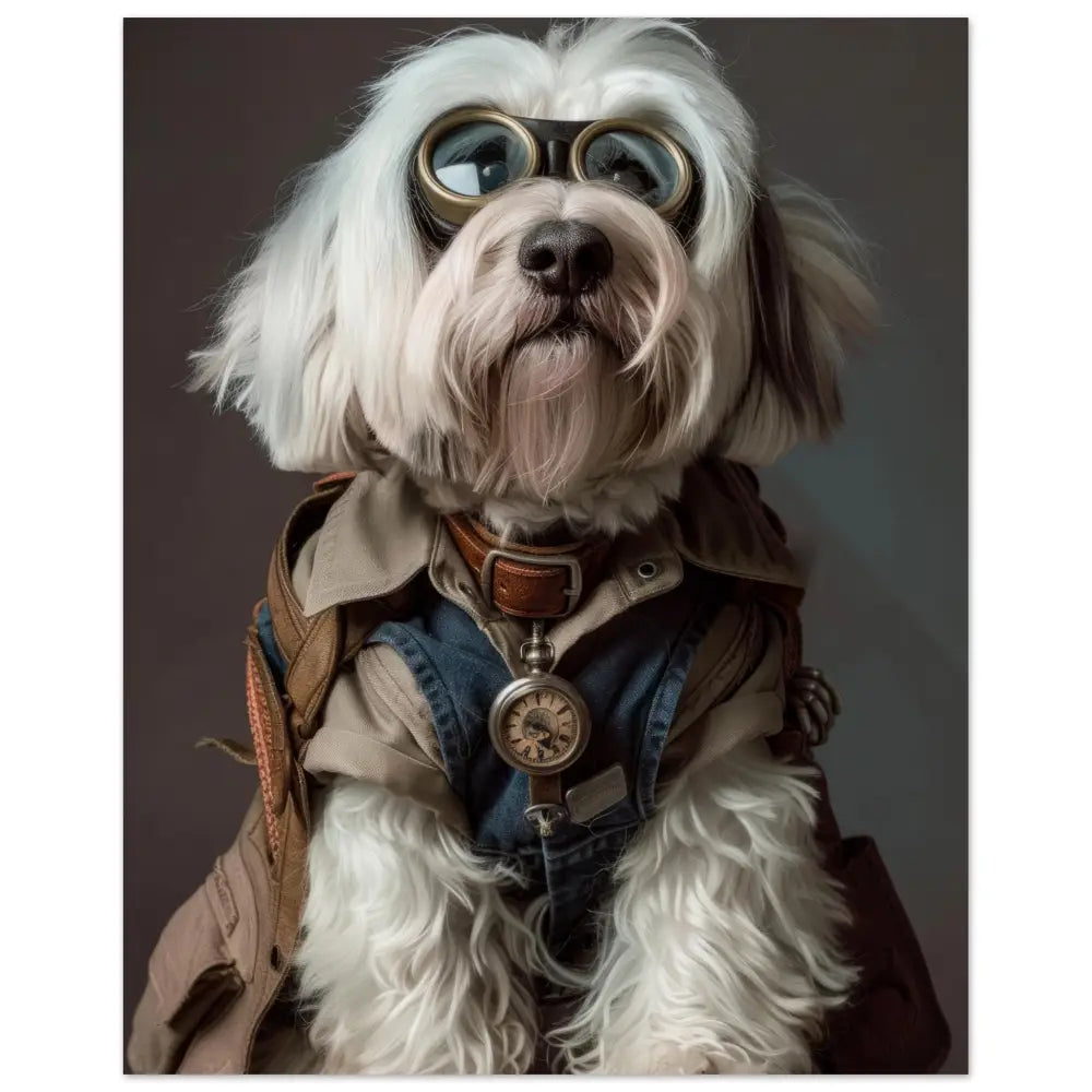 Deze afbeelding toont een dier, gekleed in een prachtige vintage steampunk outfit. Het draagt een stijlvolle, beige jas met subtiele, sierlijke patronen en leerachtige accenten. Om de nek hangt een antieke bronzen klok, die de nostalgische charme versterkt. De kop wordt gesierd door een paar grote, retro-futuristische brillen met metalen details in koperkleur, wat een avontuurlijke tijdreiziger aura geeft. De pootjes zijn versierd met verfijnde, donzige, witte bontachtige manchetjes die het geheel perfect afmaken. De achtergrond is donker en minimalistisch, waardoor alle aandacht naar de gedetailleerde steampunk outfit van het dier gaat.