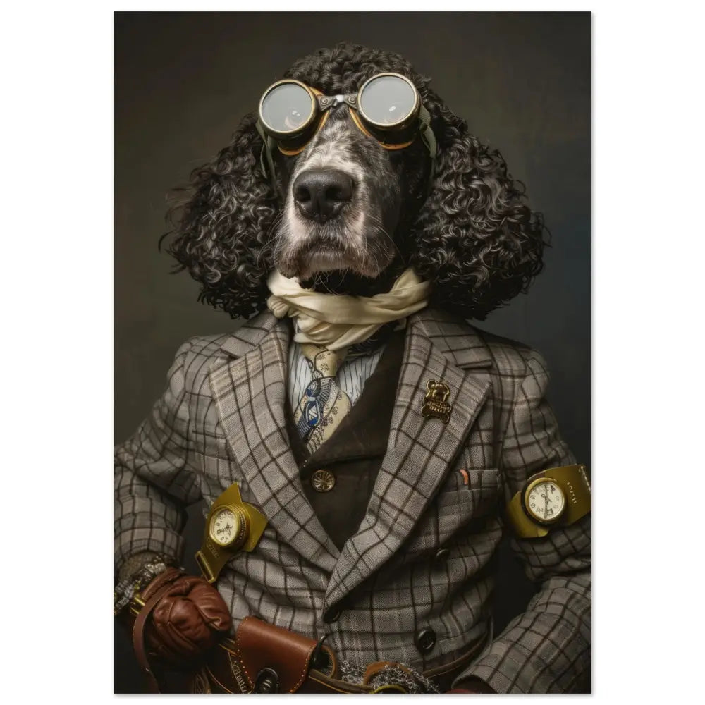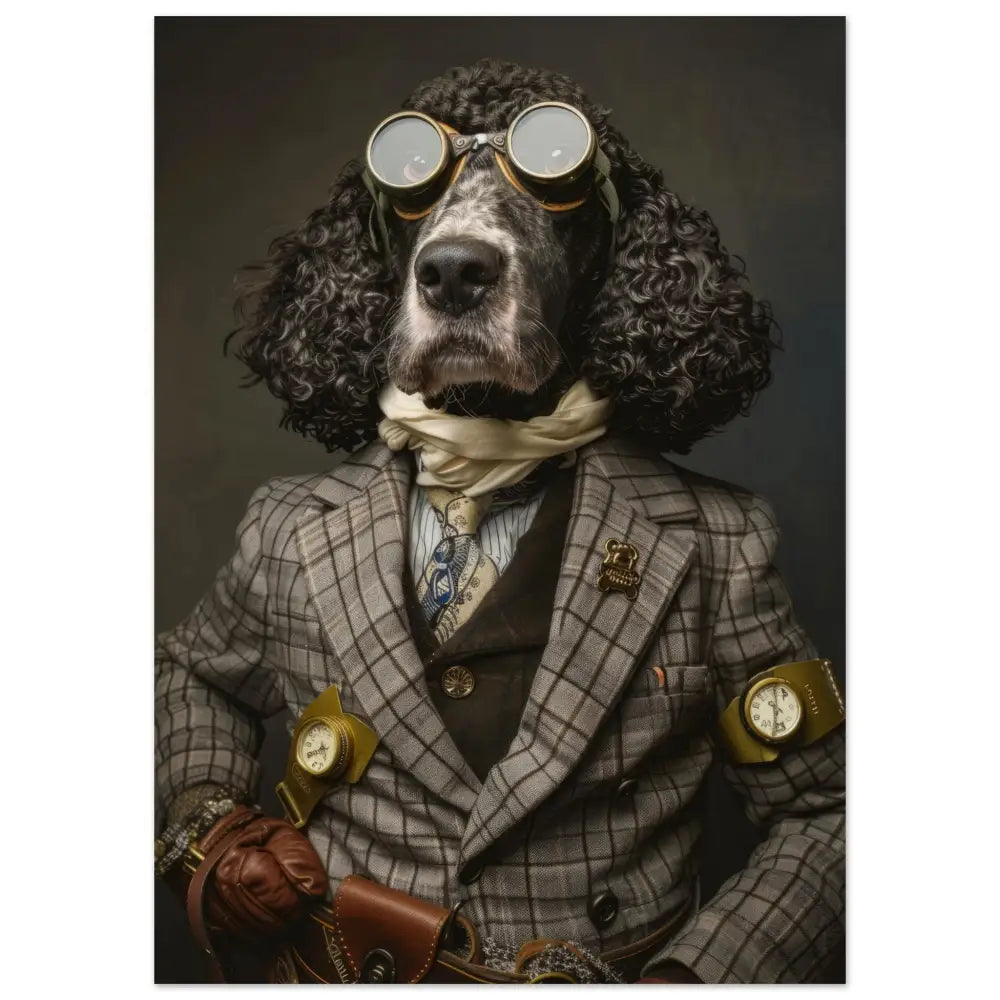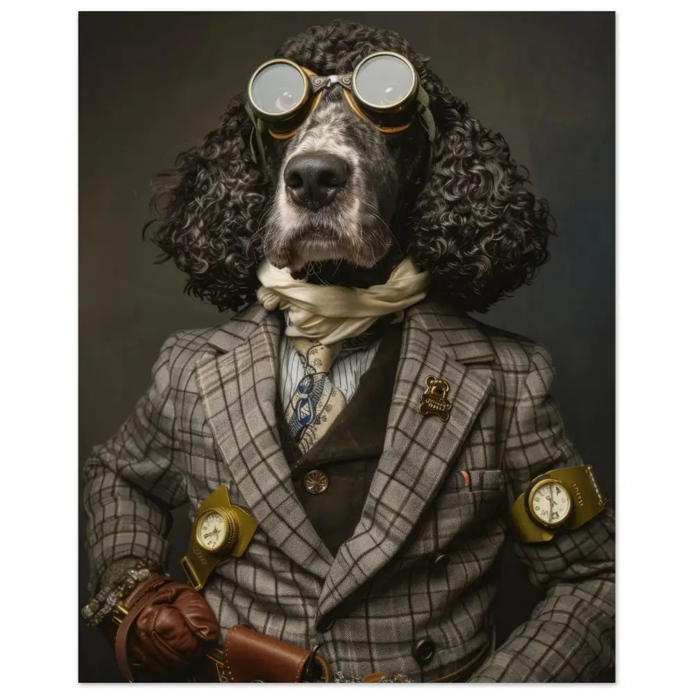 Deze afbeelding toont een dier, gekleed in een prachtige vintage steampunk outfit. Het draagt een stijlvolle grijze geruite jas met fijn geweven patronen en subtiele knopen. Om de nek van het dier hangt een antieke gouden klok, die een elegant accent toevoegt. De bruin gekrulde kop wordt gesierd door een grote, retro-futuristische bril met bronzen metalen details, die het een gedistingeerde uitstraling geeft. De pootjes zijn voorzien van chique, bruin leren manchetjes die het ensemble versterken. De achtergrond is donker en mysterieus, waardoor de indruk van een ongelooflijk tijdreiziger uit een verleden dat nooit bestond wordt gewekt.
