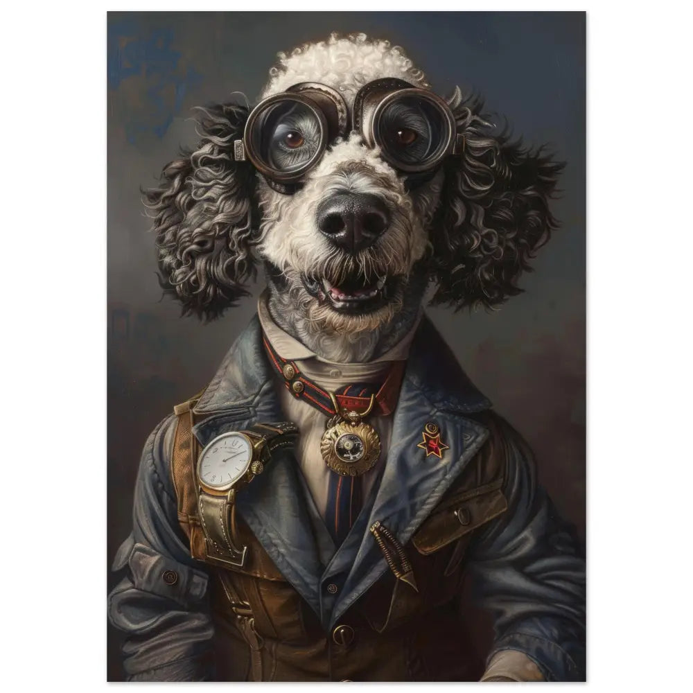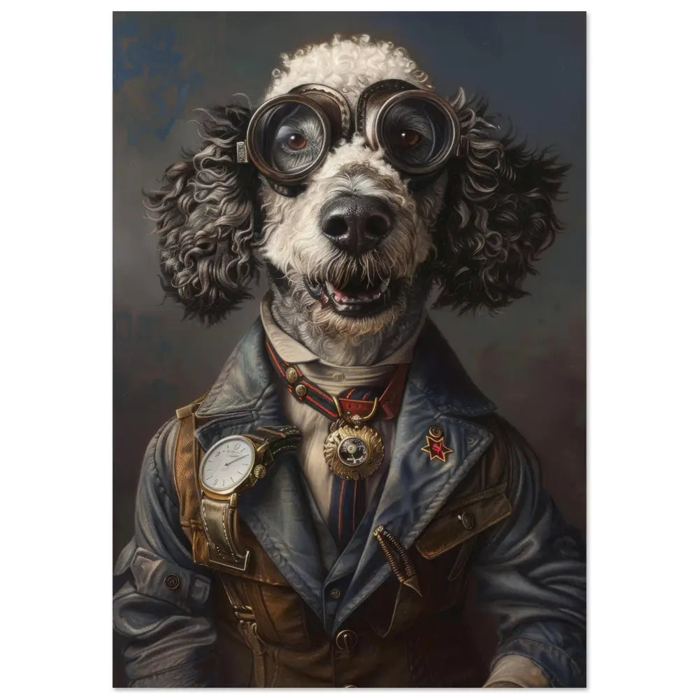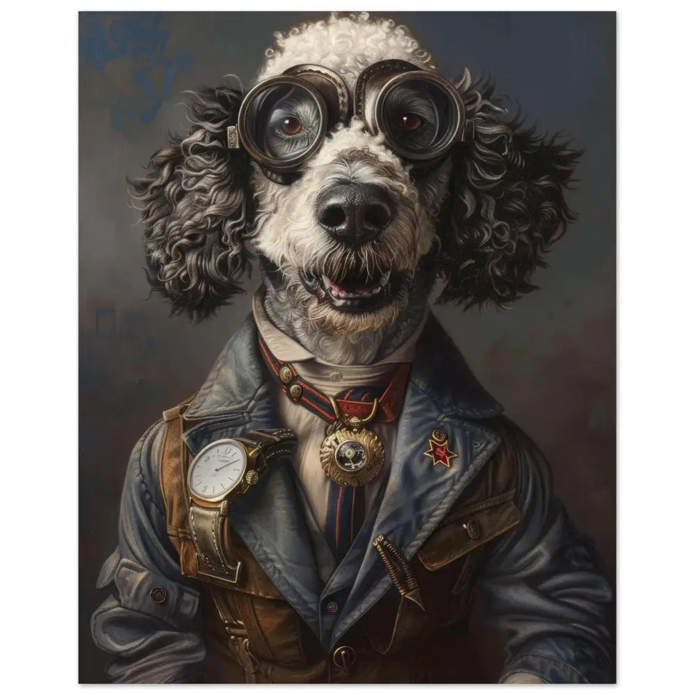 Deze afbeelding toont een dier, gekleed in een prachtige vintage steampunk outfit. Het draagt een elegante, blauw lederen jas met gepolijste koperen accenten en donkeren patronen. Om de nek hangt een antieke zilveren klok, die de omhulling van tijd en historie symboliseert. De kop wordt gesierd door een paar grote, steampunk brillen met robuuste, bronzen metalen details, waardoor deze eruitziet als een ontdekkingsreiziger in alternatieve realiteiten. De pootjes zijn versierd met leren manchetjes, gecombineerd met subtiele stiksels die het geheel verfijnen. De achtergrond is mysterieus met vage, donkere tinten, die een gevoel van avontuur en tijdloosheid oproepen.