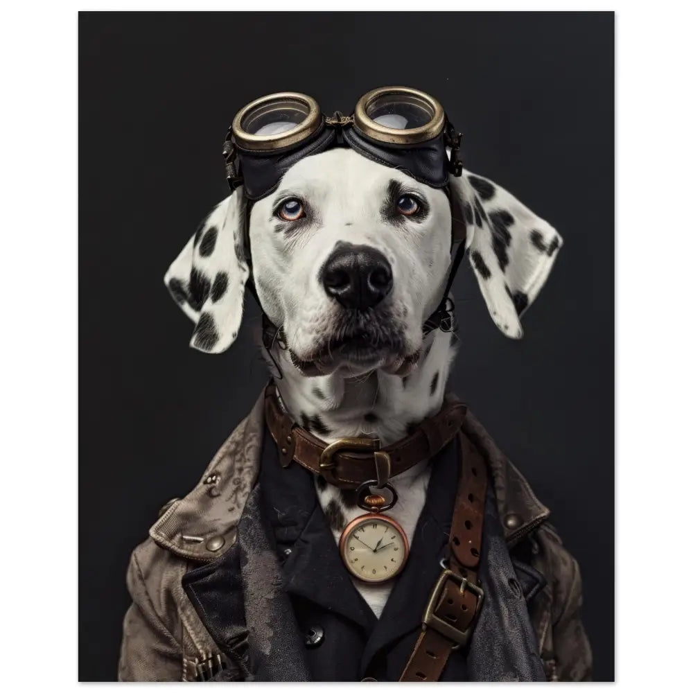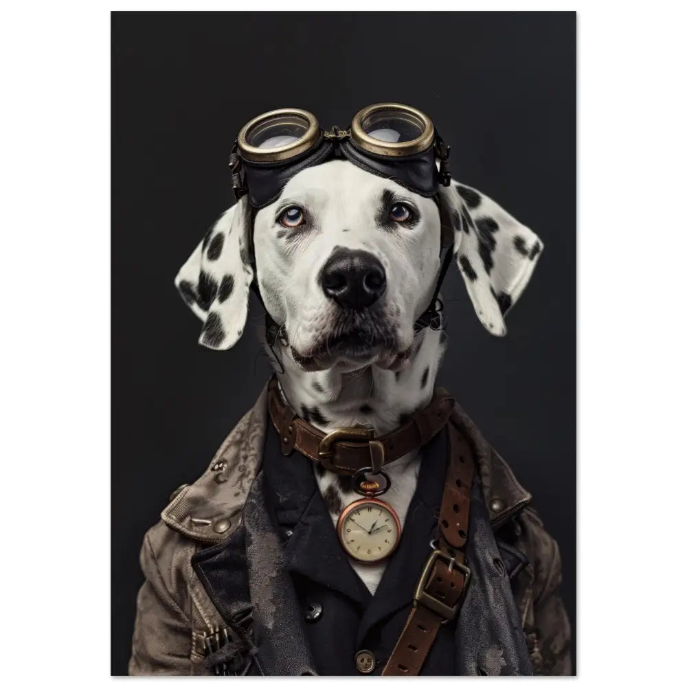 Deze afbeelding toont een dier, gekleed in een prachtige vintage steampunk outfit. Het draagt een verfijnde, grijze jas met subtiele metalen accenten en versleten details, die een doorleefd karakter uitstralen. Om de nek hangt een antieke zakhorloge met een bronzen kast, wat de klassieke uitstraling compleet maakt. De kop van het dier wordt gesierd door een robuuste, leren bril met goudkleurige metalen details, wat het een dappere ontdekker doet lijken. De pootjes hebben stoere, leren bandjes met contrasterende stiksels, terwijl de achtergrond een donker, mysterieus palet toont, waardoor de focus volledig op het indrukwekkende dier ligt.