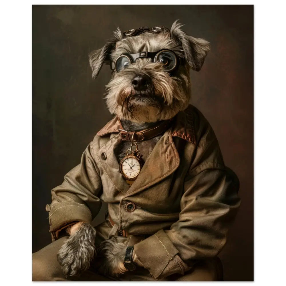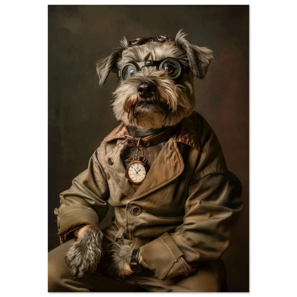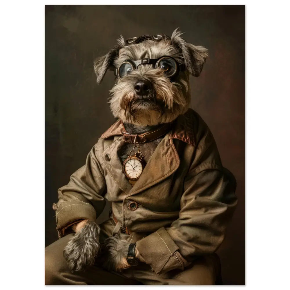 Deze afbeelding toont een dier, gekleed in een prachtige vintage steampunk outfit. De hond draagt een stijlvolle, olijfgroene jas met subtiele knopen en contrasterende stiksels. Om de nek hangt een antieke gouden klok, die verfijning en tijdloze charme uitstraalt. De kop wordt gesierd door een groot paar, indrukwekkende brillen met robuuste metalen details in bronzen tinten, die de indruk wekken van een ingenieuze uitvinder. De polsen zijn versierd met donkere leren accenten en luxe bontachtige manchetjes. De achtergrond heeft een mysterieus, industrieel patroon, waardoor het geheel een intrigerende, historische sfeer uitstraalt.