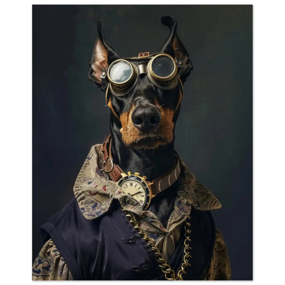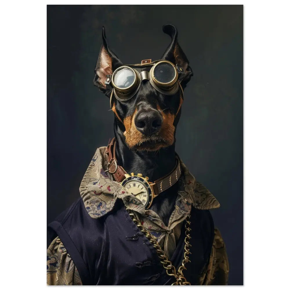 Deze afbeelding toont een dier, gekleed in een prachtige steampunk outfit. Het draagt een elegante, donkerblauwe jas met gedetailleerde patronen en brokaat accenten, die een tijdloze verfijning uitstralen. Om de nek van de hond hangt een antieke, gouden klok aan een stevige leren band, die de klassieke stijl benadrukt. De kop wordt gesierd door een paar grote, retro-futuristische brillen met bronskleurige metalen details, die het een avontuurlijke uitstraling geven. De pootjes zijn voorzien van luxe leren manchetjes en subtiele contrasterende stiksels. De achtergrond is donker en mysterieus, wat perfect past bij de steampunk-essentie van deze afbeelding.