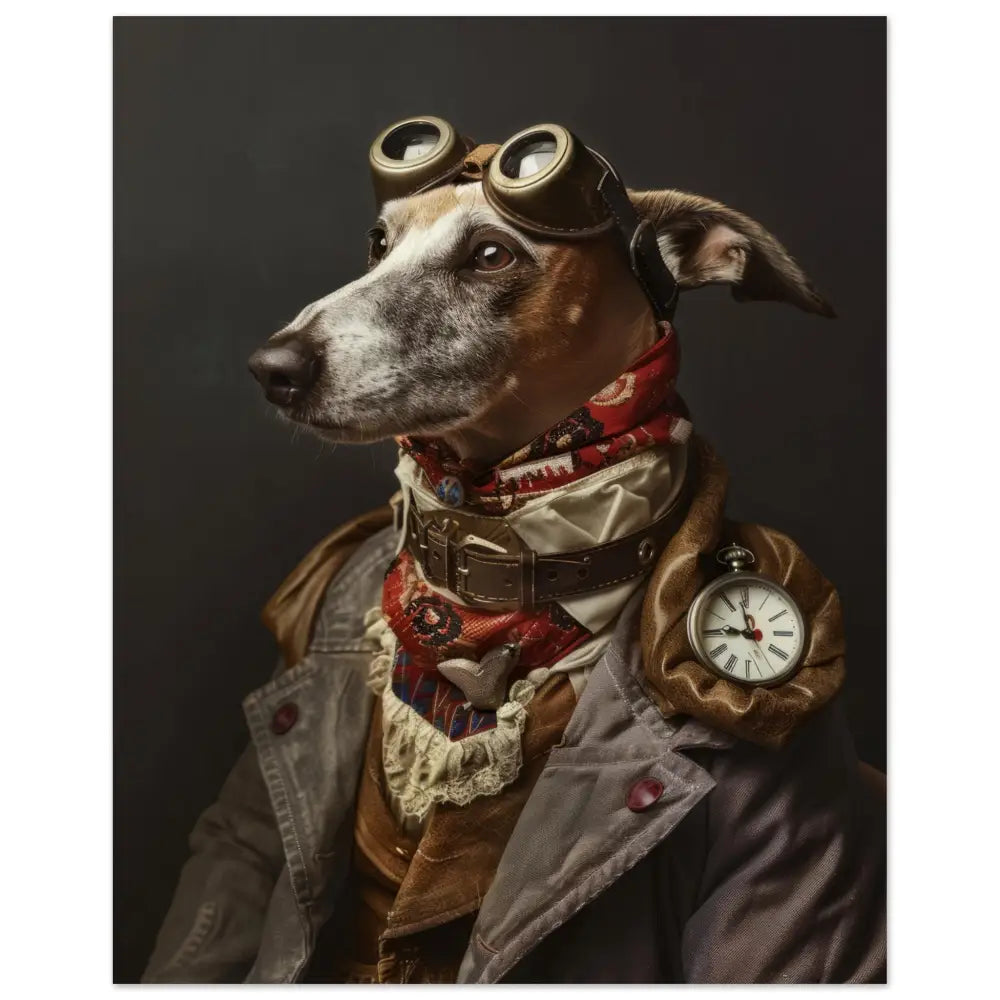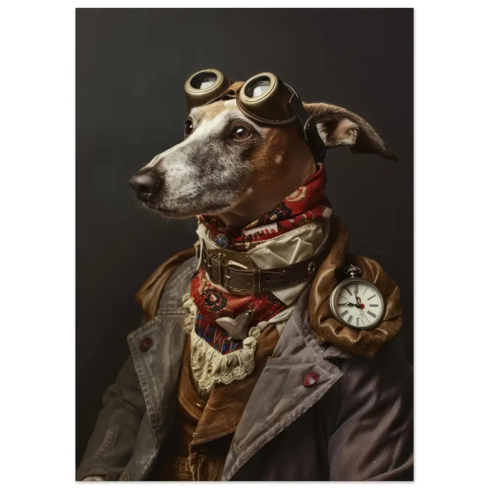 Deze afbeelding toont een elegant dier, gekleed in een prachtige vintage steampunk outfit. Het draagt een grijze jas met rijke, bruine accenten en gedetailleerde stiksels, die een oude maar verfijnde uitstraling geven. Om de nek hangt een antieke zilveren zakhorloge, wat een vleugje nostalgie toevoegt aan de look. Op het hoofd prijkt een paar grote, bronzen bril met ingewikkelde metalen details, die een futuristische flair geven. De pootjes zijn afgewerkt met elegant, wit kant en leren accessoires, wat een perfecte balans tussen stijl en avontuur creëert. De achtergrond is donker en eenvoudig, waardoor de focus volledig op het prachtig geklede dier ligt.