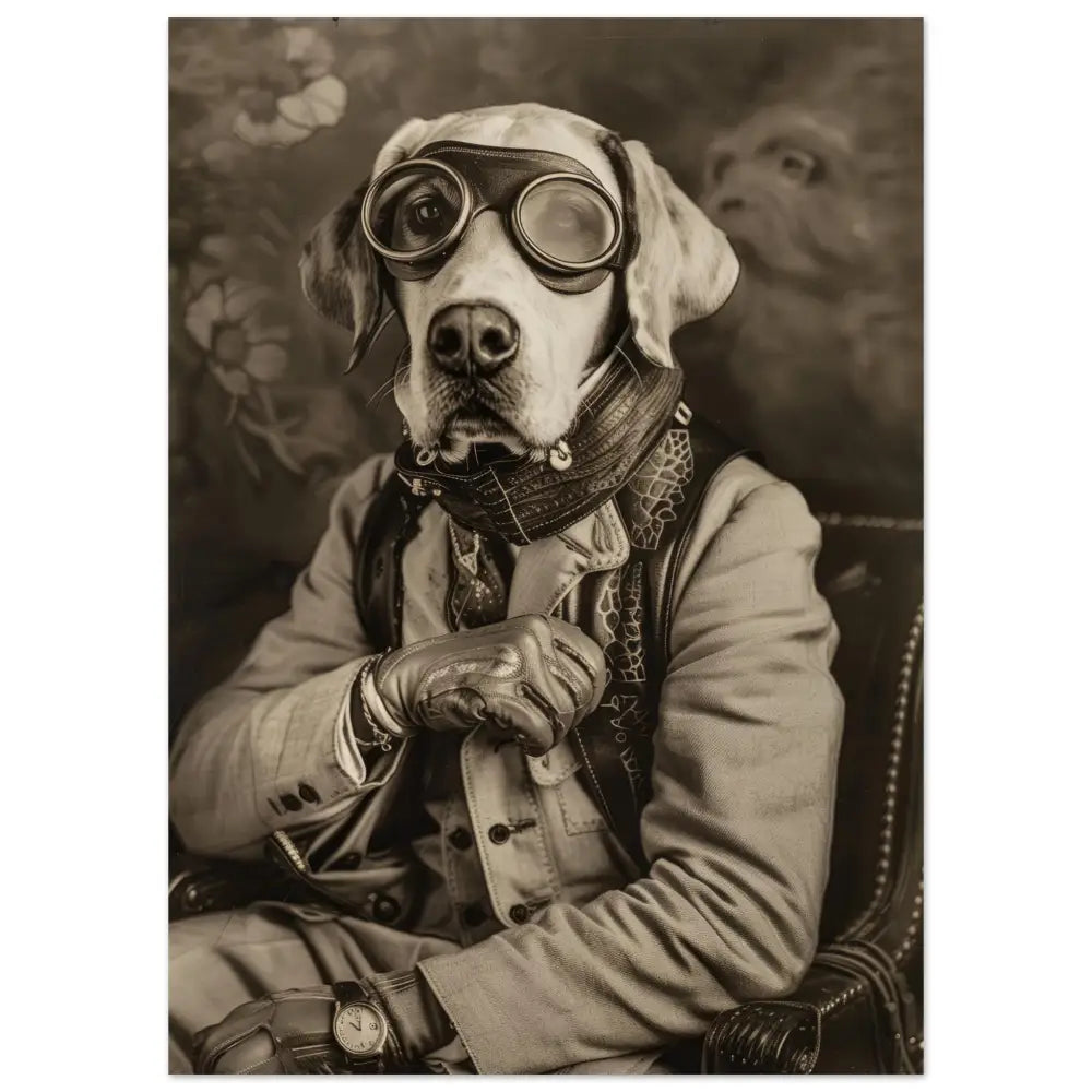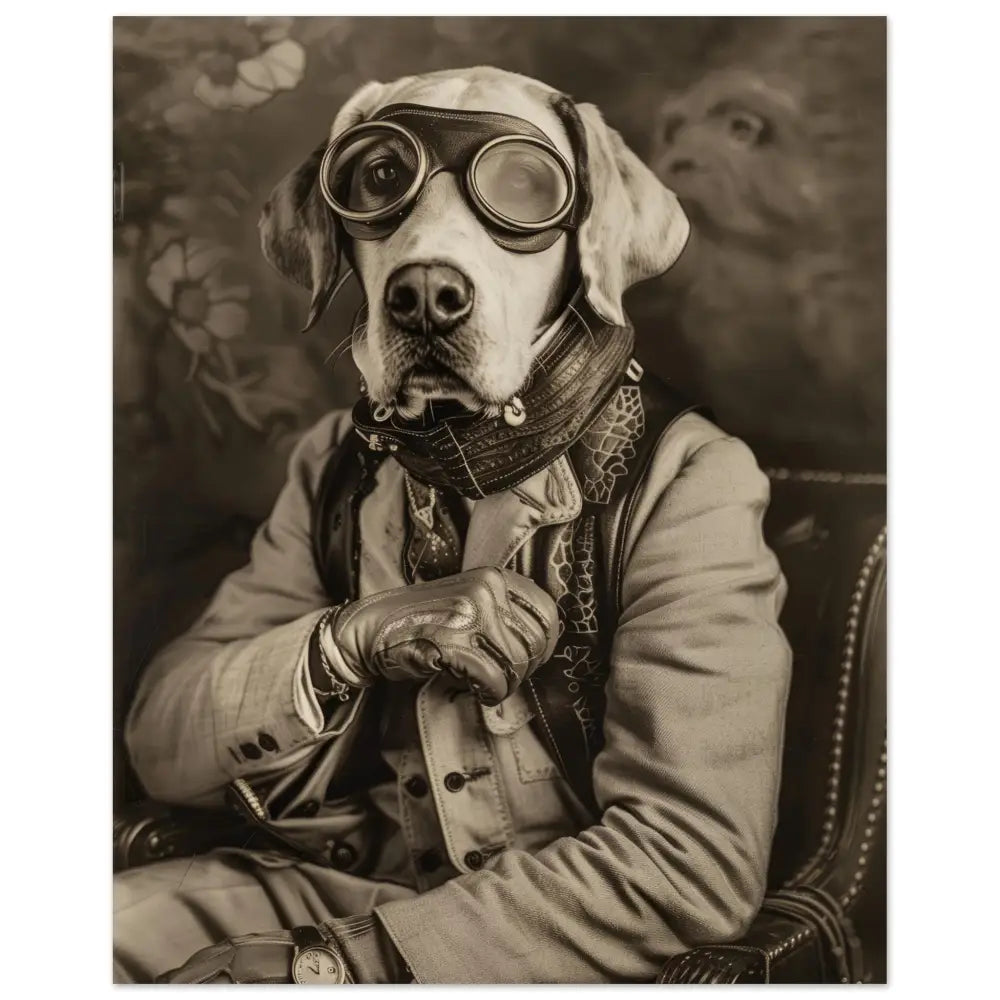 Deze afbeelding toont een dier, gekleed in een prachtige vintage steampunk outfit. Het draagt een sierlijke, beige jas met intricate patronen en subtiele stiksels. Om de nek hangt een antieke klok met een koperen behuizing, die klassieke elegantie uitstraalt. De kop wordt gesierd door een paar opvallende, retro-futuristische brillen met metalen details in een donkere bronzen tint, waardoor het eruitziet als een avontuurlijke tijdreiziger. De pootjes zijn voorzien van verfijnde leren handschoenen met contrasterende stiksels, die het geheel afmaken. De achtergrond geeft een romantische toets door het subtiele bloemenbehang, dat het historische thema versterkt.