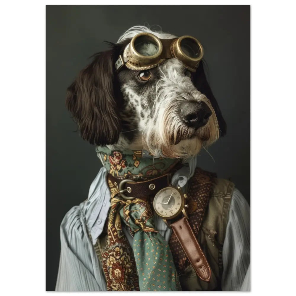 Deze afbeelding toont een dier, gekleed in een prachtige vintage steampunk outfit. Het draagt een gedistingeerde, beige jas met subtiele patronen en leren accenten. Om de nek hangt een antieke, gouden klok die bijdraagt aan de klassieke uitstraling. De kop wordt gesierd door een paar grote, robuuste brillen met metalen details in bronskleur, die het een ontdekkingsreizigerachtige uitstraling geven. De pootjes zijn afgewerkt met leren manchetjes en contrasterende stiksels. De achtergrond is zacht en donker, wat de elegantie van de steampunk-stijl verder benadrukt.